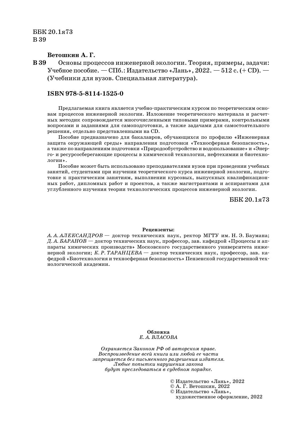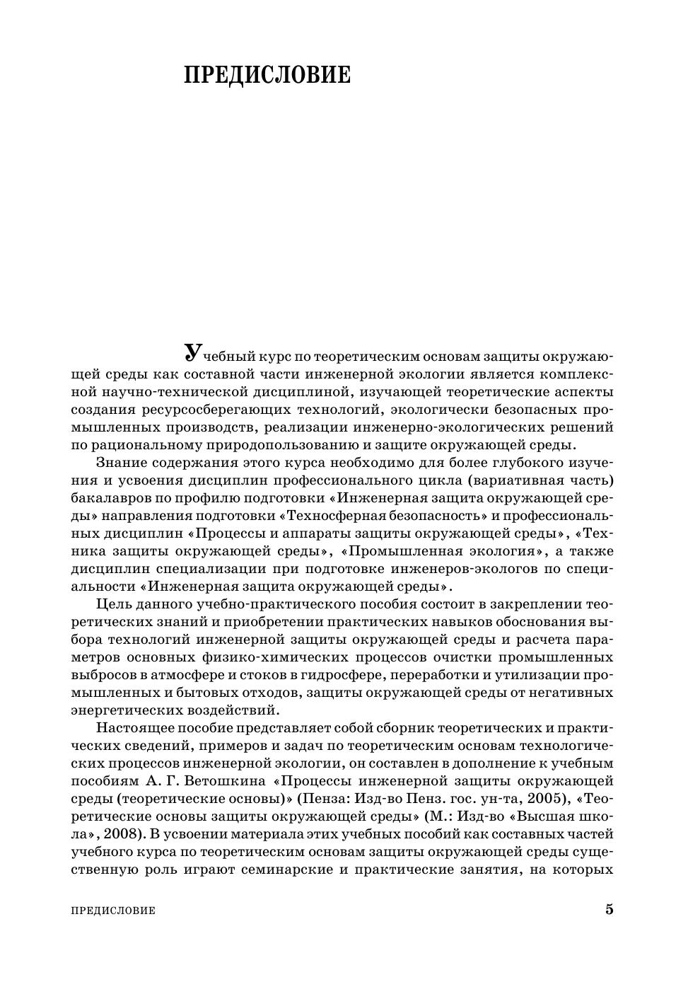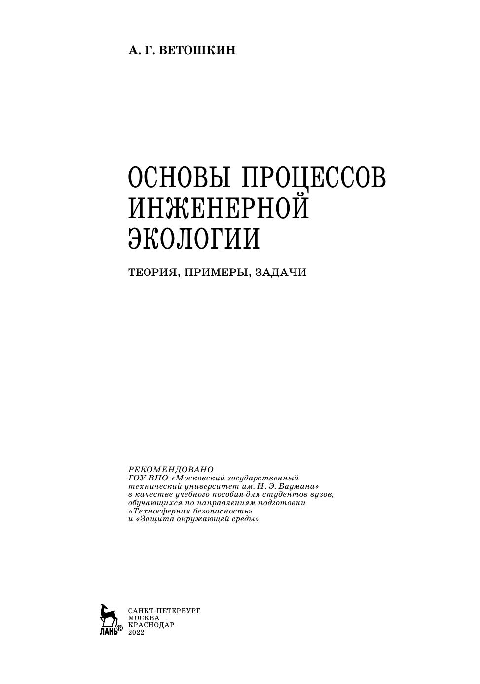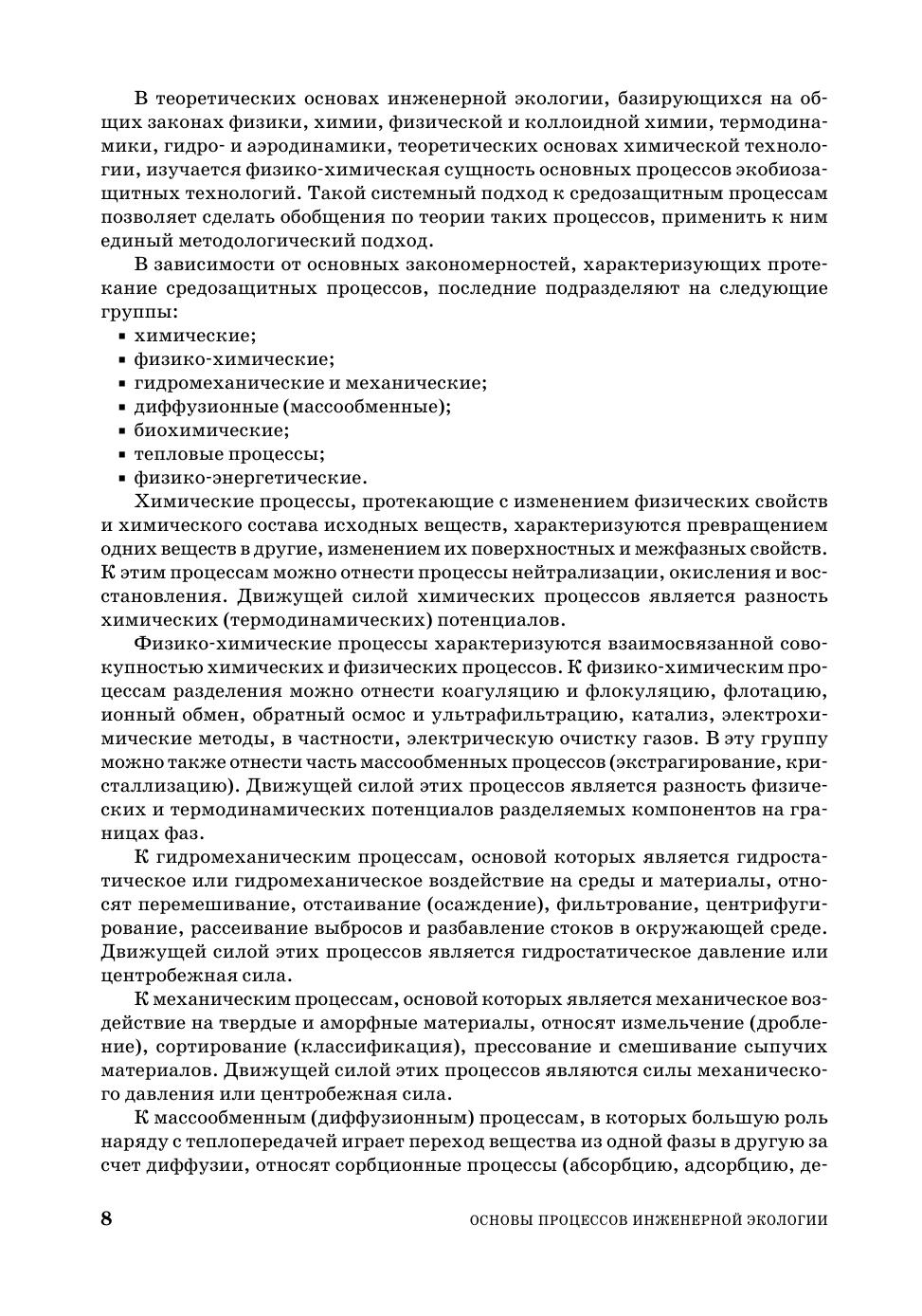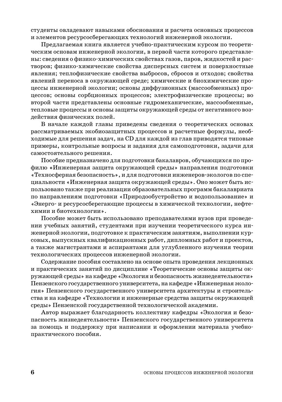 Предлагаемая книга является учебно-практическим курсом по теоретическим основам процессов инженерной экологии, в первой части которого представлены: сведения о физико-химических свойствах газов, паров, жидкостей и растворов, физико-химические свойства дисперсных систем и поверхностные явления, теплофизические свойства выбросов, сбросов и отходов, свойства явлений переноса в окружающей среде, химические и биохимические процессы инженерной экологии, основы диффузионных (массообменных) процессов, основы сорбционных процессов, электрофизические процессы, во второй части представлены основные гидромеханические, массообменные, тепловые процессы и основы защиты окружающей среды от негативного воздействия физических полей. Изложение теоретического материала и расчетных методик сопровождается многочисленными типовыми примерами, контрольными вопросами и заданиями для самоподготовки, а также задачами для самостоятельного решения, отдельно представленными на CD. Пособие предназначено для бакалавров, обучающихся по профилю «Инженерная защита окружающей среды» направления подготовки «Техносферная безопасность», и для подготовки инженеров-экологов по специальности «Инженерная защита окружающей среды». Оно может быть использовано также при реализации образовательных программ бакалавриата по направлениям подготовки «Природообустройство и водопользование» и «Энерго- и ресурсосберегающие процессы в химической технологии, нефтехимии и биотехнологии». Пособие может быть использовано преподавателями вузов при проведении учебных занятий, студентами при изучении теоретического курса инженерной экологии, подготовке к практическим занятиям, выполнении курсовых, выпускных квалификационных работ, дипломных работ и проектов, а также магистрантами и аспирантами для углубленного изучения теории технологических процессов инженерной экологии.