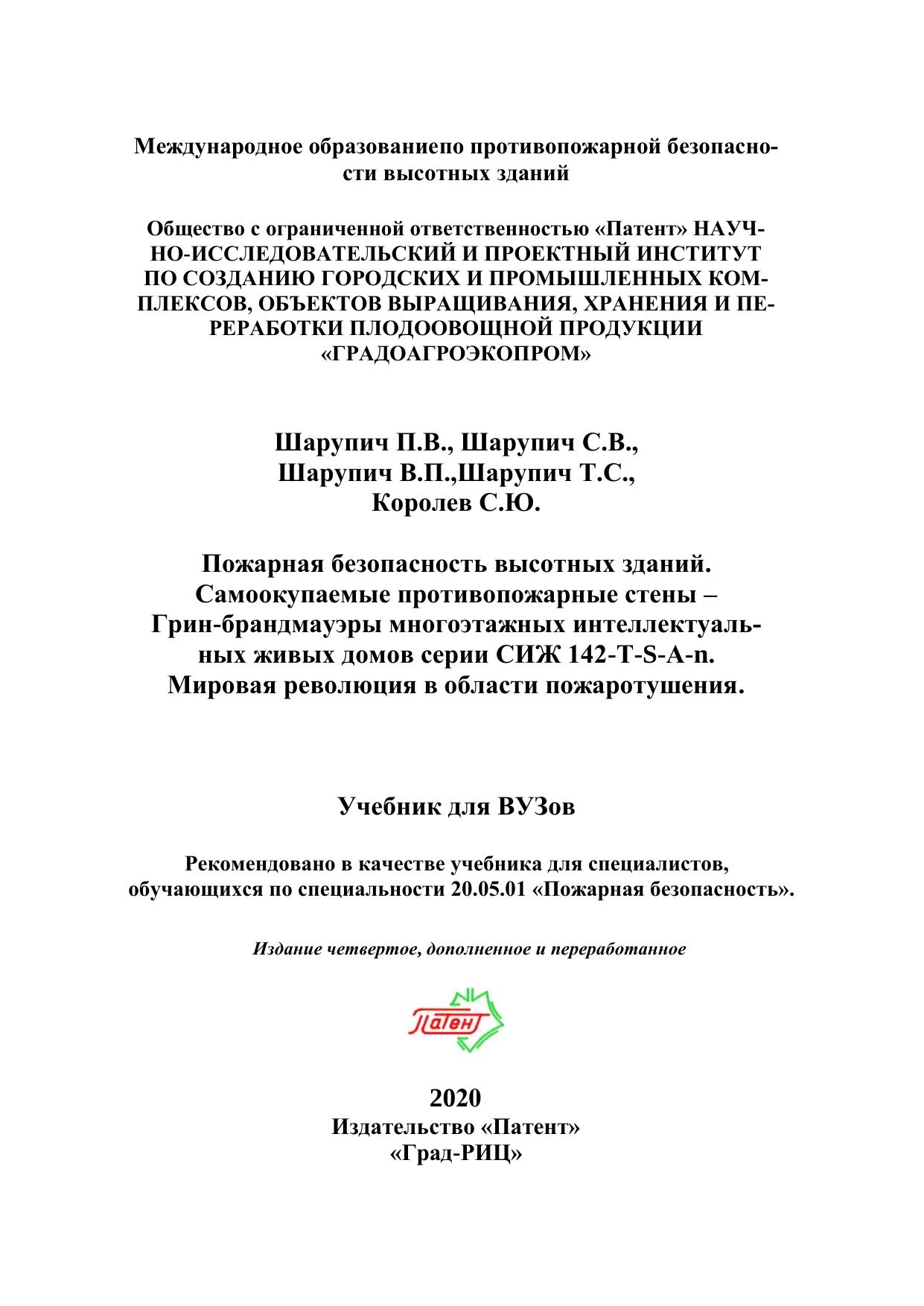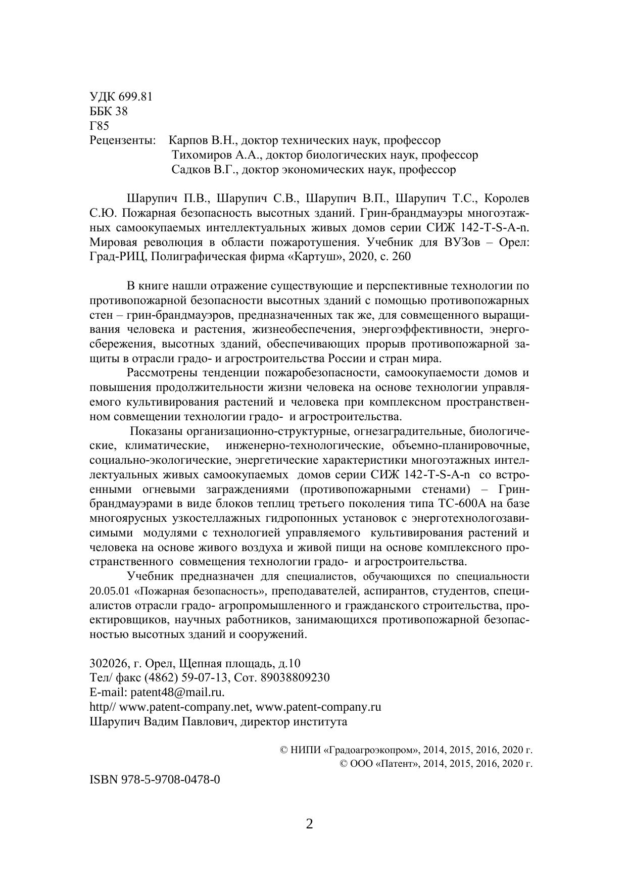 В книге нашли отражение существующие и перспективные технологии по противопожарной безопасности высотных зданий с помощью противопожарных стен – грин-брандмауэров, предназначенных так же, для совмещенного выращивания человека и растения, жизнеобеспечения, энергоэффективности, энергосбережения, высотных зданий, обеспечивающих прорыв противопожарной защиты в отрасли градо- и агростроительства России и стран мира. Рассмотрены тенденции пожаробезопасности, самоокупаемости домов и повышения продолжительности жизни человека на основе технологии управляемого культивирования растений и человека при комплексном пространственном совмещении технологии градо- и агростроительства. Показаны организационно-структурные, огнезаградительные, биологические, климатические, инженерно-технологические, объемно-планировочные, социально-экологические, энергетические характеристики многоэтажных интеллектуальных живых самоокупаемых домов серии СИЖ 142-Т-S-А-n со встроенными огневыми заграждениями (противопожарными стенами) – Гринбрандмауэрами в виде блоков теплиц третьего поколения типа ТС-600А на базе многоярусных узкостеллажных гидропонных установок с энерготехнологозависимыми модулями с технологией управляемого культивирования растений и человека на основе живого воздуха и живой пищи на основе комплексного пространственного совмещения технологии градо- и агростроительства. Учебник предназначен для специалистов, обучающихся по специальности 20.05.01 «Пожарная безопасность», преподавателей, аспирантов, студентов, специалистов отрасли градо- агропромышленного и гражданского строительства, проектировщиков, научных работников, занимающихся противопожарной безопасностью высотных зданий и сооружений.