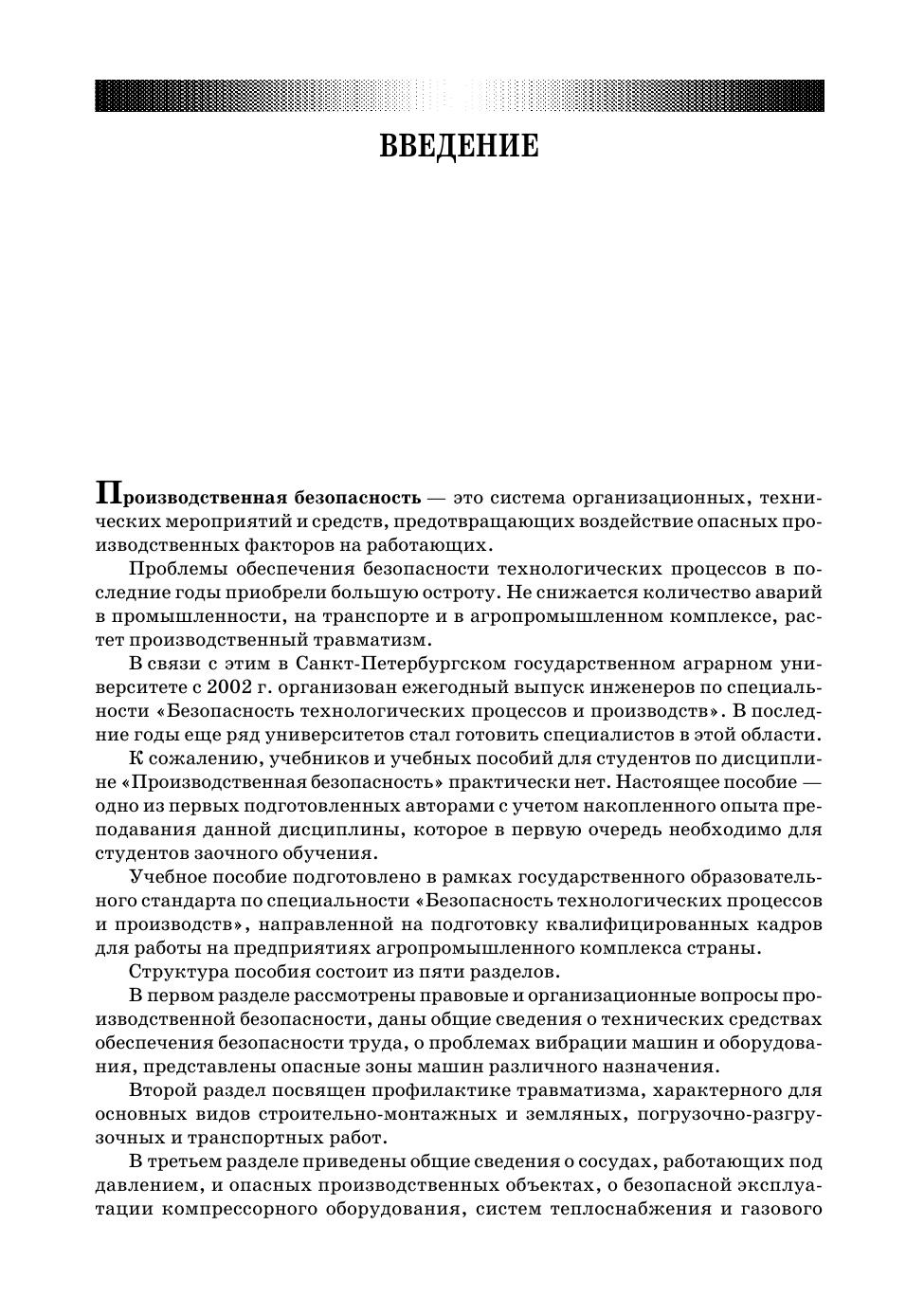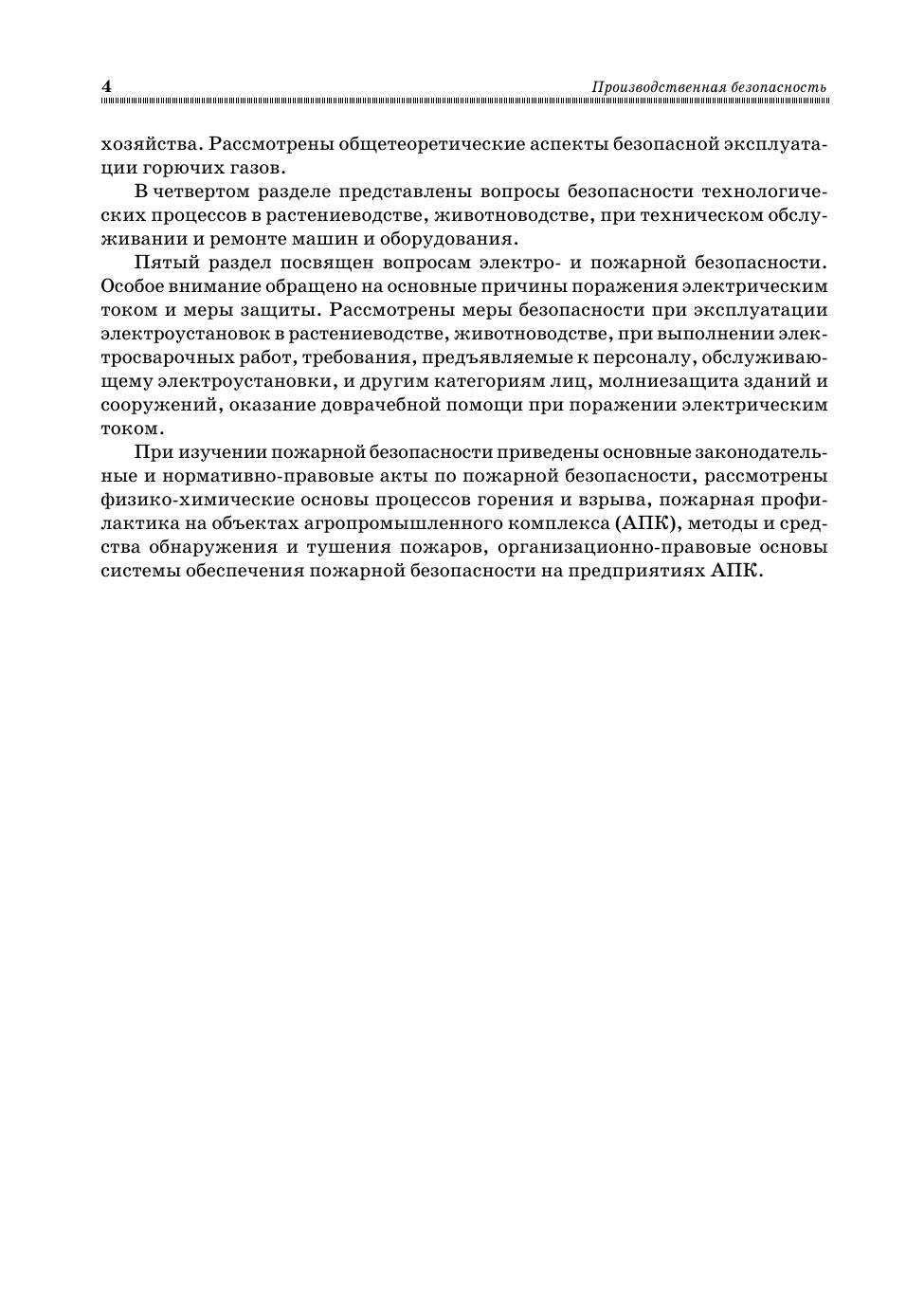 Учебное пособие соответствует содержанию федеральной дисциплины СД. Ф. 02 «Производственная безопасность» государственного образовательного стандарта. Содержит общетеоретические, правовые и организационные основы производственной безопасности, методы анализа и средств предупреждения производственного травматизма при выполнении работ в растениеводстве, животноводстве, на транспортных и погрузочно-разгрузочных работах, при техническом обслуживании и ремонте сельскохозяйственной техники, при эксплуатации сосудов высокого давления и систем газоснабжения и газопотребления. Рассмотрены основы электробезопасности и противопожарной безопасности. Предназначено для студентов высших учебных заведений, обучающихся по направлению подготовки «Техносферная безопасность» (бакалавриат и магистратура). Может быть полезным инженерно-техническим работника сельскохозяйственных предприятий.