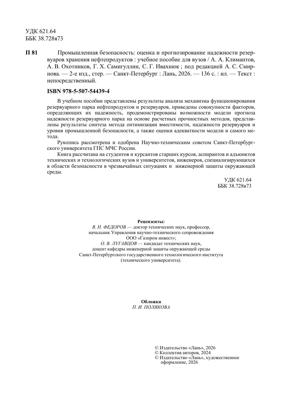 В учебном пособии представлены результаты анализа механизма функционирования резервуарного парка нефтепродуктов и резервуаров, приведены совокупности факторов, определяющих их надежность, продемонстрированы возможности модели прогноза надежности резервуарного парка на основе расчетных прочностных методов, представлены результаты синтеза метода оптимизации вместимости, надежности резервуаров и уровня промышленной безопасности, а также оценки адекватности модели и самого метода. Рукопись рассмотрена и одобрена научно-техническим советом Санкт-Петербургского университета ГПС МЧС России. Книга рассчитана на студентов и курсантов старших курсов, аспирантов и адъюнктов технических и технологических вузов и университетов, инженеров, специализирующихся в области безопасности в чрезвычайных ситуациях и инженерной защиты окружающей среды.