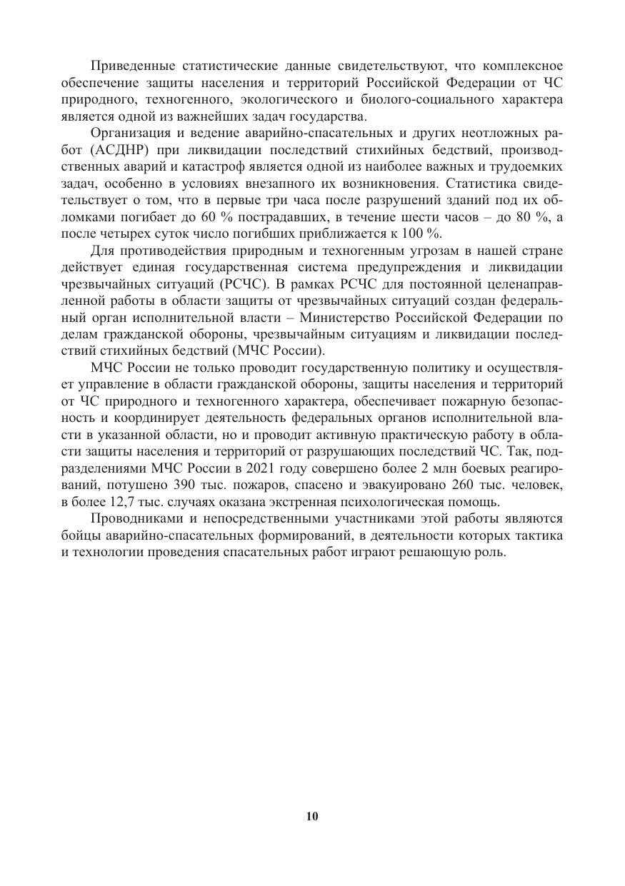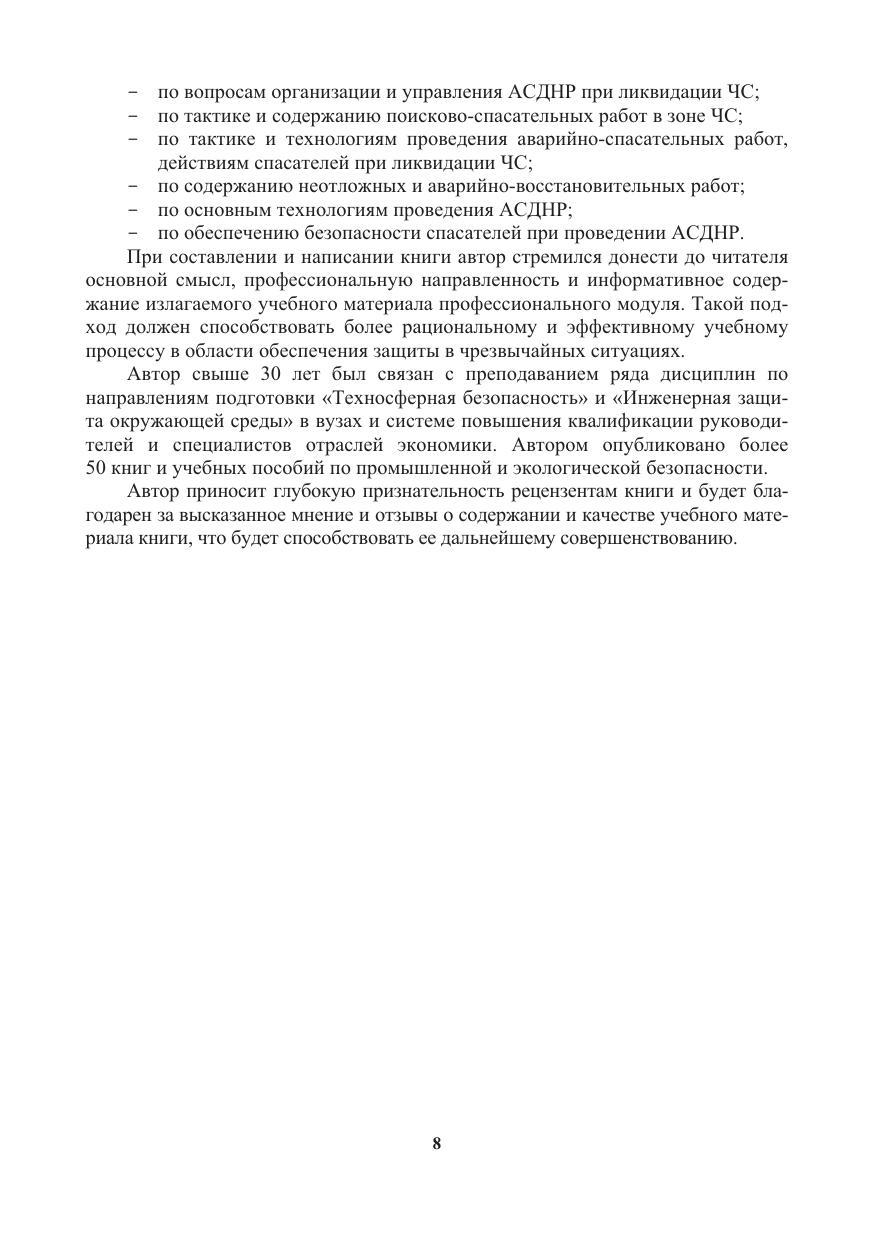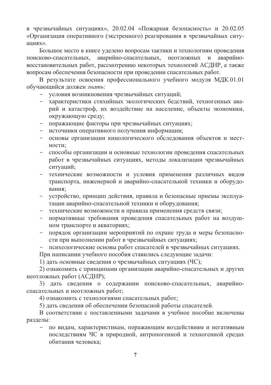 Содержится информация о видах и типах чрезвычайных ситуаций в природной и антропогенной средах, их источниках, признаках, характеристиках, поражающих факторах и их последствиях. Освещаются вопросы организации и управления аварийно-спасательных и других неотложных работ (АСДНР), тактики и проведения поисково-спасательных и аварийно-спасательных работ, проведения неотложных и аварийно-восстановительных работ, даются описания технологий АСДНР и обеспечения безопасности при проведении АСДНР. Содержит приложения в электронном виде.