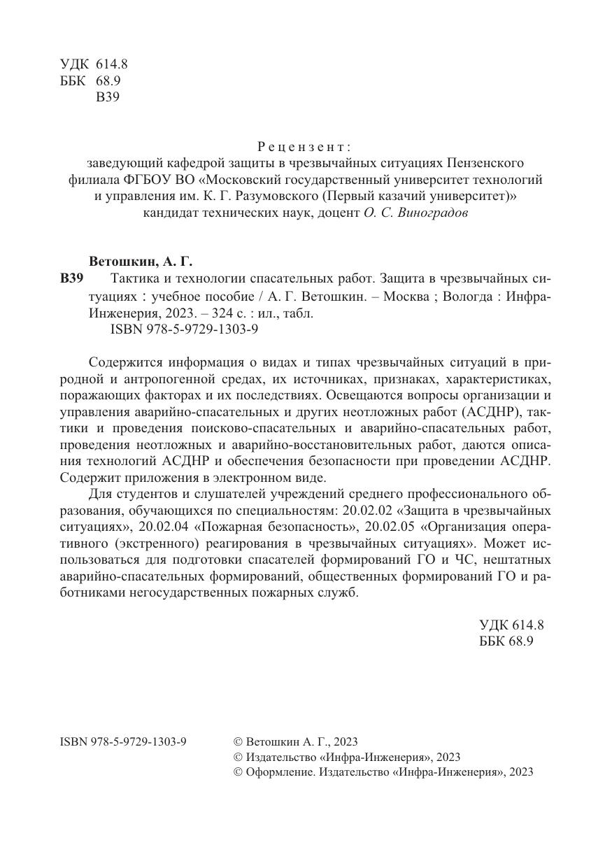 Для студентов и слушателей учреждений среднего профессионального образования, обучающихся по специальностям: 20.02.02 «Защита в чрезвычайных ситуациях», 20.02.04 «Пожарная безопасность», 20.02.05 «Организация оперативного (экстренного) реагирования в чрезвычайных ситуациях». Может использоваться для подготовки спасателей формирований ГО и ЧС, нештатных аварийно-спасательных формирований, общественных формирований ГО и работниками негосударственных пожарных служб