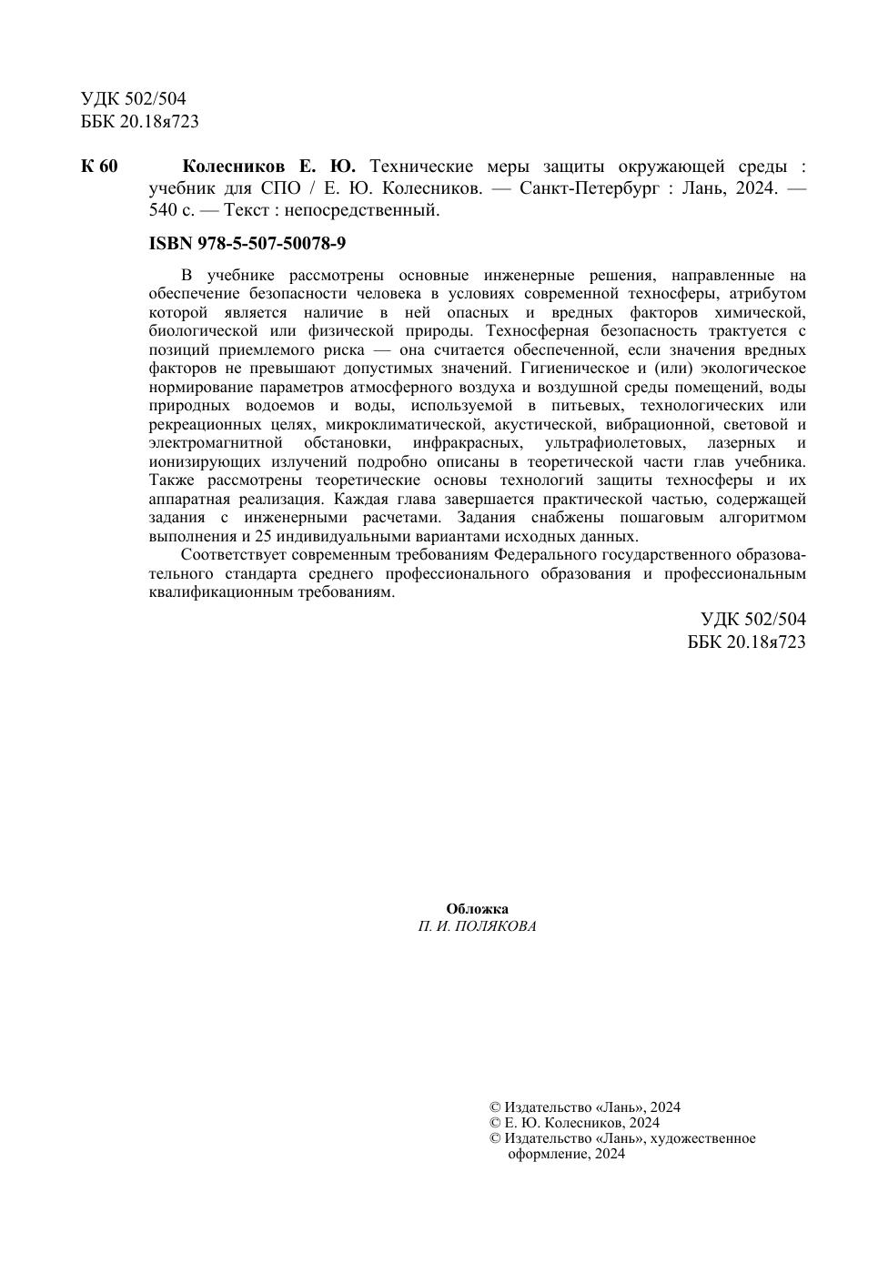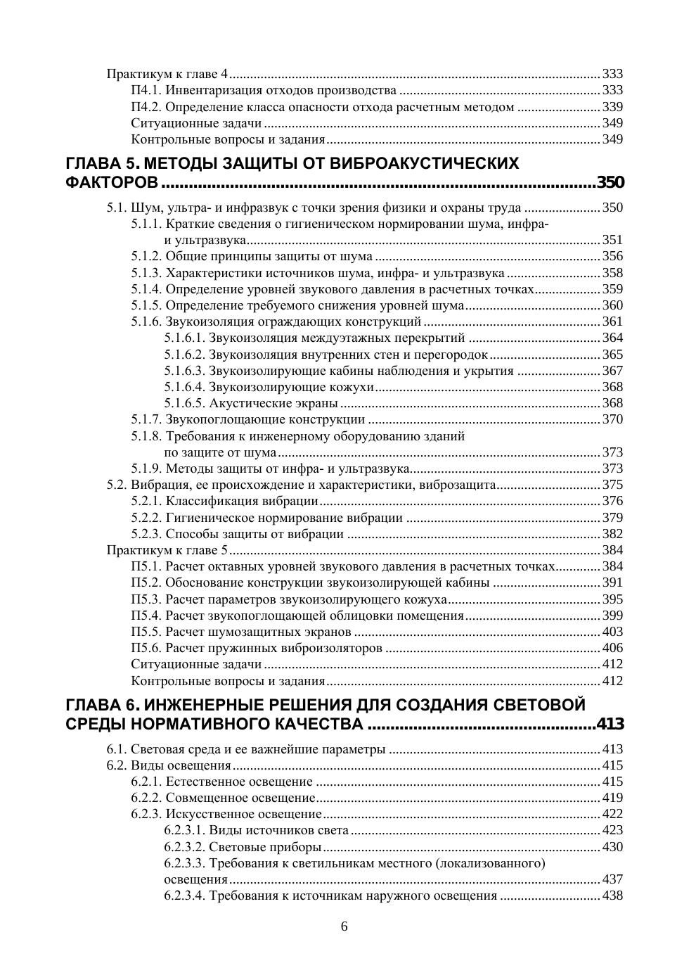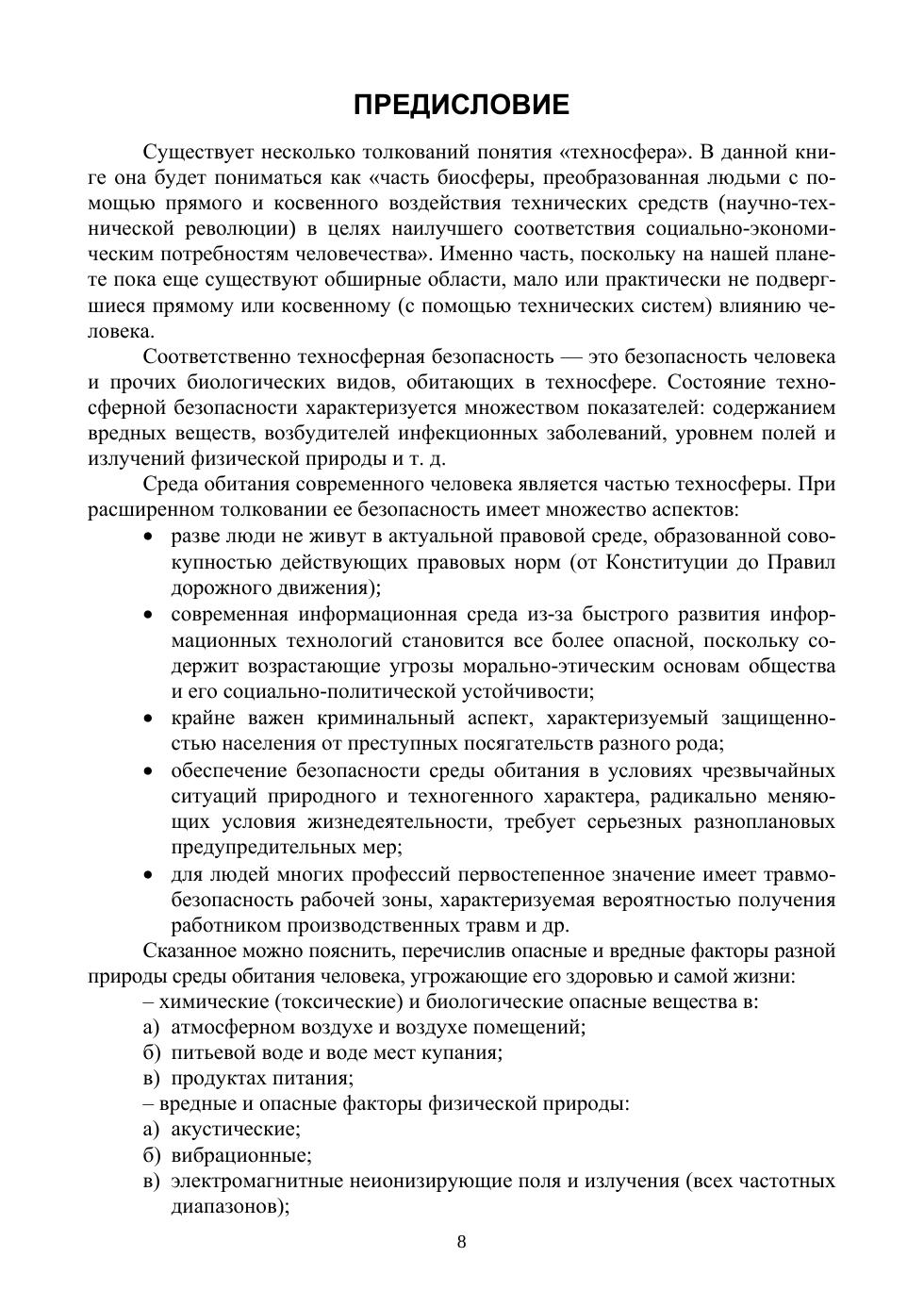В учебнике рассмотрены основные инженерные решения, направленные на обеспечение безопасности человека в условиях современной техносферы, атрибутом которой является наличие в ней опасных и вредных факторов химической, биологической или физической природы. Техносферная безопасность трактуется с позиций приемлемого риска — она считается обеспеченной, если значения вредных факторов не превышают допустимых значений. Гигиеническое и (или) экологическое нормирование параметров атмосферного воздуха и воздушной среды помещений, воды природных водоемов и воды, используемой в питьевых, технологических или рекреационных целях, микроклиматической, акустической, вибрационной, световой и электромагнитной обстановки, инфракрасных, ультрафиолетовых, лазерных и ионизирующих излучений подробно описаны в теоретической части глав учебника. Также рассмотрены теоретические основы технологий защиты техносферы и их аппаратная реализация. Каждая глава завершается практической частью, содержащей задания с инженерными расчетами. Задания снабжены пошаговым алгоритмом выполнения и 25 индивидуальными вариантами исходных данных. Соответствует современным требованиям Федерального государственного образовательного стандарта среднего профессионального образования и профессиональным квалификационным требованиям.