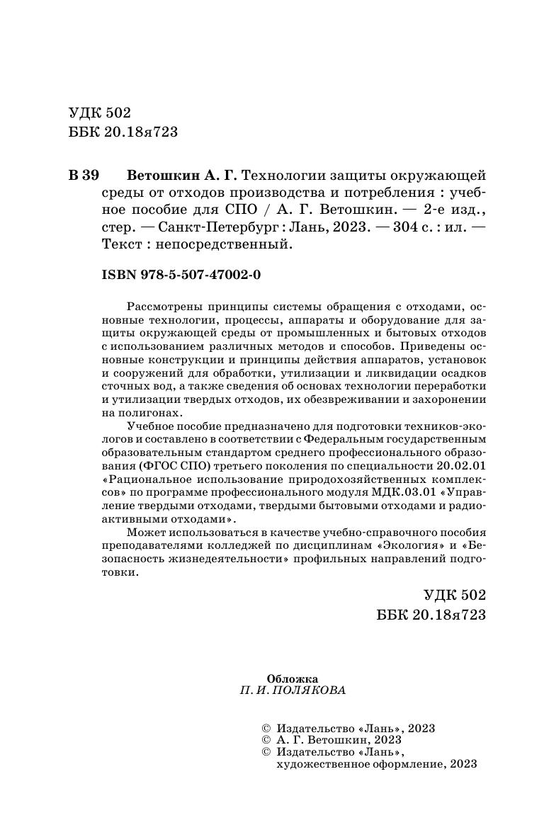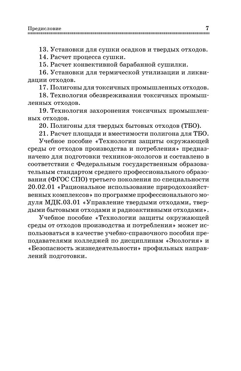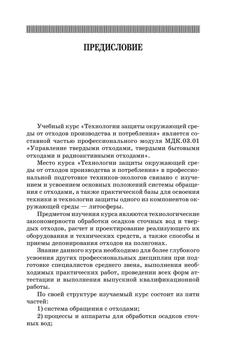 Рассмотрены принципы системы обращения с отходами, основные технологии, процессы, аппараты и оборудование для защиты окружающей среды от промышленных и бытовых отходов с использованием различных методов и способов. Приведены основные конструкции и принципы действия аппаратов, установок и сооружений для обработки, утилизации и ликвидации осадков сточных вод, а также сведения об основах технологии переработки и утилизации твердых отходов, их обезвреживании и захоронении на полигонах. Учебное пособие предназначено для подготовки техников-экологов и составлено в соответствии с Федеральным государственным образовательным стандартом среднего профессионального образования (ФГОС СПО) третьего поколения по специальности 20.02.01 «Рациональное использование природохозяйственных комплексов» по программе профессионального модуля МДК.03.01 «Управление твердыми отходами, твердыми бытовыми отходами и радиоактивными отходами». Может использоваться в качестве учебно-справочного пособия преподавателями колледжей по дисциплинам «Экология» и «Безопасность жизнедеятельности» профильных направлений подготовки.