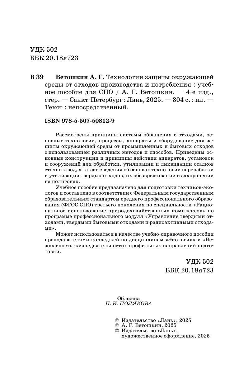 Рассмотрены принципы системы обращения с отходами, основные технологии, процессы, аппараты и оборудование для защиты окружающей среды от промышленных и бытовых отходов с использованием различных методов и способов. Приведены основные конструкции и принципы действия аппаратов, установок и сооружений для обработки, утилизации и ликвидации осадков сточных вод, а также сведения об основах технологии переработки и утилизации твердых отходов, их обезвреживании и захоронении на полигонах. Учебное пособие предназначено для подготовки техников-экологов и составлено в соответствии с Федеральным государственным образовательным стандартом среднего профессионального образования (ФГОС СПО) третьего поколения по специальности «Рациональное использование природохозяйственных комплексов» по программе профессионального модуля МДК.03.01 «Управление твердыми отходами, твердыми бытовыми отходами и радиоактивными отходами». Может использоваться в качестве учебно-справочного пособия преподавателями колледжей по дисциплинам «Экология» и «Безопасность жизнедеятельности» профильных направлений подготовки.