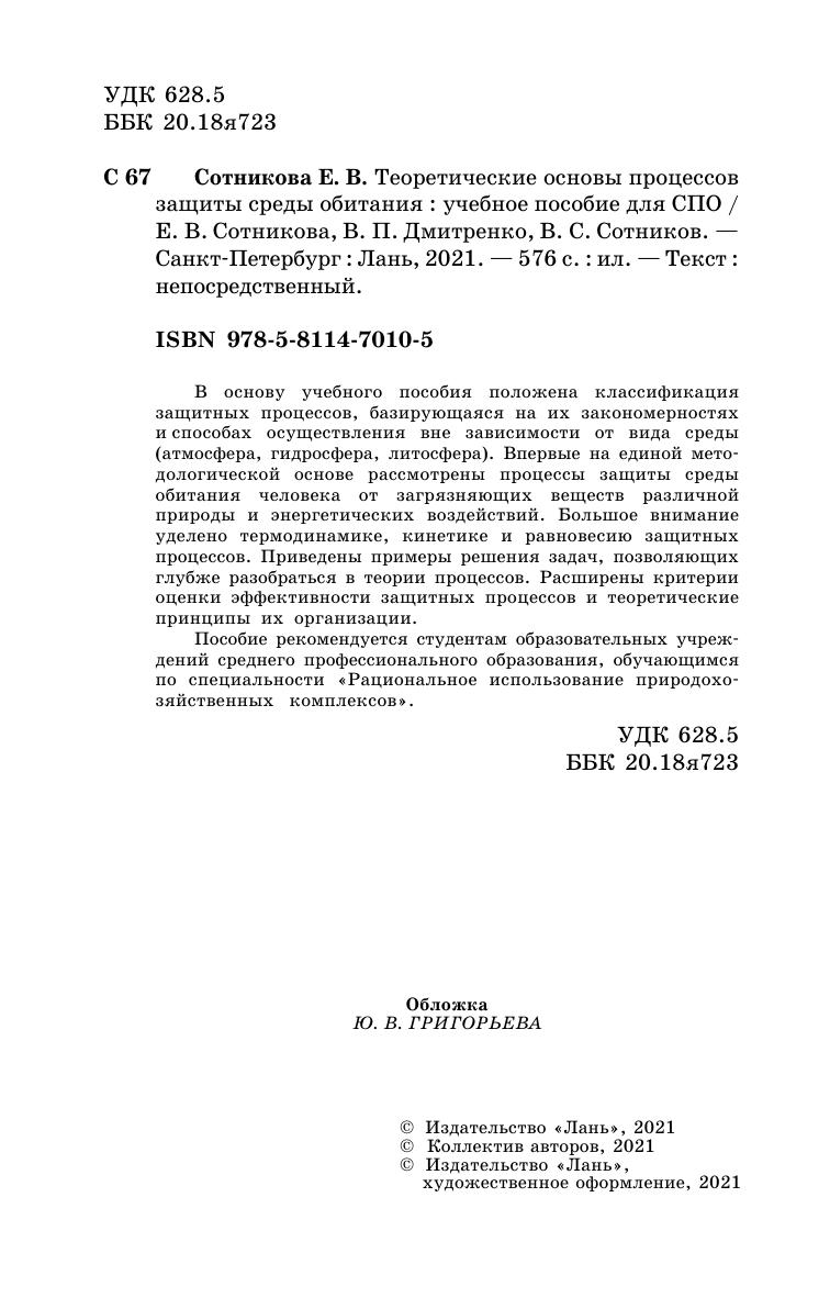 В основу учебного пособия положена классификация защитных процессов, базирующаяся на их закономерностях и способах осуществления вне зависимости от вида среды (атмосфера, гидросфера, литосфера). Впервые на единой методологической основе рассмотрены процессы защиты среды обитания человека от загрязняющих веществ различной природы и энергетических воздействий. Большое внимание уделено термодинамике, кинетике и равновесию защитных процессов. Приведены примеры решения задач, позволяющих глубже разобраться в теории процессов. Расширены критерии оценки эффективности защитных процессов и теоретические принципы их организации.