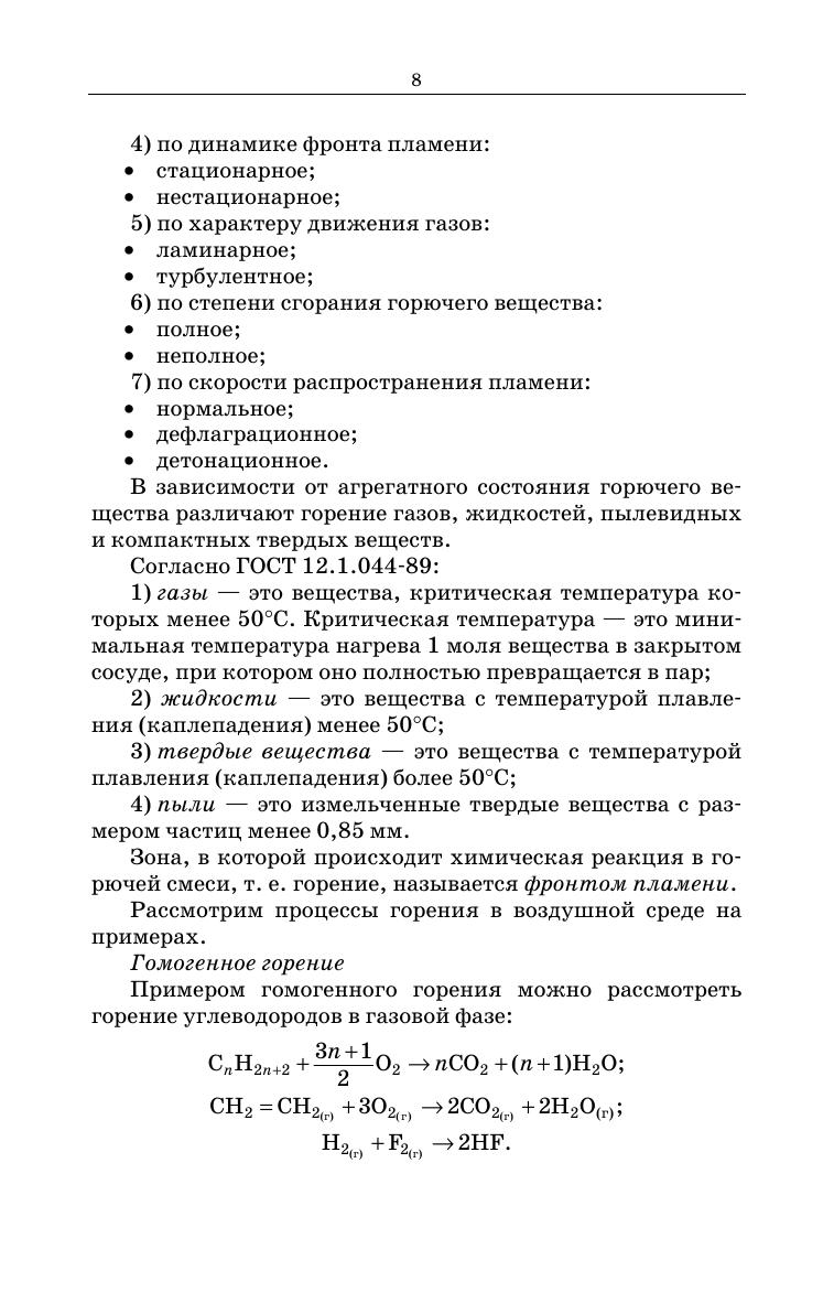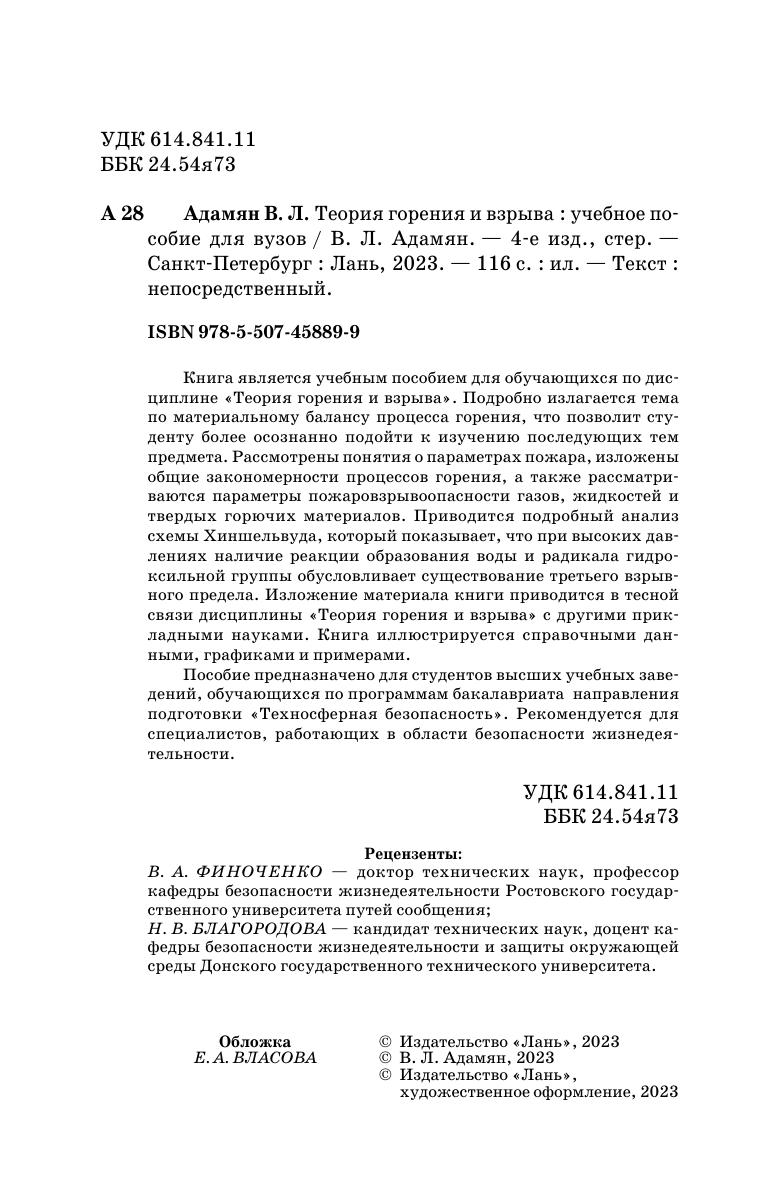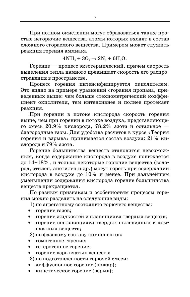 Книга является учебным пособием для обучающихся по дисциплине «Теория горения и взрыва». Подробно излагается тема по материальному балансу процесса горения, что позволит студенту более осознанно подойти к изучению последующих тем предмета. Рассмотрены понятия о параметрах пожара, изложены общие закономерности процессов горения, а также рассматриваются параметры пожаровзрывоопасности газов, жидкостей и твердых горючих материалов. Приводится подробный анализ схемы Хиншельвуда, который показывает, что при высоких давлениях наличие реакции образования воды и радикала гидроксильной группы обусловливает существование третьего взрывного предела. Изложение материала книги приводится в тесной связи дисциплины «Теория горения и взрыва» с другими прикладными науками. Книга иллюстрируется справочными данными, графиками и примерами.Пособие предназначено для студентов высших учебных заведений, обучающихся по программам бакалавриата направления подготовки «Техносферная безопасность». Рекомендуется для специалистов, работающих в области безопасности жизнедеятельности.