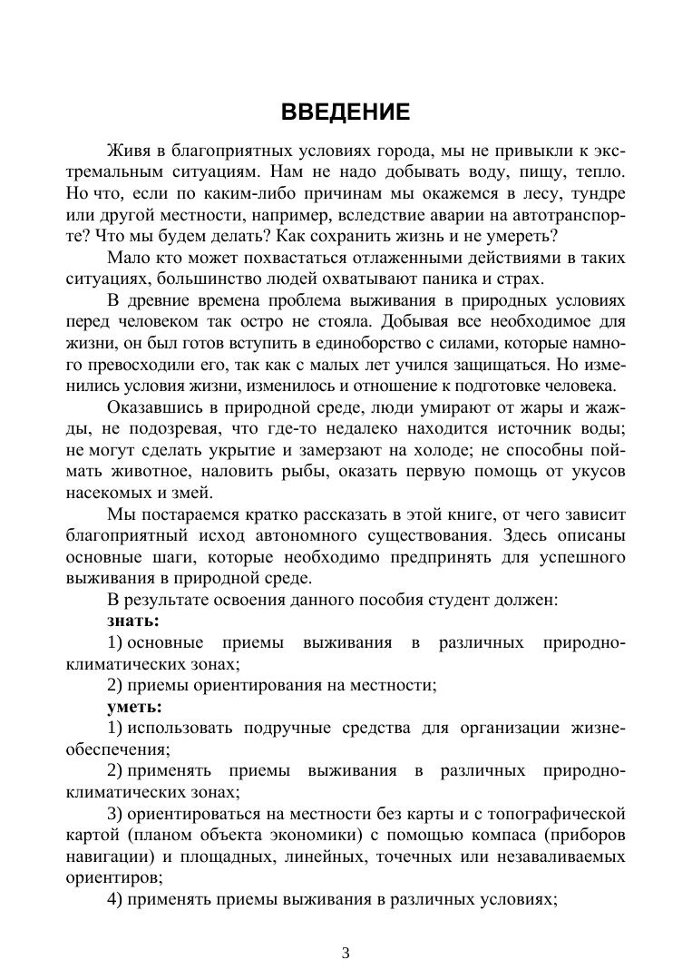В книге представлены вопросы безопасного поведения в условиях автономного существования. Даны рекомендации по построению временного укрытия, разведению костра, добыче воды, ориентированию на местности, уделено внимание первой доврачебной помощи. Соответствует современным требованиям ФГОС СПО и профессиональным квалификационным требованиям. Книга предназначена для студентов средних специальных учебных заведений, а также будет полезна туристам и широкому кругу читателей.