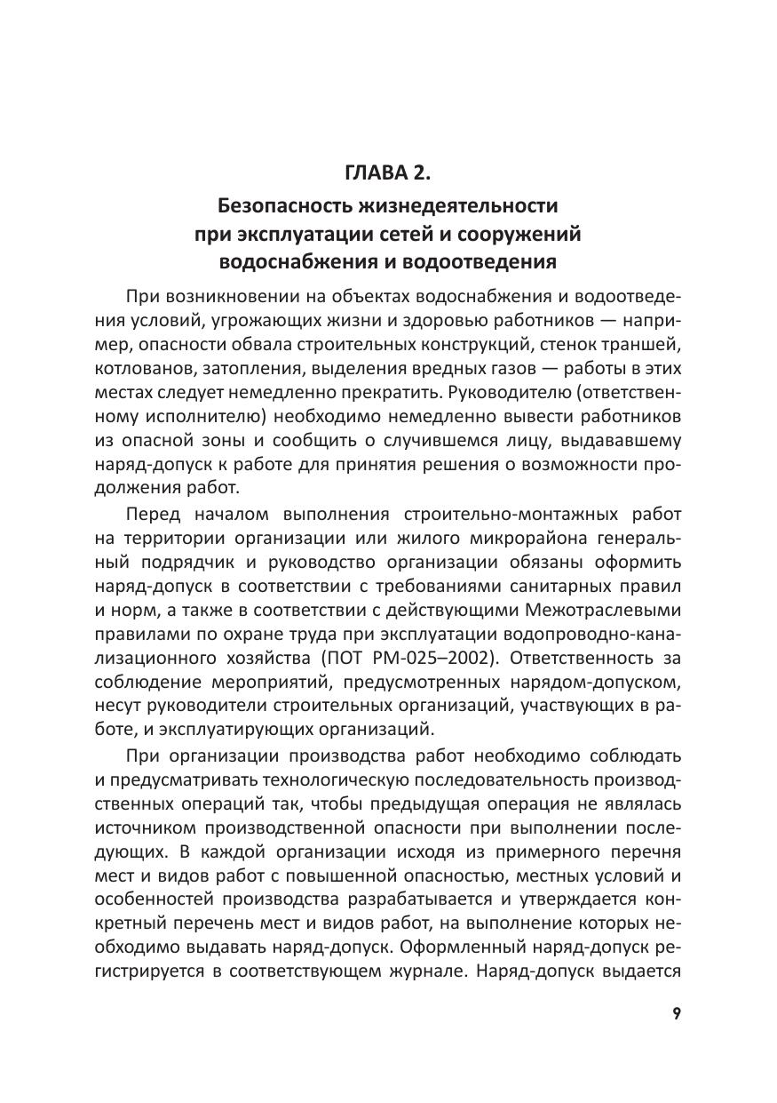 Рассмотрены вопросы проектирования, строительства и безопасной эксплуатации сооружений на сетях водоснабжения и водоотведения. Раскрыты алгоритмы действий при работе в колодце на дороге, при работе крана по укладке труб в траншею, показаны требования к креплениям стенок траншеи Освещены требования к безопасности при эксплуатации водопроводных колодцев, камер и резервуаров, водозаборных сооружений, насосных станций, сооружений по очистке осадка сточных вод, охлаждающих систем оборотного водоснабжения и систем обеззараживания воды.