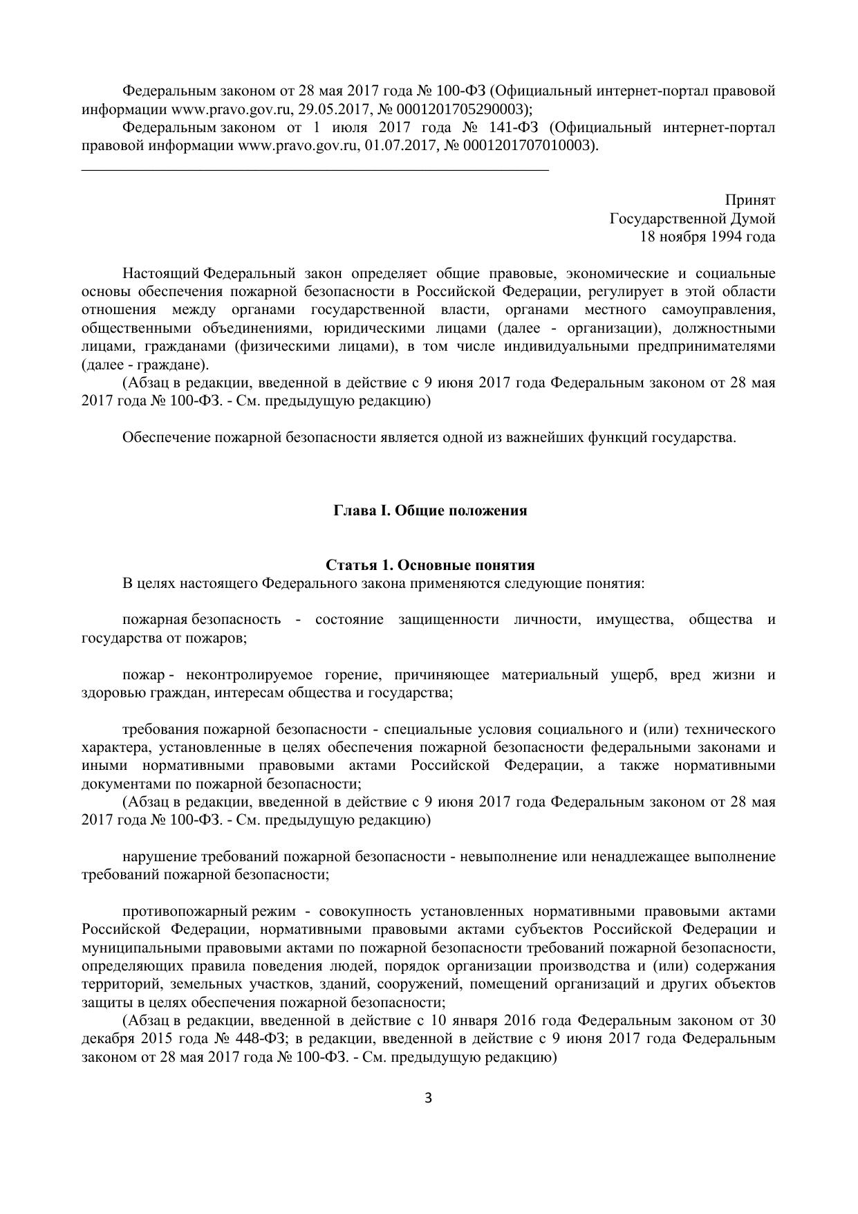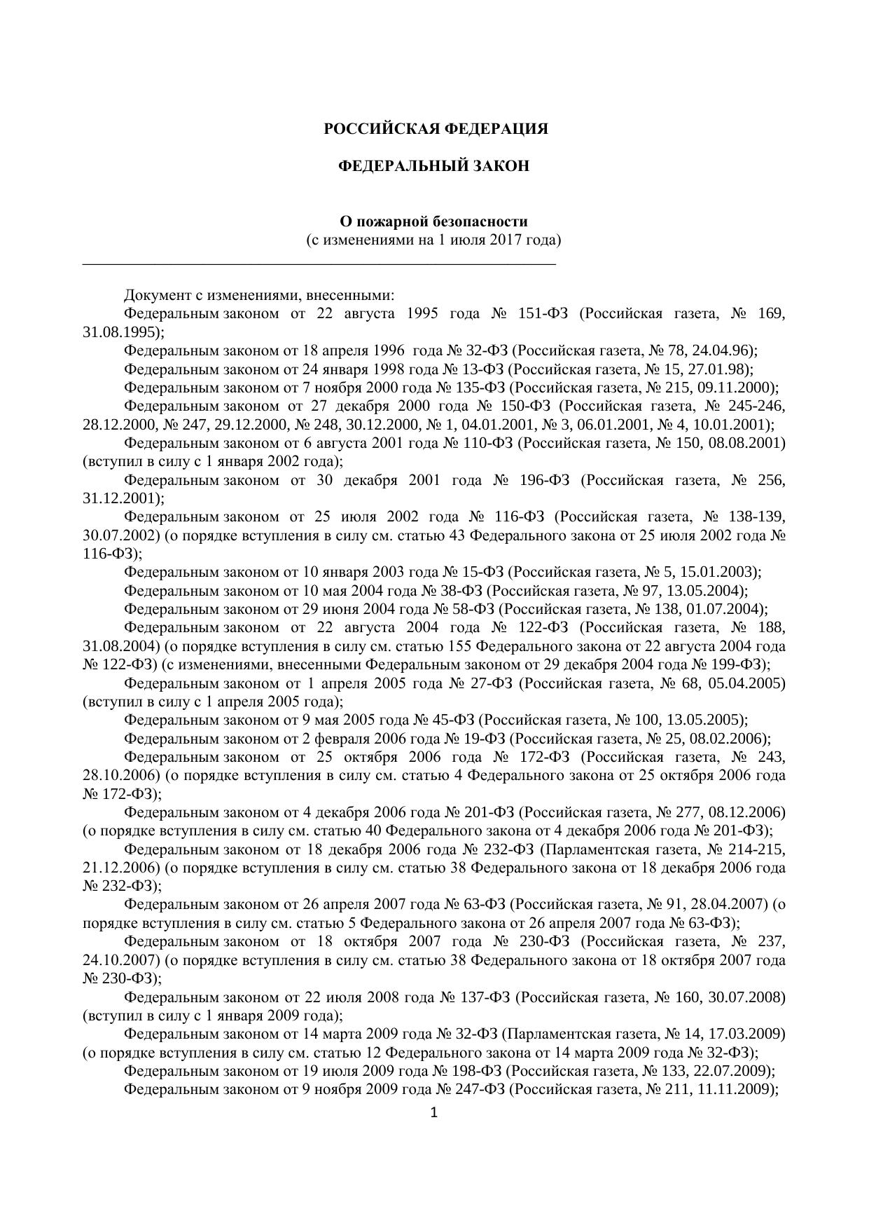 Федеральный закон о пожарной безопасности от 21 декабря 1994 года №69-ФЗ (с изменениями на 1 июля 2017 года)