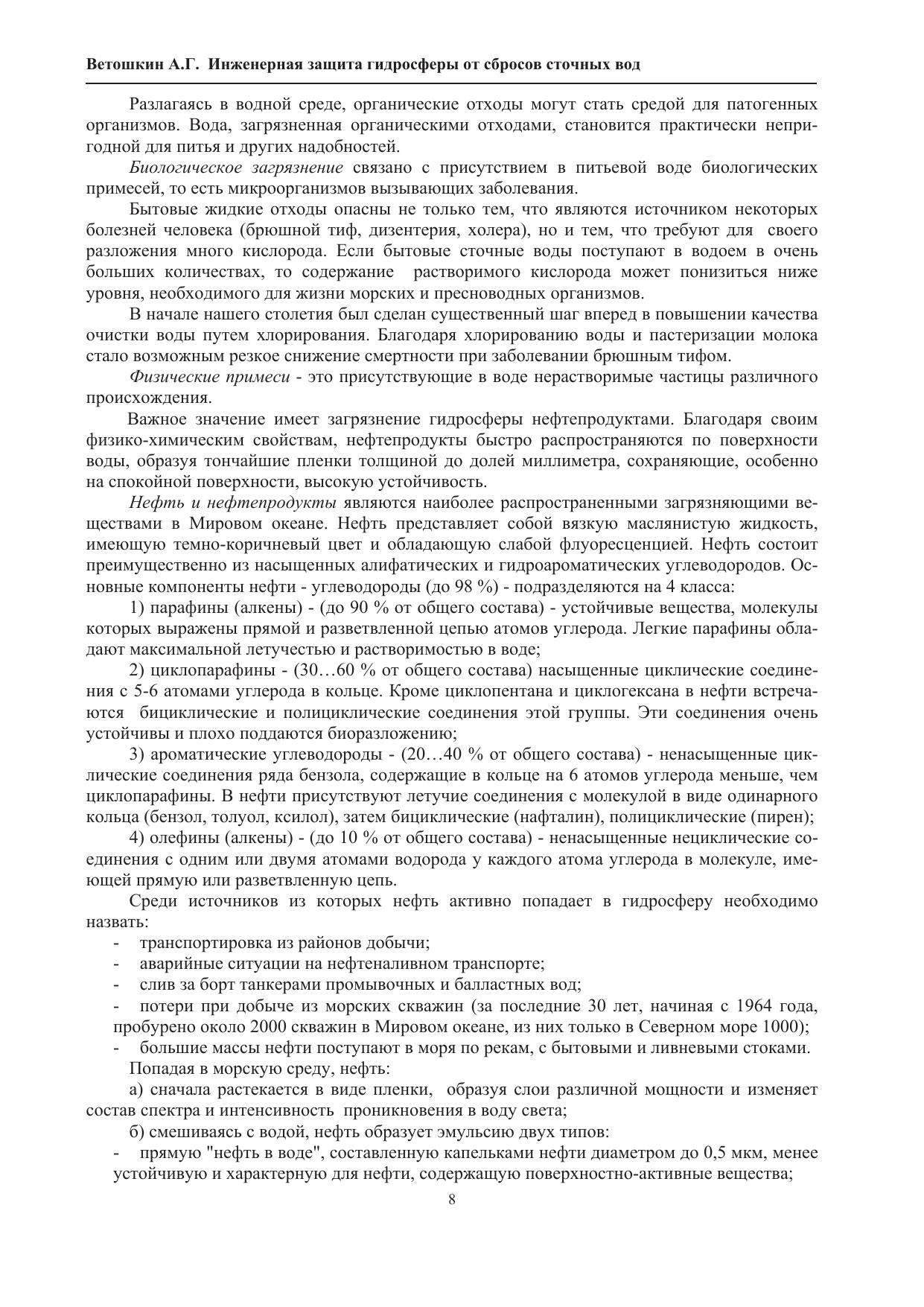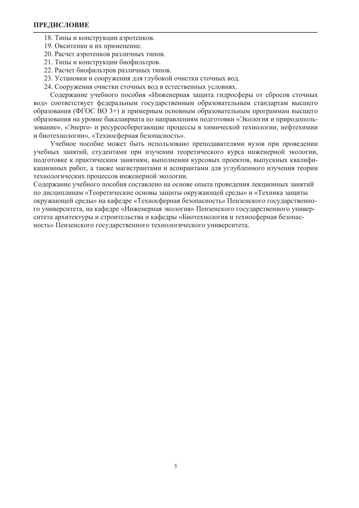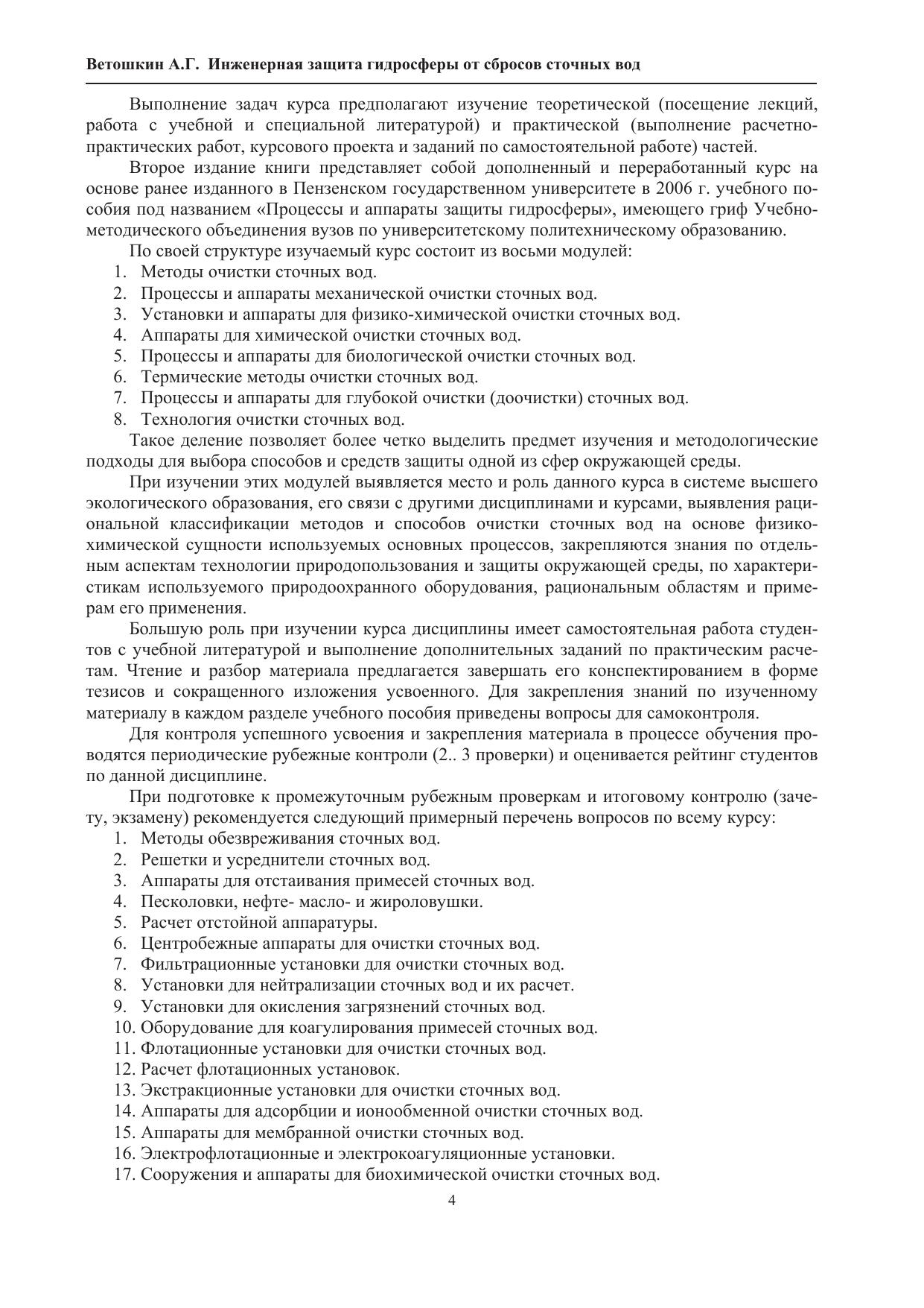 Рассмотрены основы процессов и аппаратов технологии и оборудования для защиты гидросферы от жидкостных сбросов с использованием различных методов и способов: механических, химических, физико-химических, биологических. Приведены основные конструкции аппаратов, установок и сооружений для очистки сточных вод от взвешенных и растворенных примесей. Даны методики расчета применяемых в очистке сточных вод аппаратов, основных технологических и конструктивных параметров отстойников, фильтров, флотаторов, адсорберов, электролизеров, экстракторов, ректификационных установок, аэротенков и биофильтров.