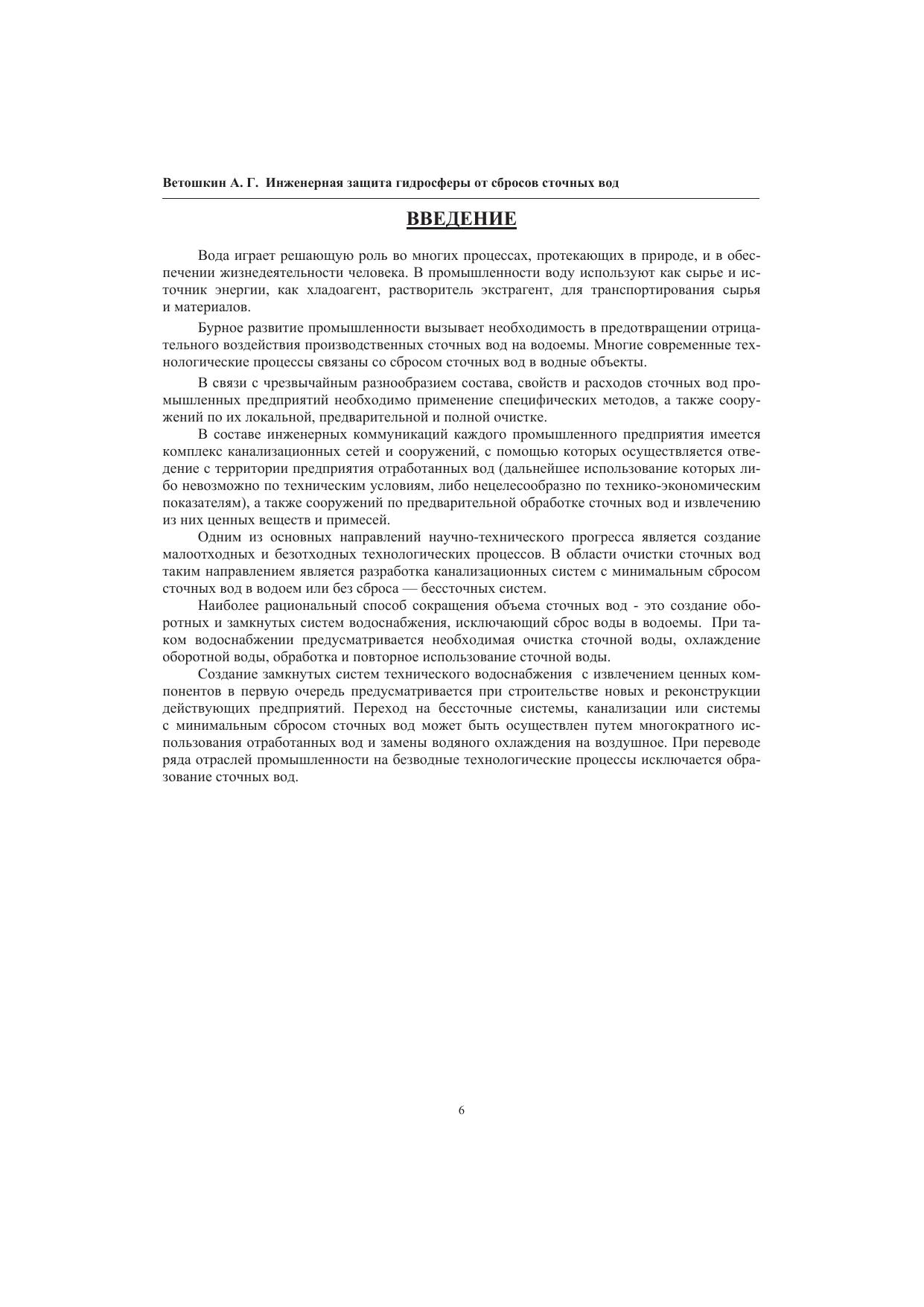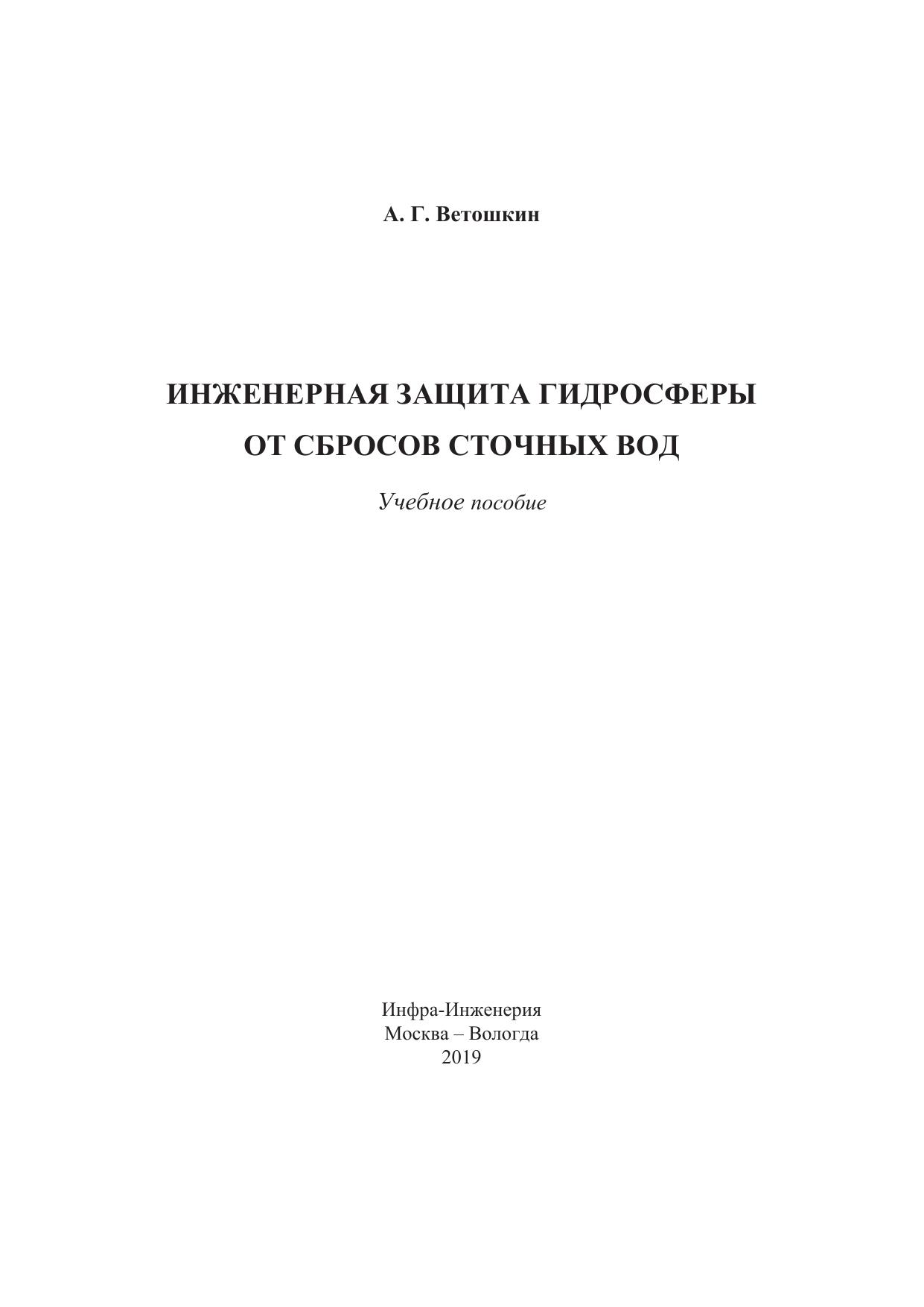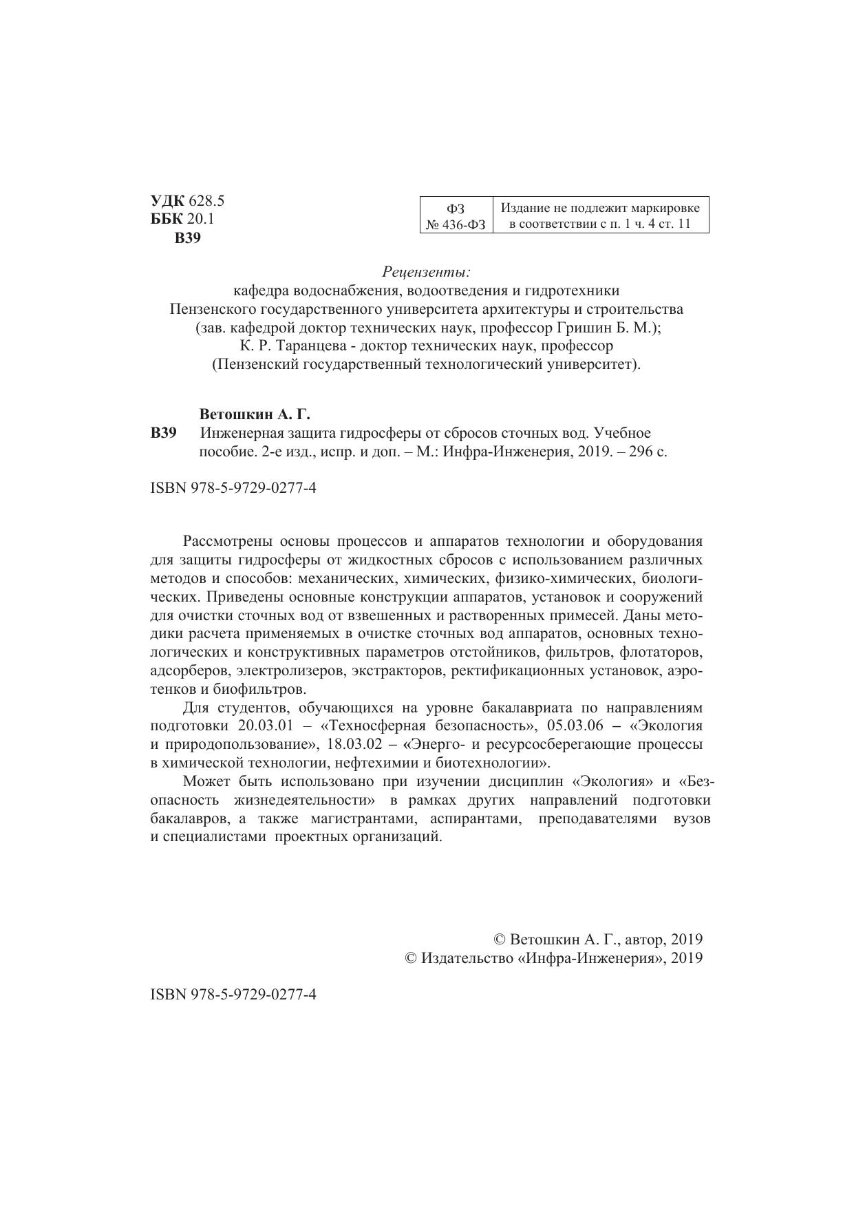 Рассмотрены основы процессов и аппаратов технологии и оборудования для защиты гидросферы от жидкостных сбросов с использованием различных методов и способов: механических, химических, физико-химических, биологических. Приведены основные конструкции аппаратов, установок и сооружений для очистки сточных вод от взвешенных и растворенных примесей. Даны методики расчета применяемых в очистке сточных вод аппаратов, основных технологических и конструктивных параметров отстойников, фильтров, флотаторов, адсорберов, электролизеров, экстракторов, ректификационных установок, аэротенков и биофильтров.