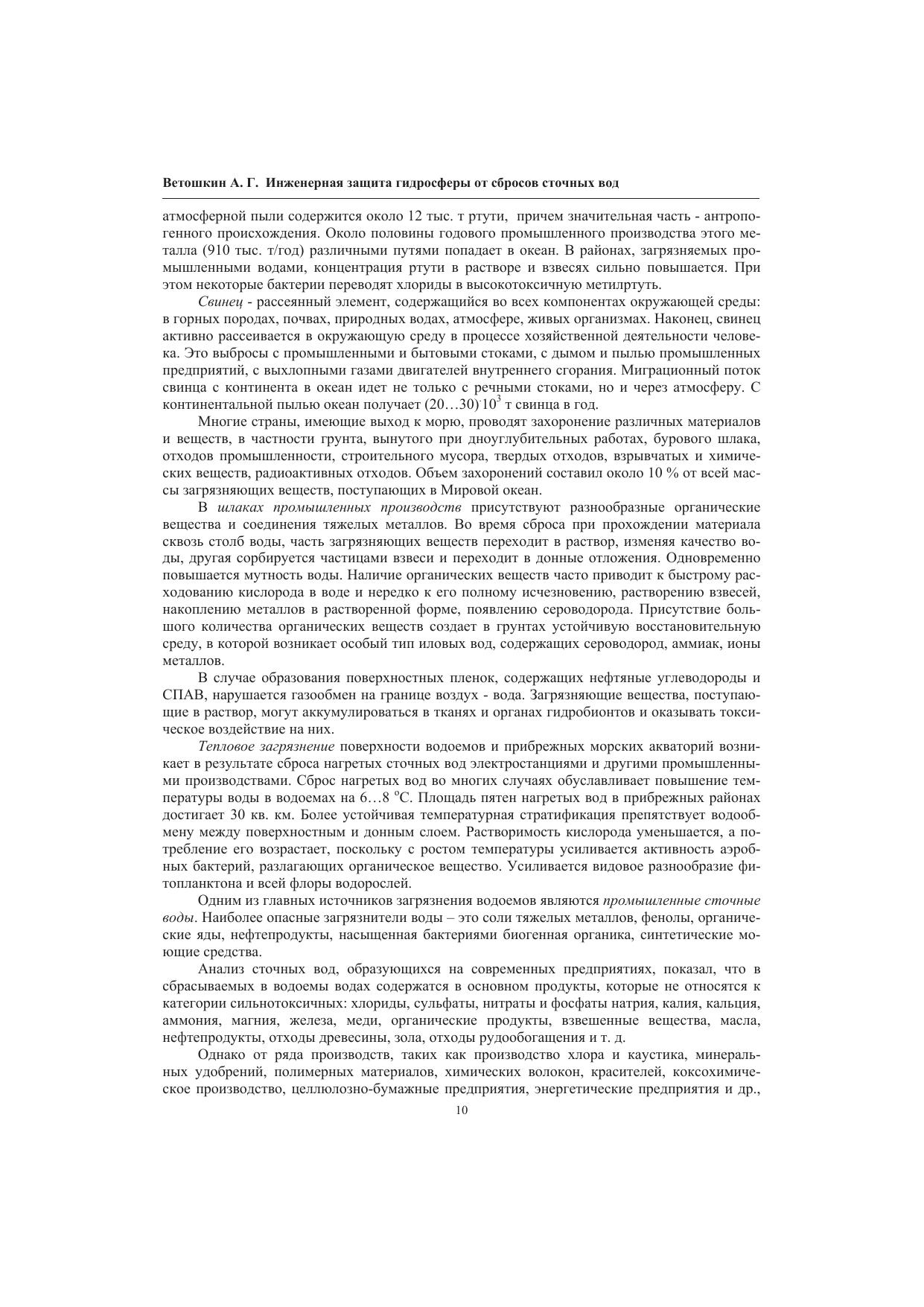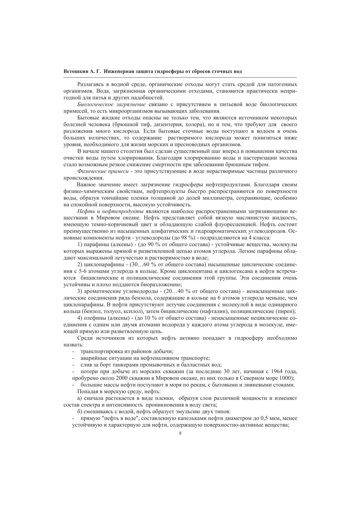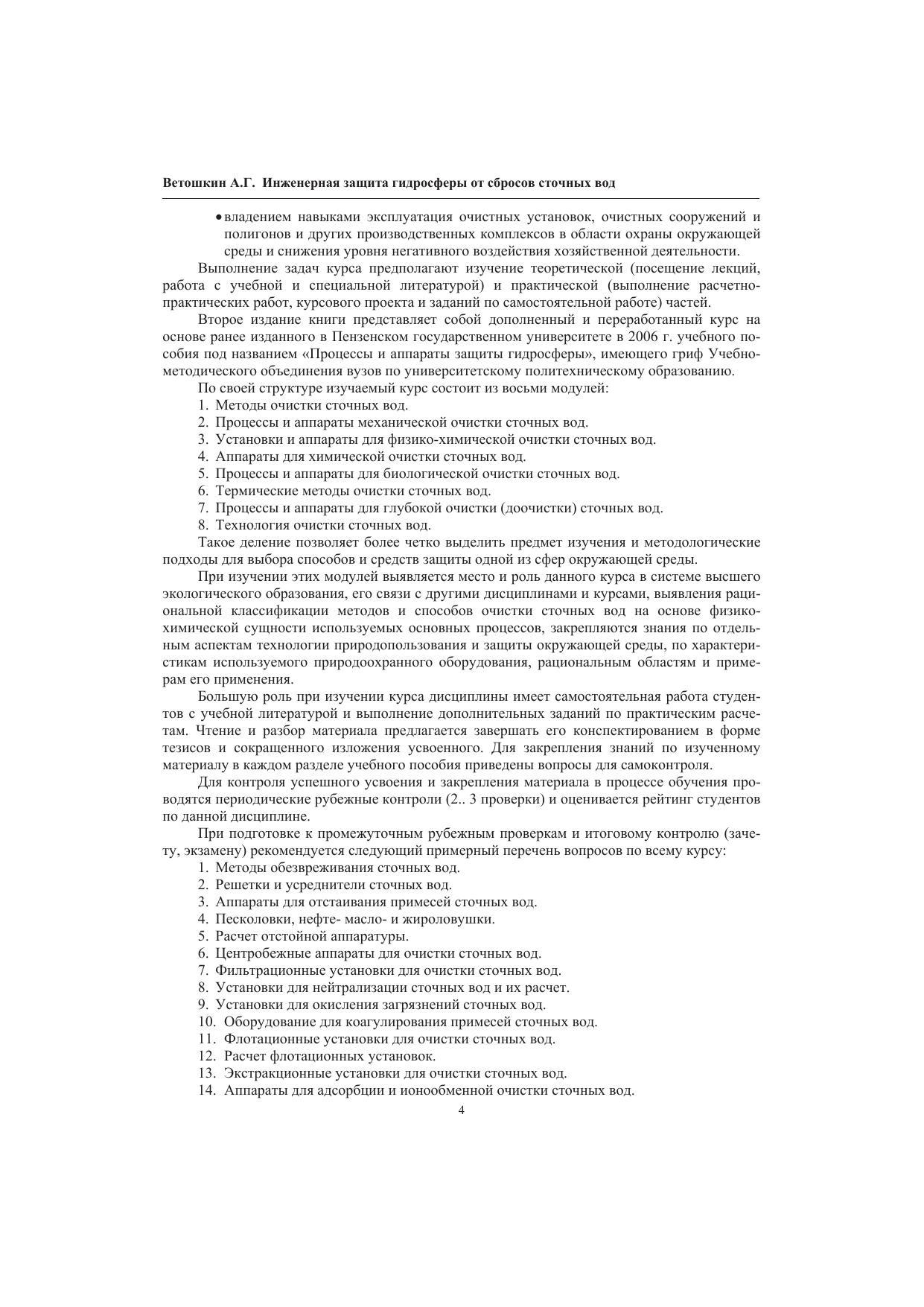 Рассмотрены основы процессов и аппаратов технологии и оборудования для защиты гидросферы от жидкостных сбросов с использованием различных методов и способов: механических, химических, физико-химических, биологических. Приведены основные конструкции аппаратов, установок и сооружений для очистки сточных вод от взвешенных и растворенных примесей. Даны методики расчета применяемых в очистке сточных вод аппаратов, основных технологических и конструктивных параметров отстойников, фильтров, флотаторов, адсорберов, электролизеров, экстракторов, ректификационных установок, аэротенков и биофильтров.