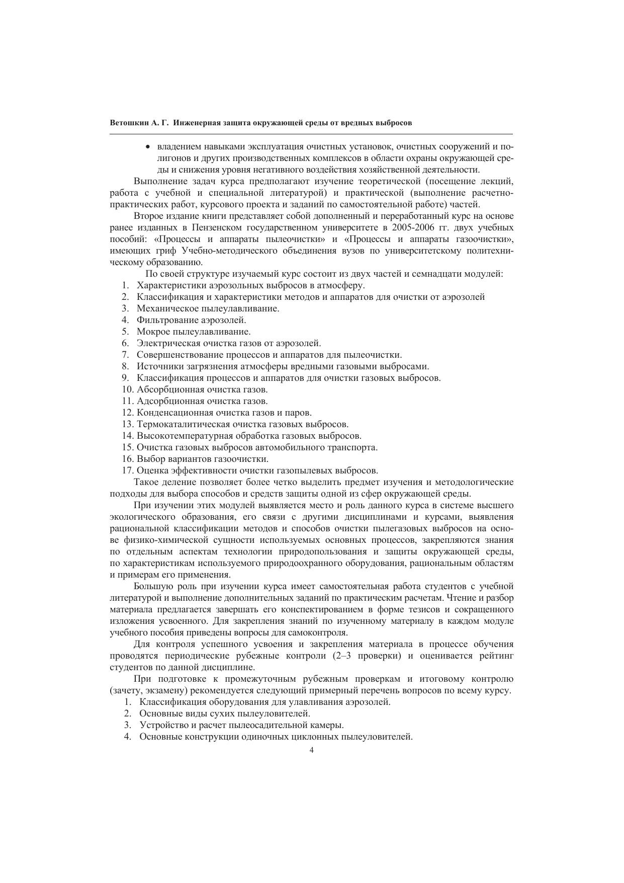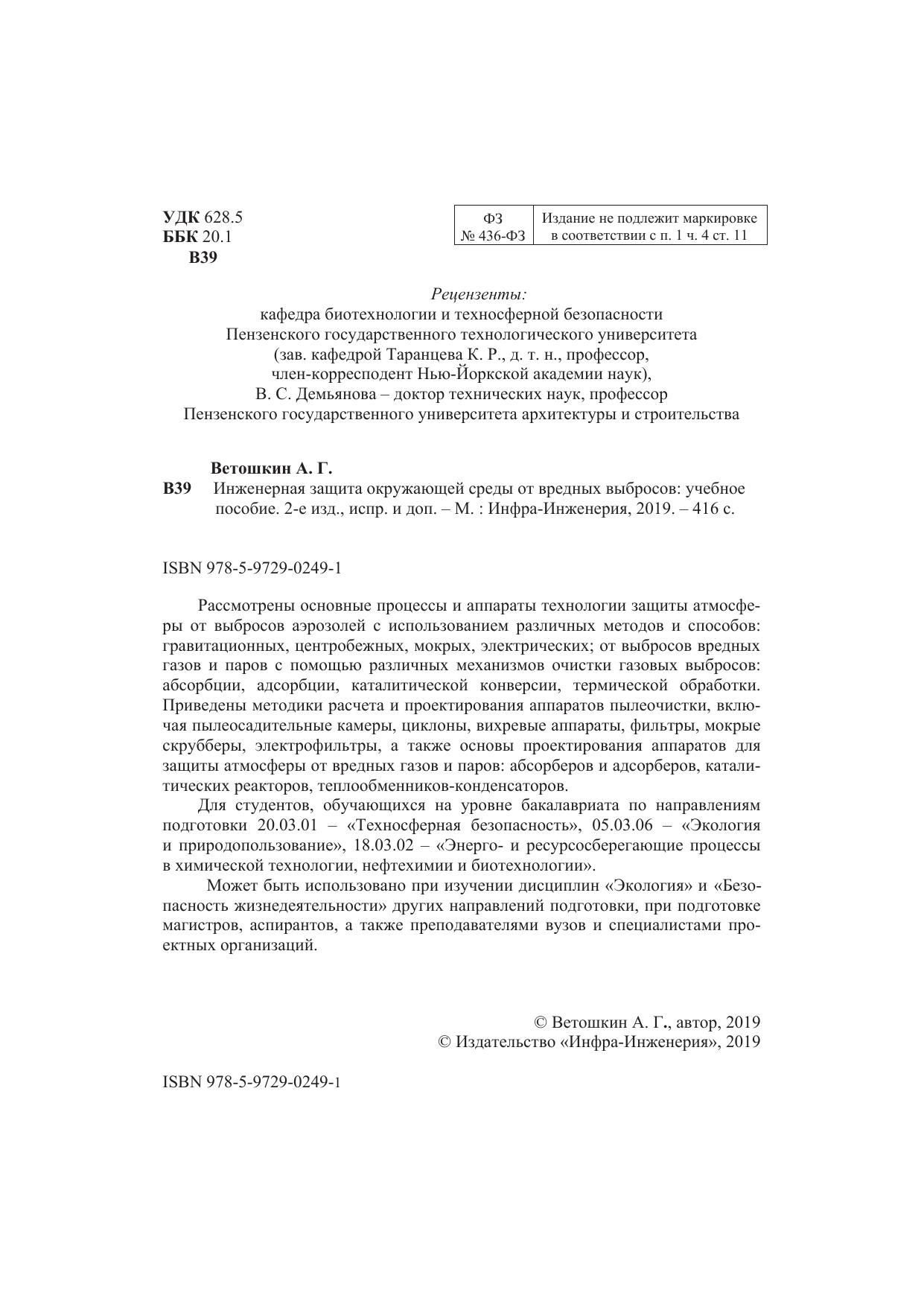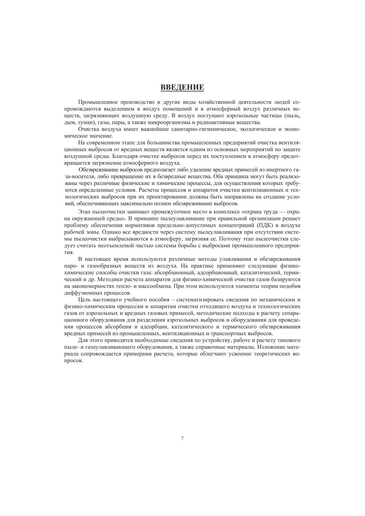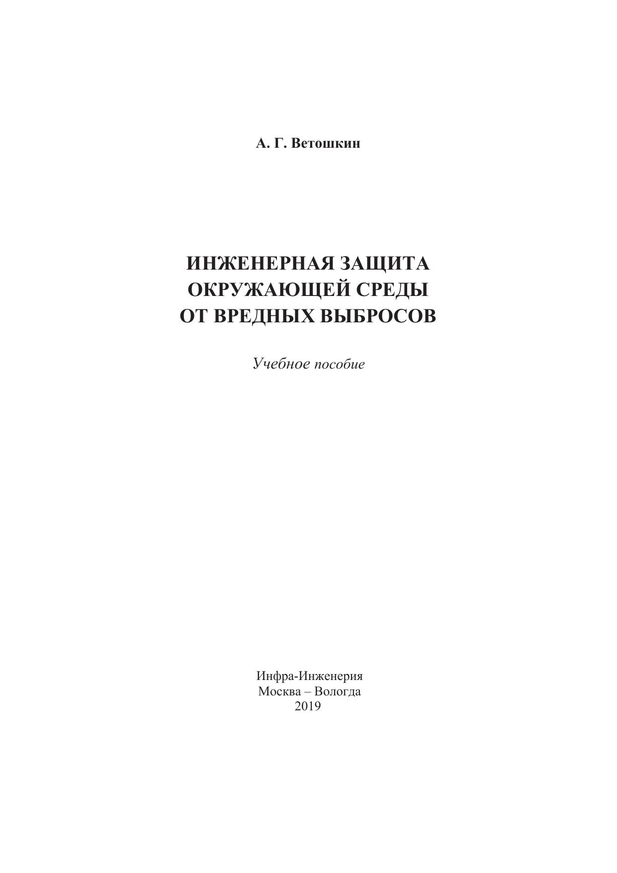 Рассмотрены основные процессы и аппараты технологии защиты атмосферы от выбросов аэрозолей с использованием различных методов и способов: гравитационные, центробежные, мокрые, электрические; выбросов вредных газов и паров, основанные на использовании различных механизмов очистки газовых выбросов: абсорбции, адсорбции, каталитической конверсии, термической обработки. Приведены методики расчета и проектирования аппаратов пылеочистки, включая пылеосадительные камеры, циклоны, вихревые аппараты, фильтры, мокрые скрубберы, электрофильтры, а также основы проектирования аппаратов защиты атмосферы от вредных газов и паров: абсорберов и адсорберов, каталитических реакторов, теплообменников-конденсаторов.