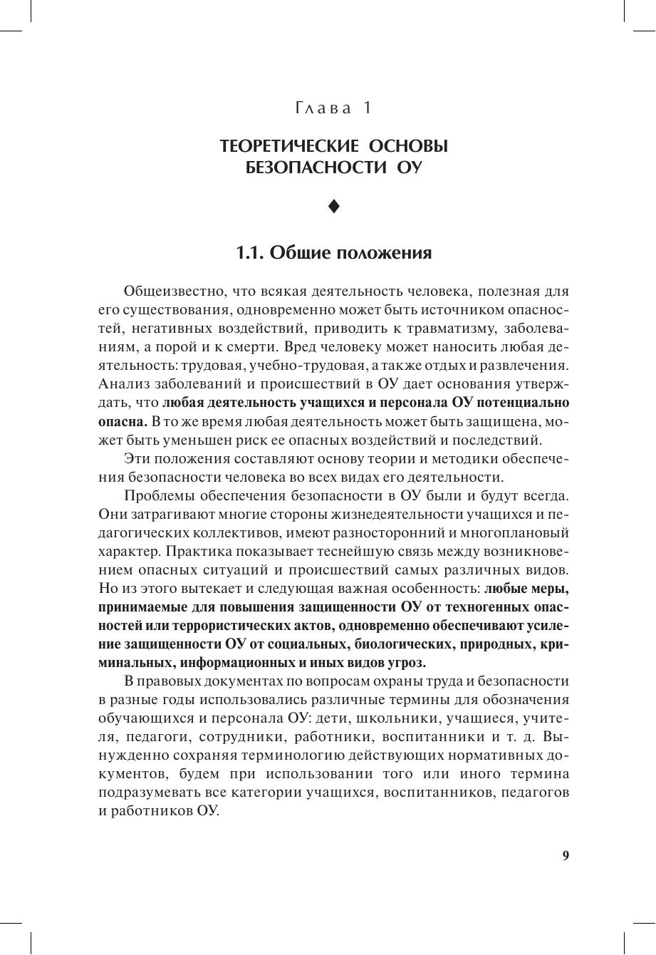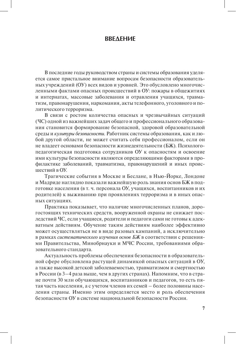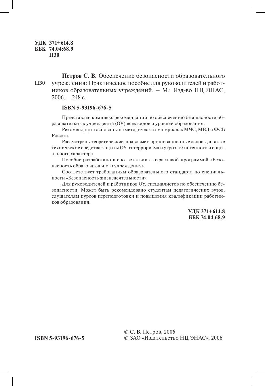 Представлен комплекс рекомендаций по обеспечению безопасности образовательных учреждений (ОУ) всех видов и уровней образования. Рекомендации основаны на методических материалах МЧС, М ВД и ФСБ России. Рассмотрены теоретические, правовые и организационные основы, а также технические средства защиты ОУ от терроризма и угроз техногенного и социального характера. Пособие разработано в соответствии с отраслевой программой «Безопасность образовательного учреждения». Соответствует требованиям образовательного стандарта по специальности «Безопасность жизнедеятельности». Для руководителей и работников ОУ, специалистов по обеспечению безопасности. Может быть рекомендовано студентам педагогических вузов, слушателям курсов переподготовки и повышения квалификации работников образования.