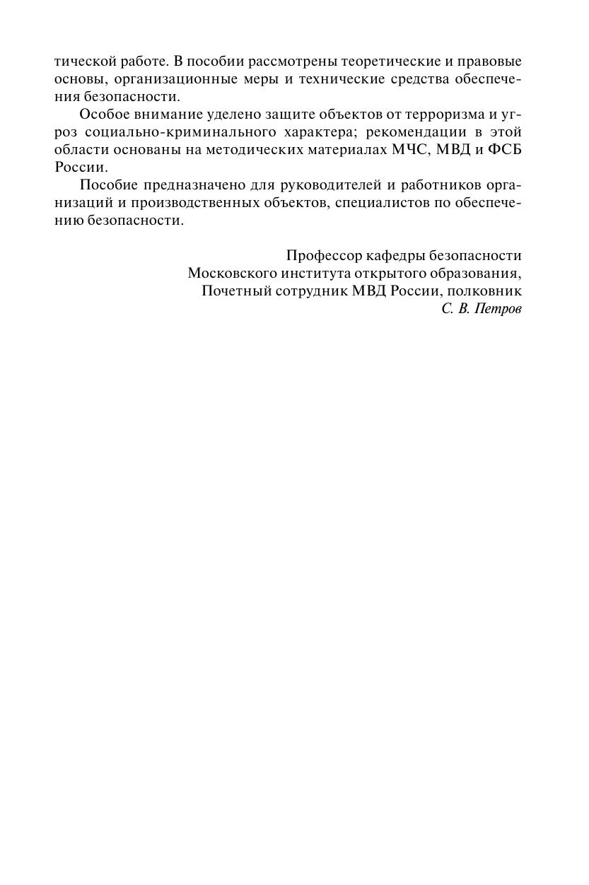 Рассмотрены теоретические, правовые и организационные основы, а также технические средства защиты организаций и производственных объектов от терроризма и угроз техногенного и социального характера. Для руководителей и работников предприятий и организаций, специалистов по обеспечению безопасности.