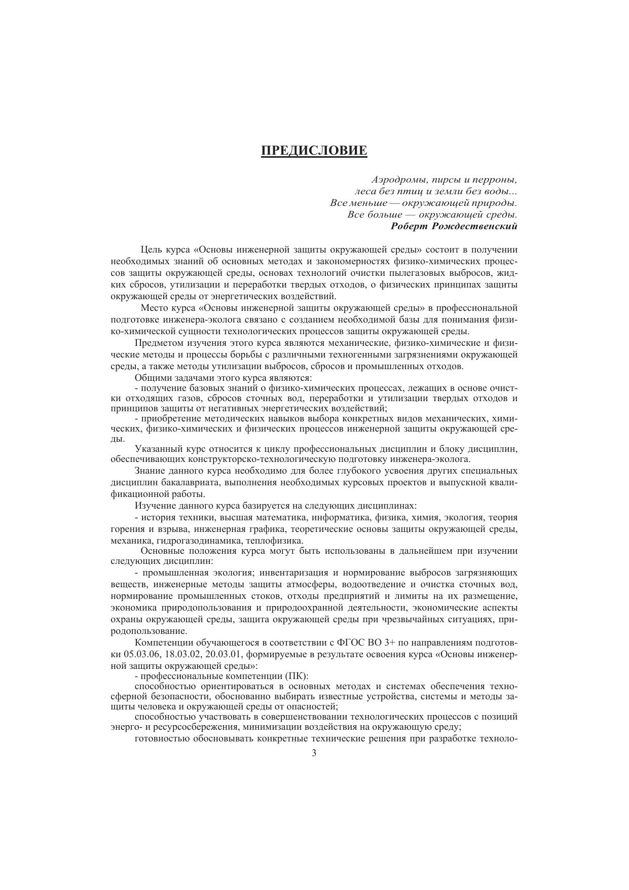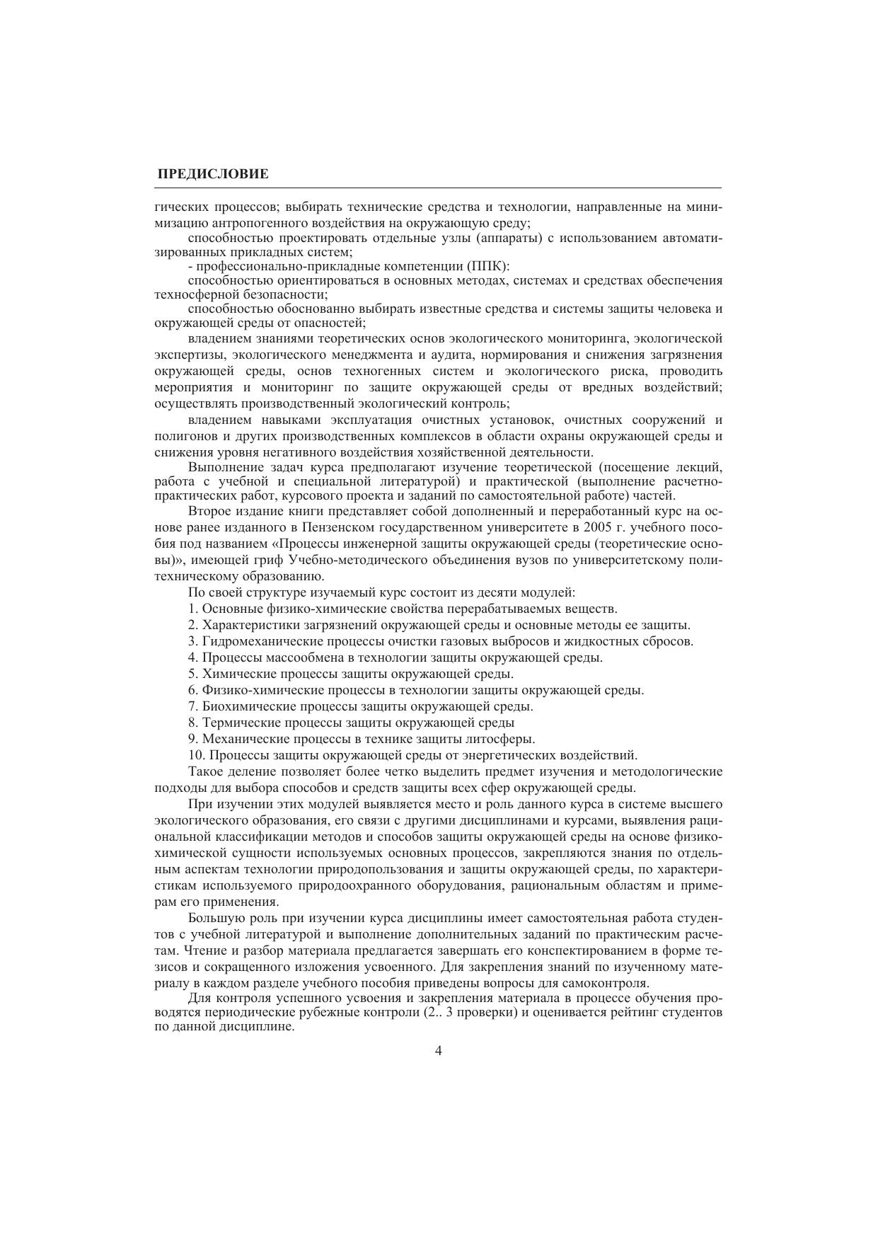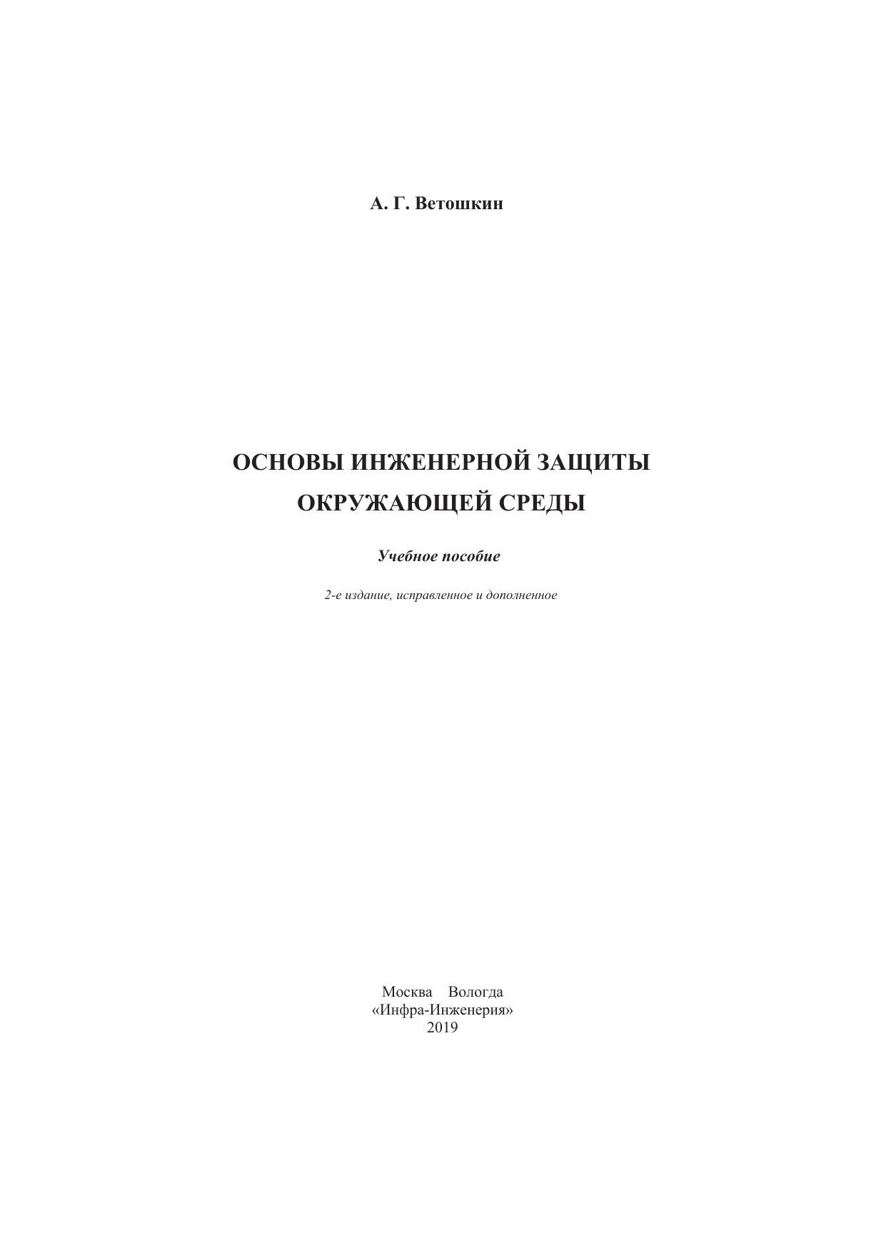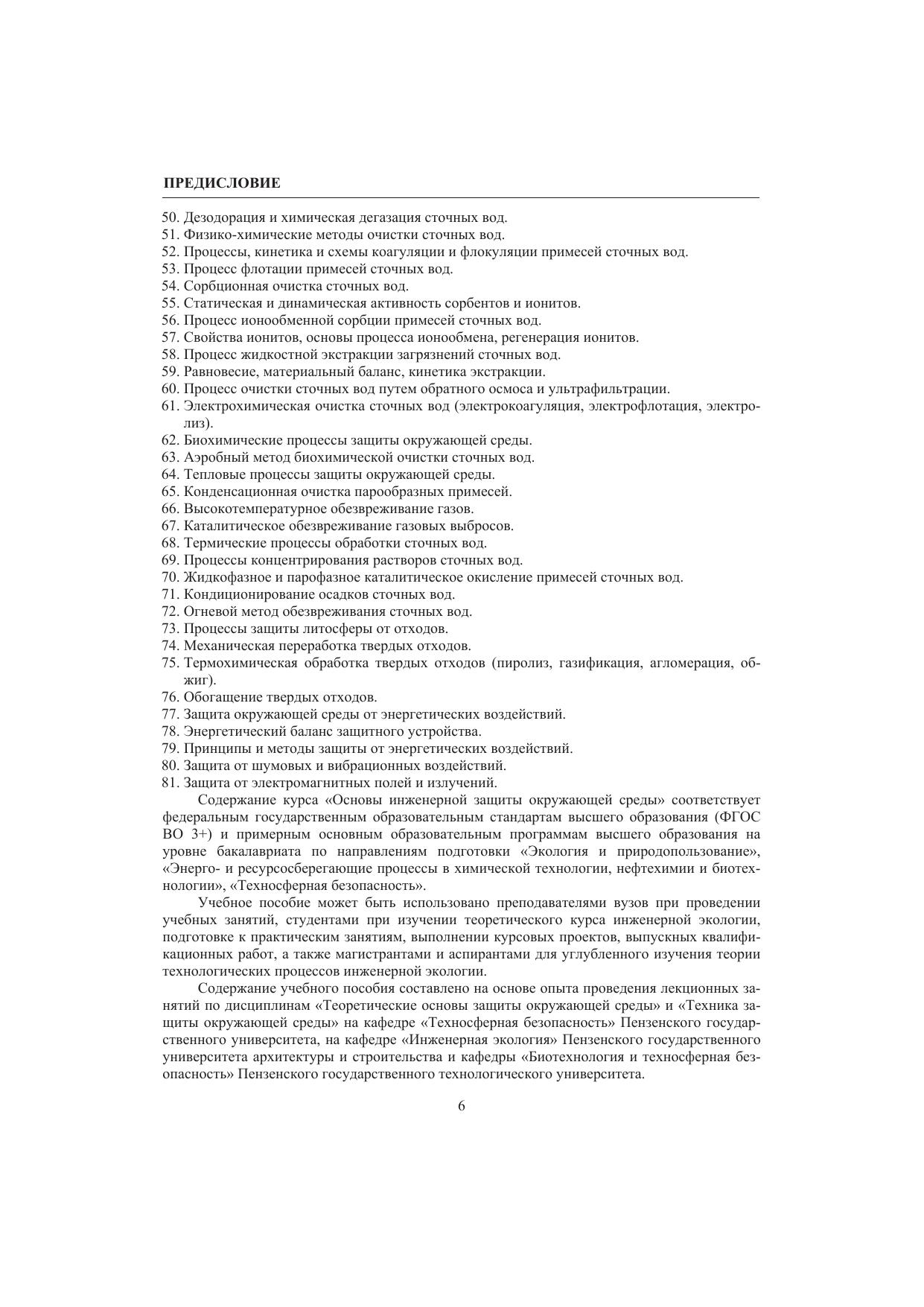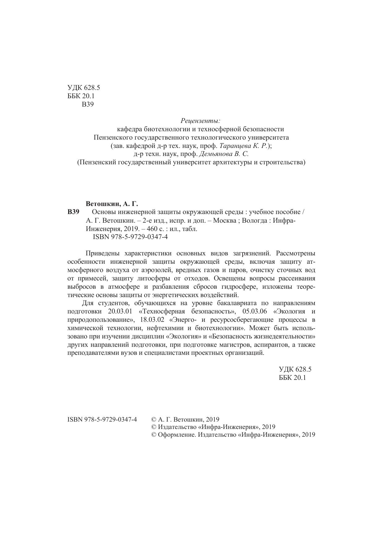 Приведены характеристики основных видов загрязнений. Рассмотрены особенности инженерной защиты окружающей среды, включая защиту атмосферного воздуха от аэрозолей, вредных газов и паров, очистку сточных вод от примесей, защиту литосферы от отходов. Освещены вопросы рассеивания выбросов в атмосфере и разбавления сбросов гидросфере, изложены теоретические основы защиты от энергетических воздействий.