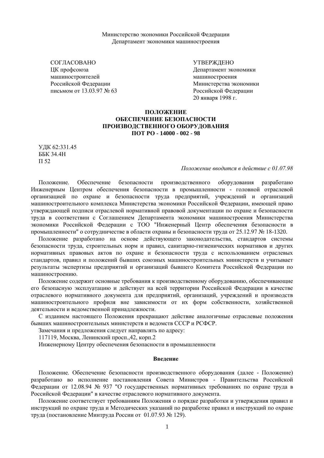 Положение. Обеспечение безопасности производственного оборудования разработано Инженерным Центром обеспечения безопасности в промышленности - головной отраслевой организацией по охране и безопасности труда предприятий, учреждений и организаций машиностроительного комплекса Министерства экономики Российской Федерации, имеющей право утверждающей подписи отраслевой нормативной правовой документации по охране и безопасности труда в соответствии с Соглашением Департамента экономики машиностроения Министерства экономики Российской Федерации с ТОО "Инженерный Центр обеспечения безопасности в промышленности" о сотрудничестве в области охраны и безопасности труда от 25.12.97 № 18-1320. Положение разработано на основе действующего законодательства, стандартов системы безопасности труда, строительных норм и правил, санитарно-гигиенических нормативов и других нормативных правовых актов по охране и безопасности труда с использованием отраслевых стандартов, правил и положений бывших союзных машиностроительных министерств и учитывает результаты экспертизы предприятий и организаций бывшего Комитета Российской Федерации по машиностроению. Положение содержит основные требования к производственному оборудованию, обеспечивающие его безопасную эксплуатацию и действует на всей территории Российской Федерации в качестве отраслевого нормативного документа для предприятий, организаций, учреждений и производств машиностроительного профиля вне зависимости от их форм собственности, хозяйственной деятельности и ведомственной принадлежности. С изданием настоящего Положения прекращают действие аналогичные отраслевые положения бывших машиностроительных министерств и ведомств СССР и РСФСР.
