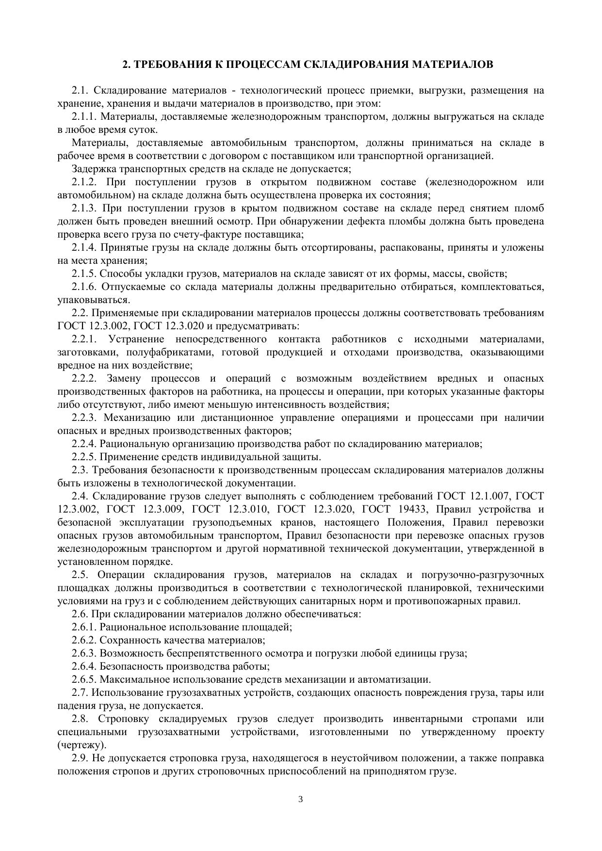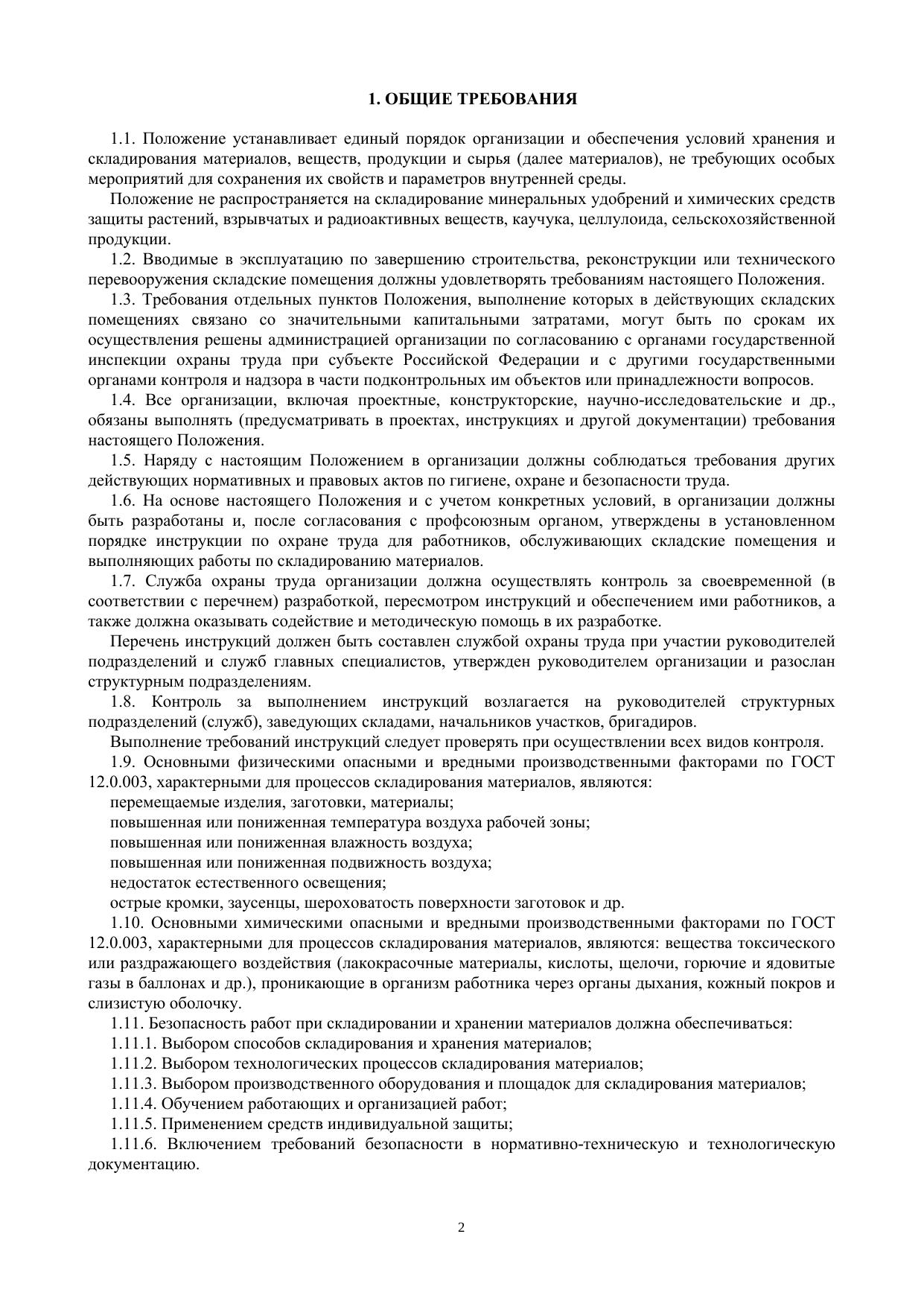 Положение. Охрана труда при складировании материалов (далее - Положение) разработано Инженерным Центром обеспечения безопасности в промышленности, являющимся головной отраслевой организацией по охране и безопасности труда предприятий, учреждений и организаций машиностроительного комплекса Министерства экономики Российской Федерации, имеющей право утверждающей подписи отраслевой нормативной правовой документации по охране и безопасности труда (Соглашение от 25.12.97 № 18-1320). Положение разработано на основе действующего законодательства, стандартов системы безопасности труда, строительных норм и правил, санитарно - гигиенических нормативов, правил устройства и безопасной эксплуатации грузоподъемных машин и других объектов, подконтрольных органам госгортехнадзора, Межотраслевых правил охраны труда при погрузочно-разгрузочных работах и размещении грузов, других нормативных правовых актов по охране и безопасности труда с использованием отраслевых стандартов, правил и положений бывших союзных машиностроительных министерств и учитывает результаты экспертизы предприятий и организаций бывшего Комитета Российской Федерации по машиностроению. Положение содержит основные требования к складским помещениям и площадкам для складирования материалов, требования к размещаемым на хранение грузам и материалам, требования к их размещению на хранение и условиям хранения и обработки грузов и материалов и действует на всей территории Российской Федерации. С введением в действие настоящего Положения аналогичные отраслевые правила и положения по охране и безопасности труда при складировании материалов, утвержденные министерствами и ведомствами бывшего СССР и РСФСР, не применяются и подлежат приведению в соответствие с настоящим Положением нормативные и другие акты организаций по охране и безопасности труда.