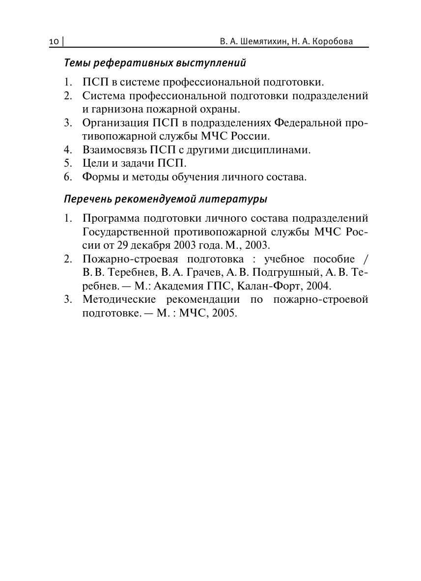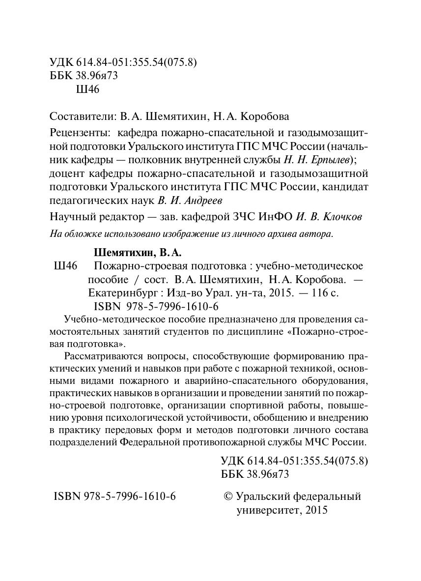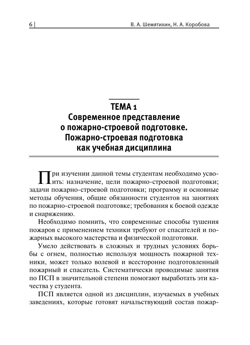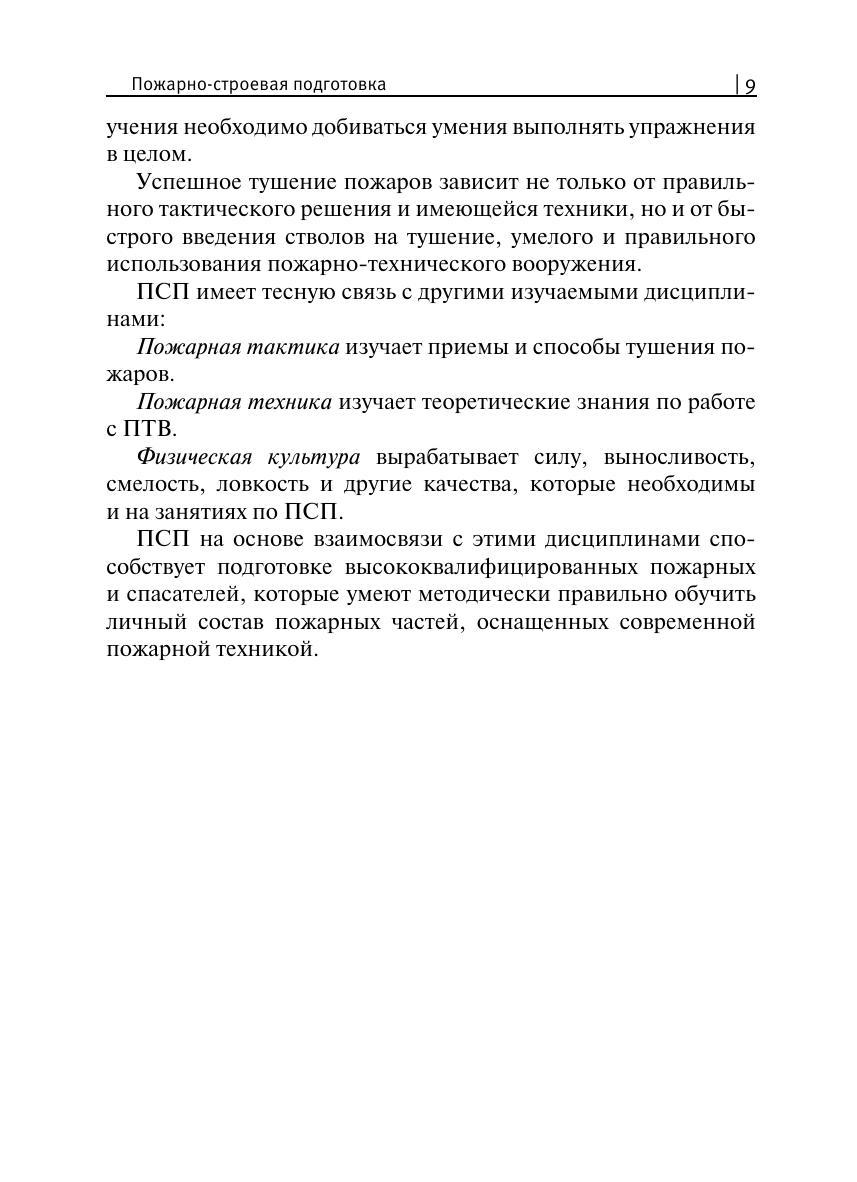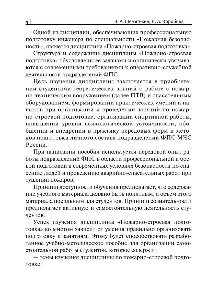 Учебно-методическое пособие предназначено для проведения самостоятельных занятий студентов по дисциплине «Пожарно-строевая подготовка». Рассматриваются вопросы, способствующие формированию практических умений и навыков при работе с пожарной техникой, основными видами пожарного и аварийно-спасательного оборудования, практических навыков в организации и проведении занятий по пожарно-строевой подготовке, организации спортивной работы, повышению уровня психологической устойчивости, обобщению и внедрению в практику передовых форм и методов подготовки личного состава подразделений Федеральной противопожарной службы МЧС России.