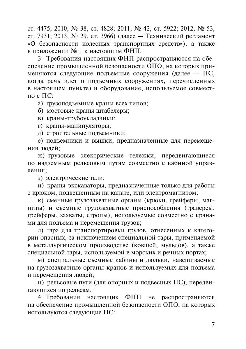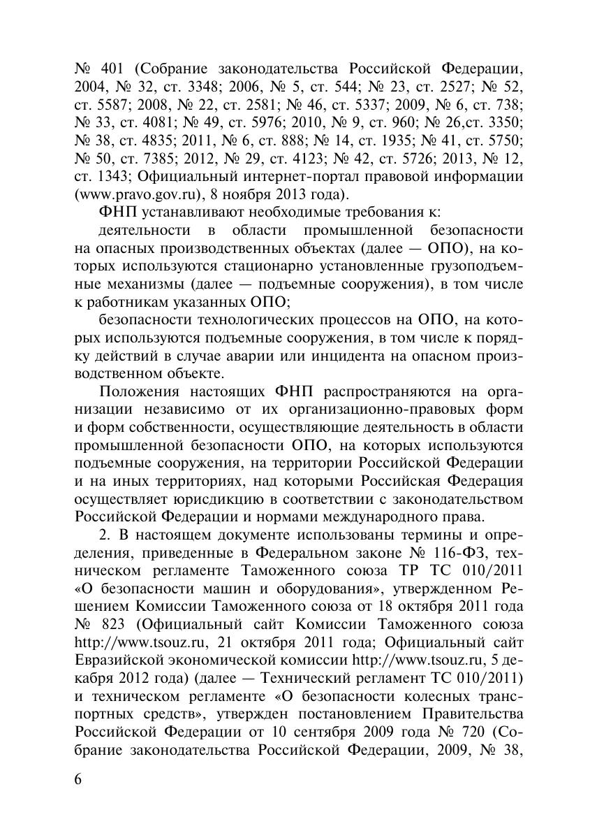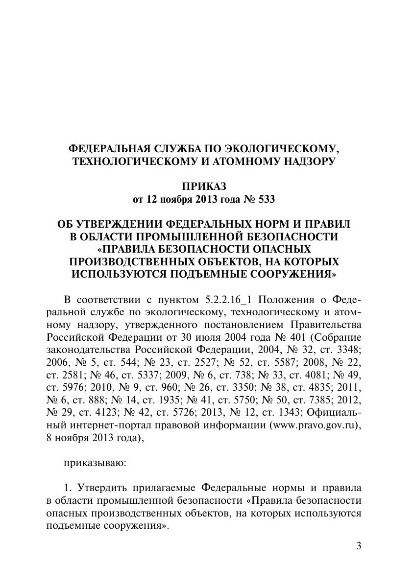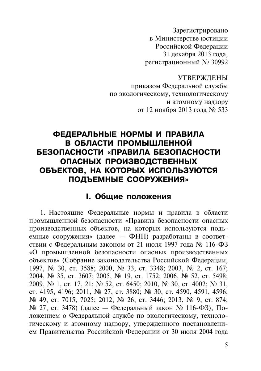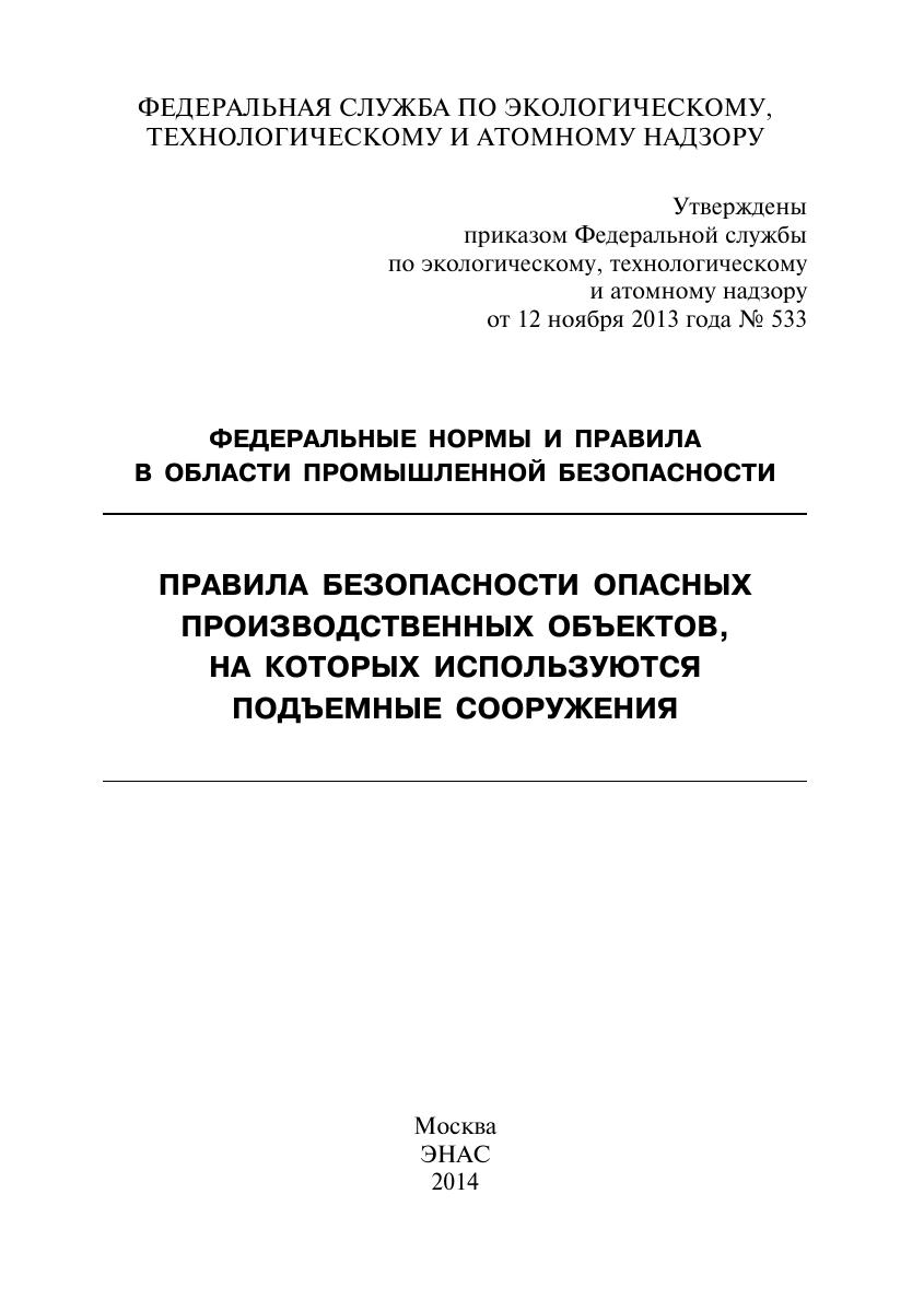 Федеральные нормы и правила в области промышленной безопасности «Правила безопасности опасных производственных объектов, на которых используются подъемные сооружения» утверждены приказом Федеральной службы по экологическому, технологическому и атомному надзору от 12 ноября 2013 года № 533 и зарегистрированы в Минюсте России 31 декабря 2013 года, регистрационный № 30992. Правила устанавливают необходимые требования к деятельности в области промышленной безопасности на опасных производственных объектах, на которых используются стационарно установленные грузоподъемные механизмы, в том числе к работникам указанных объектов, а также к безопасности технологических процессов на опасных производственных объектах, на которых используются подъемные сооружения, в том числе к порядку действий в случае аварии или инцидента на опасном производственном объекте. Положения настоящих правил распространяются на организации независимо от их организационно-правовых форм и форм собственности, осуществляющие деятельность на опасных производственных объектах, на которых используются подъемные сооружения, на территории Российской Федерации и на иных территориях, над которыми Российская Федерация осуществляет юрисдикцию в соответствии с законодательством Российской Федерации и нормами международного права.