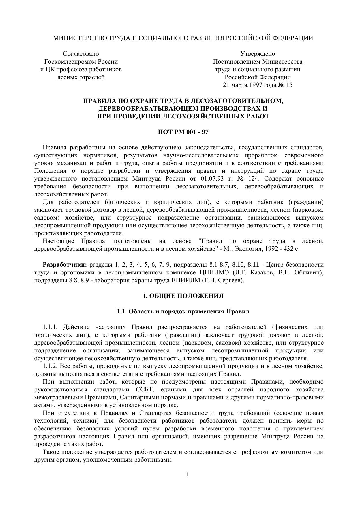 Правила по охране труда в лесозаготовительном, деревообрабатывающем производствах и при проведении лесохозяйственных работ. ПОТ РМ 001 - 97