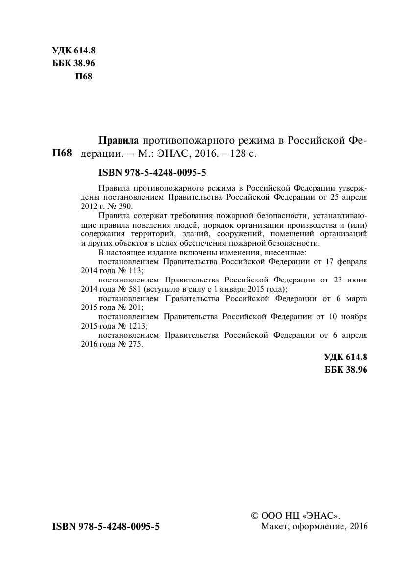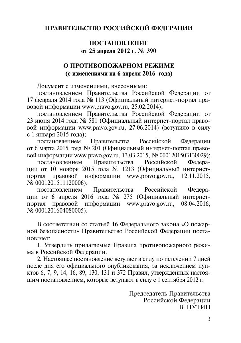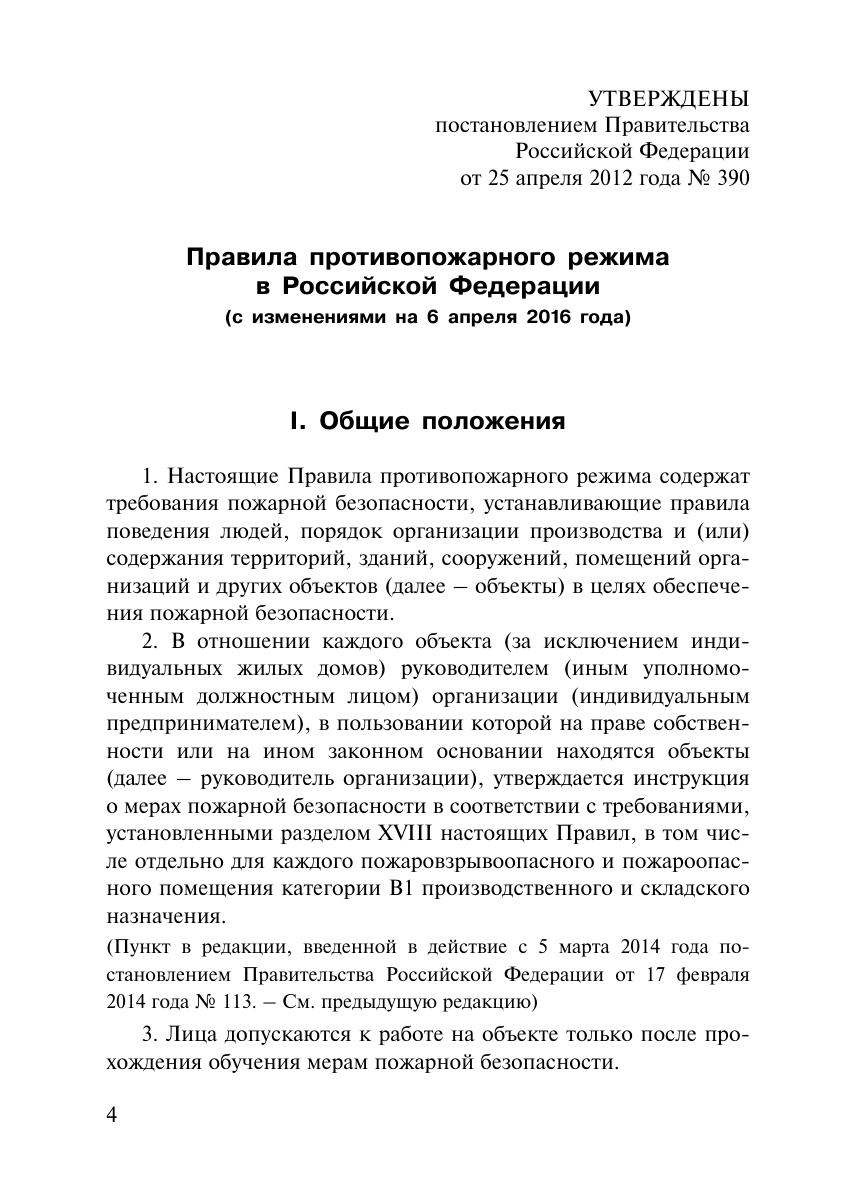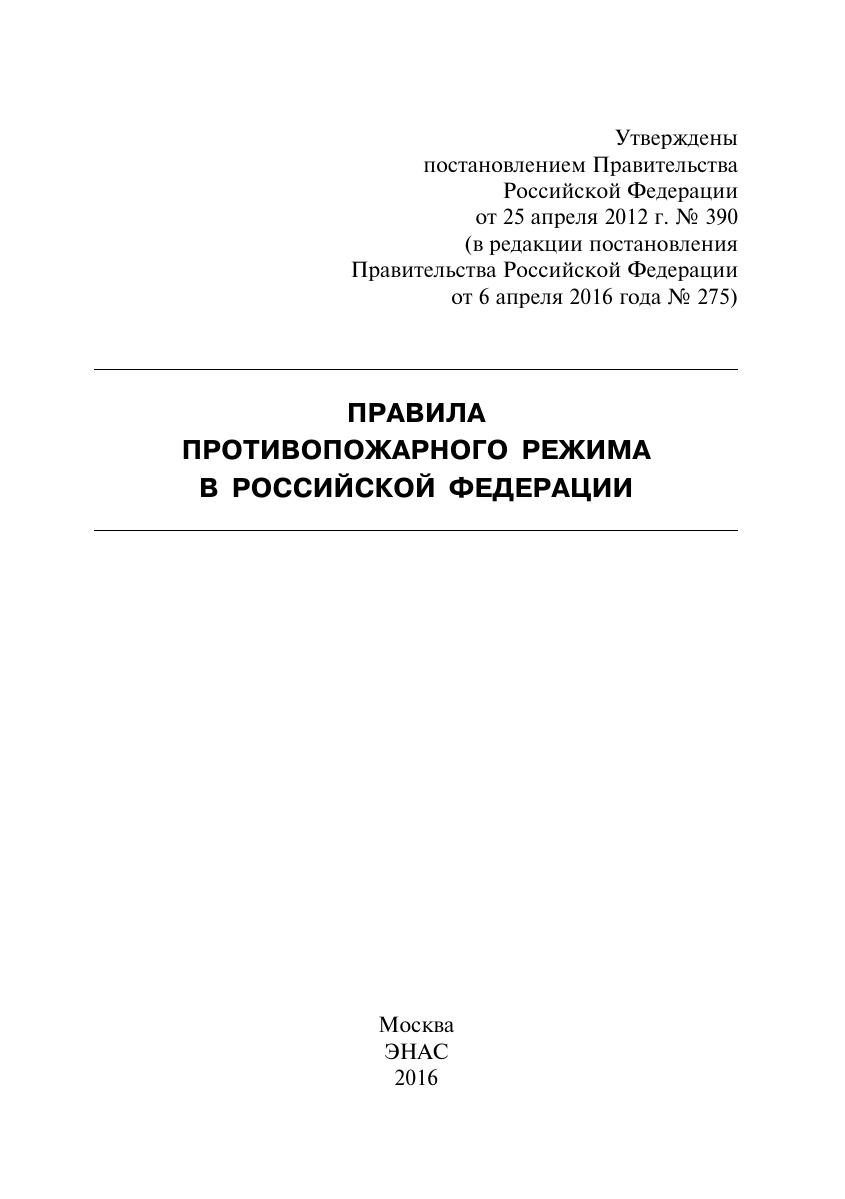 Правила противопожарного режима в Российской Федерации утверждены постановлением Правительства Российской Федерации от 25 апреля 2012 г. № 390. Правила содержат требования пожарной безопасности, устанавливающие правила поведения людей, порядок организации производства и (или) содержания территорий, зданий, сооружений, помещений организаций и других объектов в целях обеспечения пожарной безопасности. В настоящее издание включены изменения, внесенные: