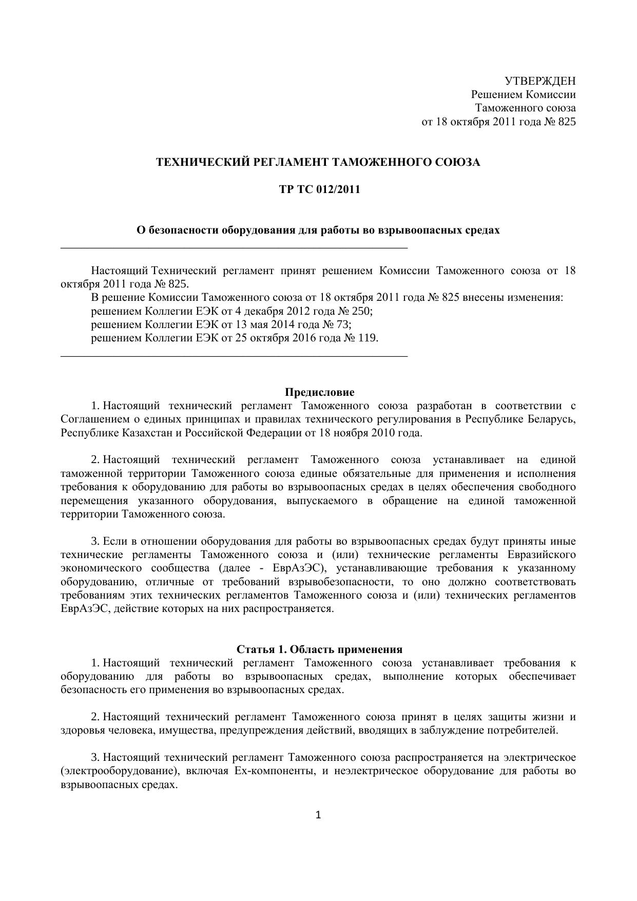 Технический регламент Tаможенного союза ТР ТС 012/2011 О безопасности оборудования для работы во взрывоопасных средах (с изменениями на 25 октября 2016 года)