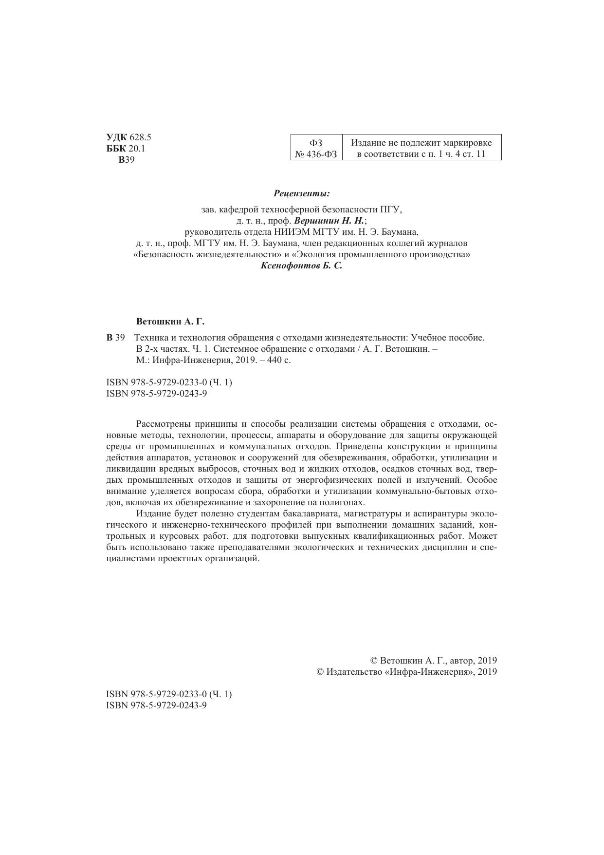 В Ч.1. “Системное обращение с отходами” рассмотрены принципы и способы реализации системы обращения с отходами, основные методы, технологии, процессы, аппараты и оборудование для защиты окружающей среды от промышленных и коммунальных отходов. Приведены конструкции и принципы действия аппаратов, установок и сооружений для обезвреживания, обработки, утилизации и ликвидации вредных выбросов, сточных вод и жидких отходов, осадков сточных вод, твердых промышленных отходов и защиты от энергофизических полей и излучений.