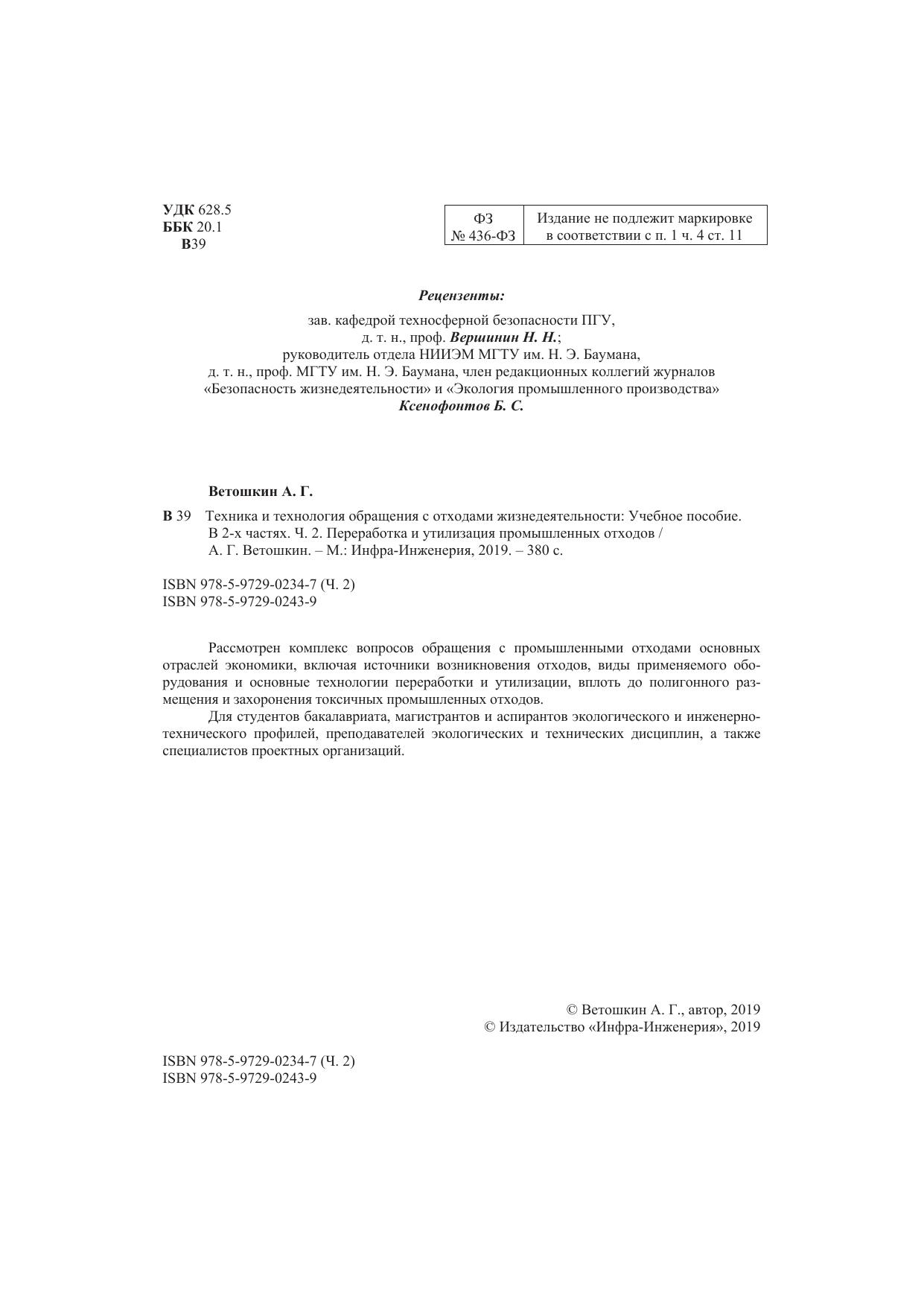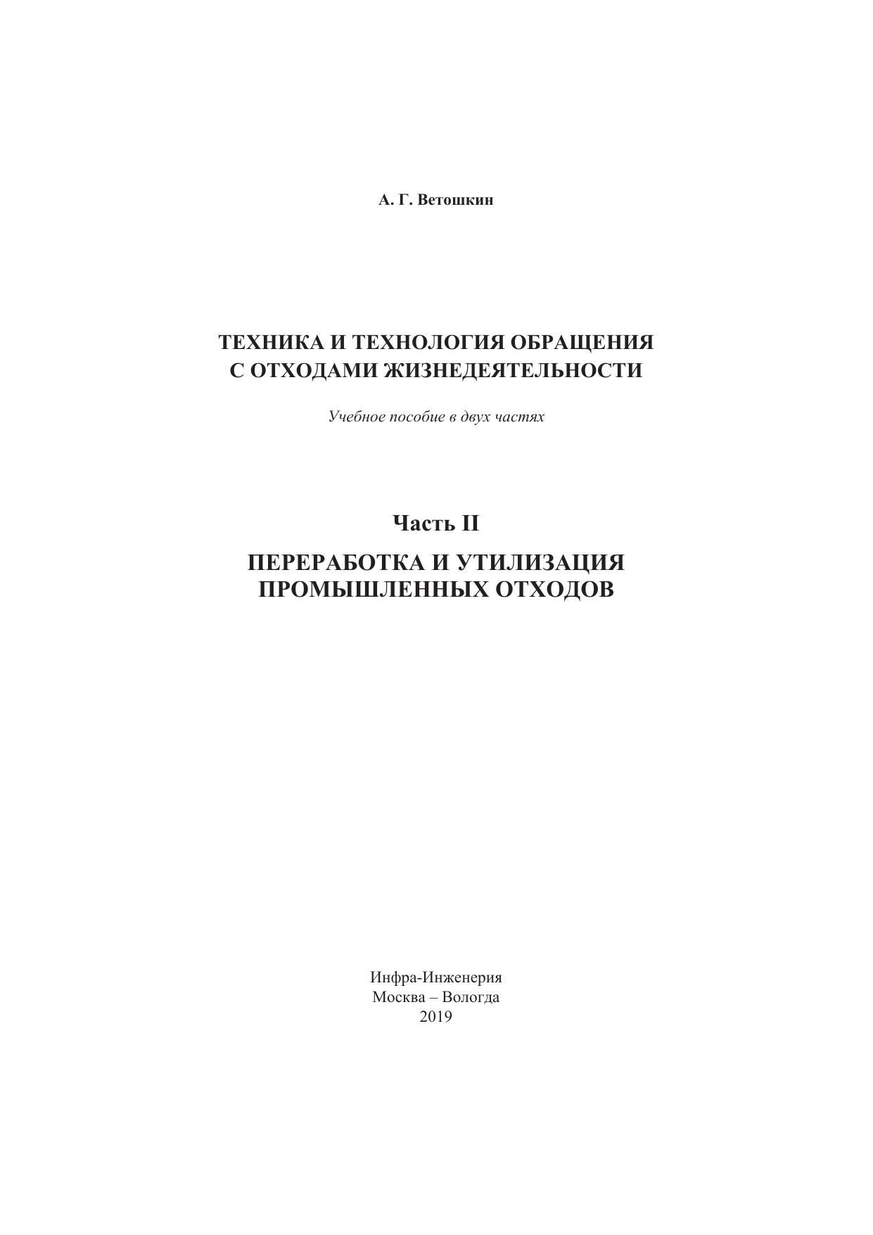 Рассмотрен комплекс вопросов обращения с промышленными отходами основных отраслей экономики, включая источники возникновения отходов, виды применяемого оборудования и основные технологии переработки и утилизации, вплоть до полигонного размещения и захоронения токсичных промышленных отходов. Для студентов балакавриата, магистрантов и аспирантов экологического и инженерно-технического профилей, преподавателей экологических и технических дисциплин, а также специалистов проектных организаций.