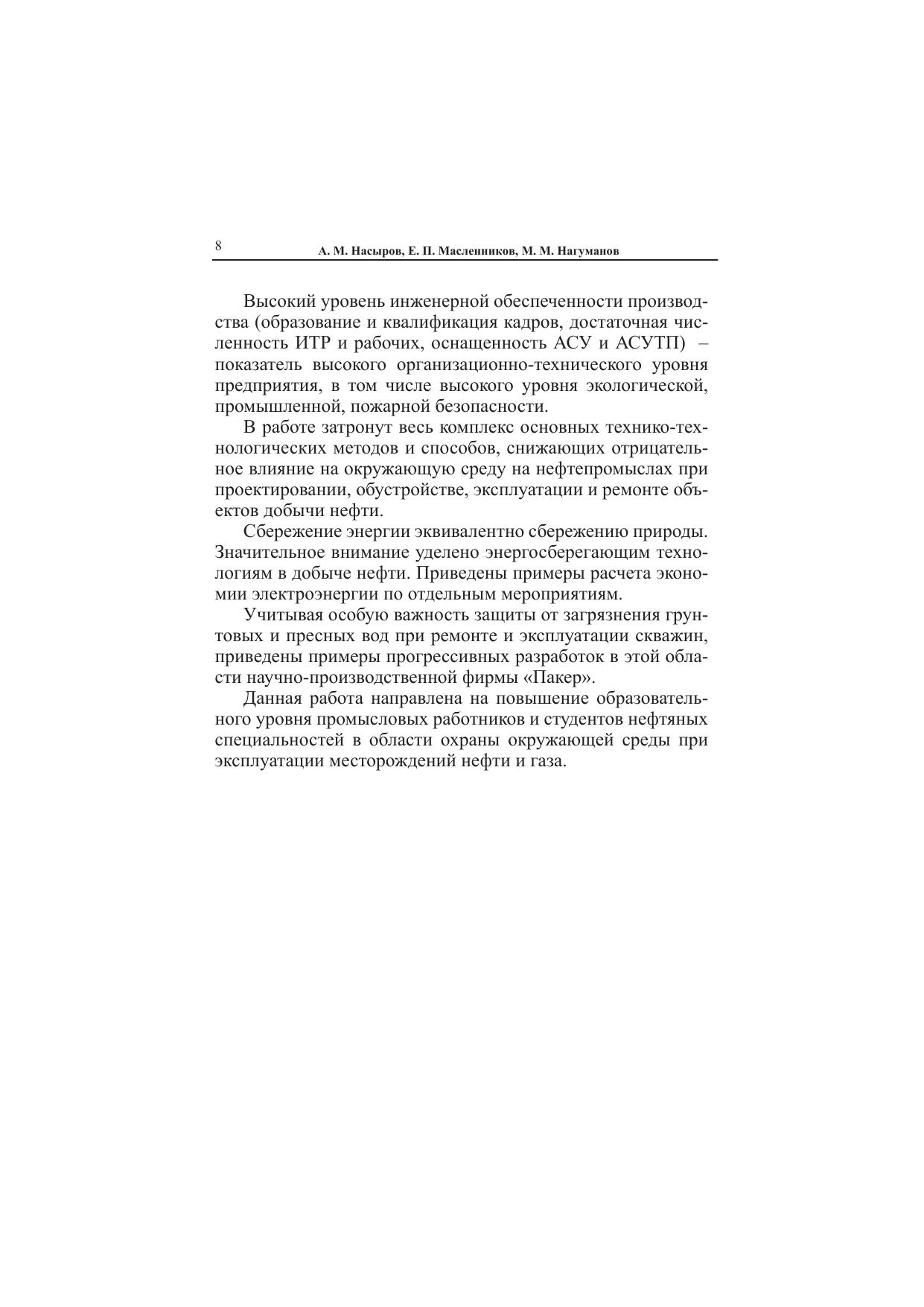 Значительное внимание уделено энергосберегающим технологиям в добыче нефти. Приведены примеры расчета экономии электроэнергии по отдельным мероприятиям. Приведены также примеры новых разработок, обеспечивающих охрану окружающей среды и промышленную безопасность при ремонте и эксплуатации скважин.