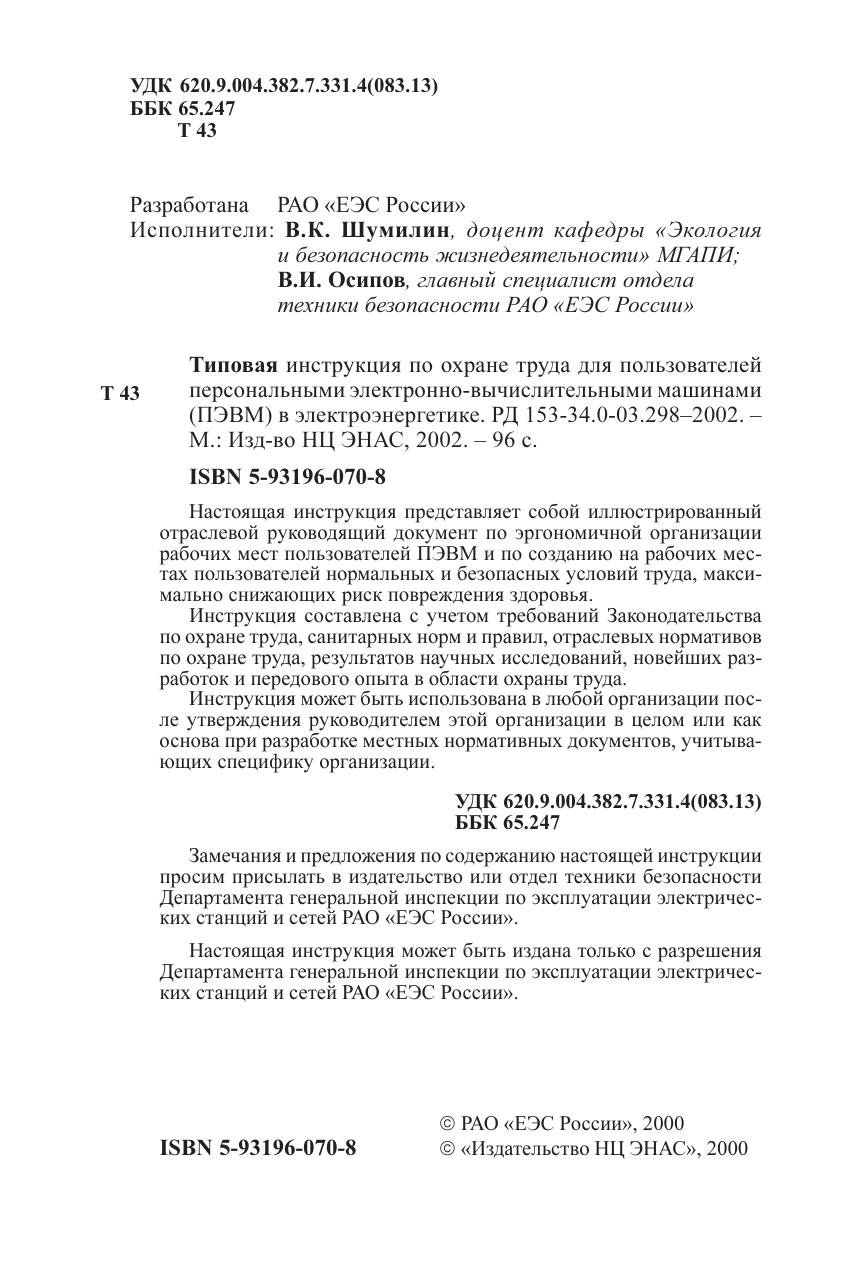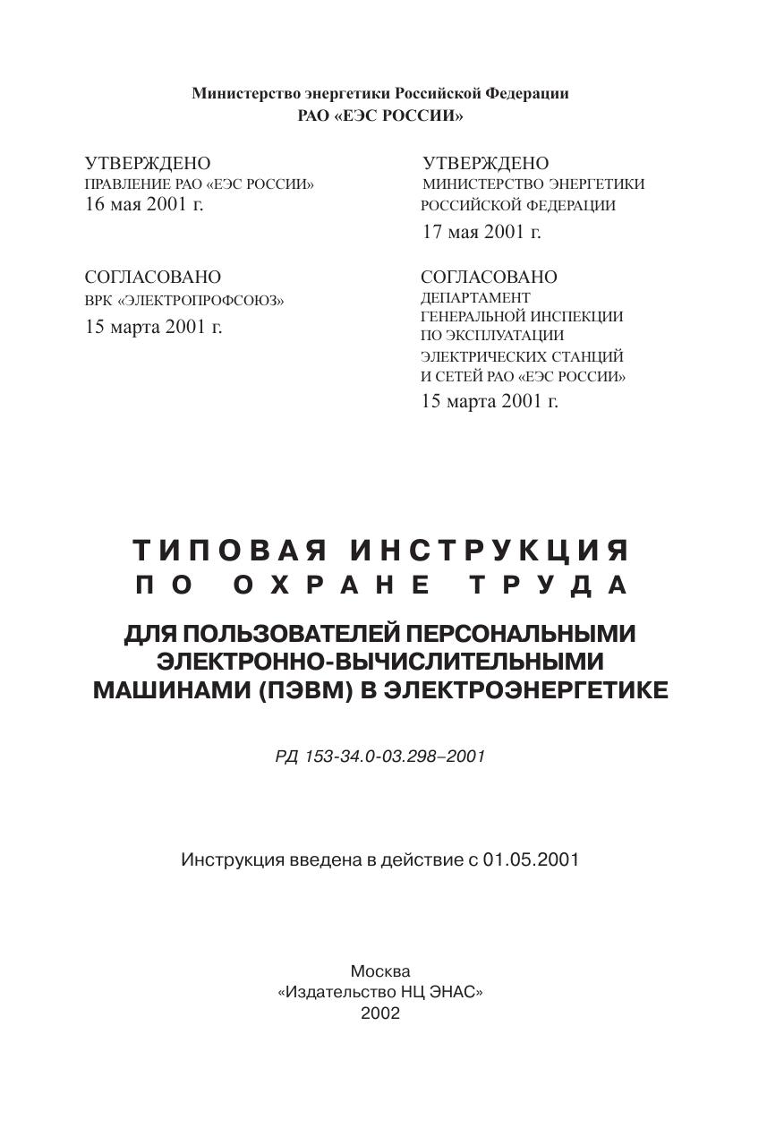 Типовая инструкция по охране труда для пользователей персональными электронно-вычислительными машинами (ПЭВМ) в электроэнергетике. РД 153-34.0-03.298-2002