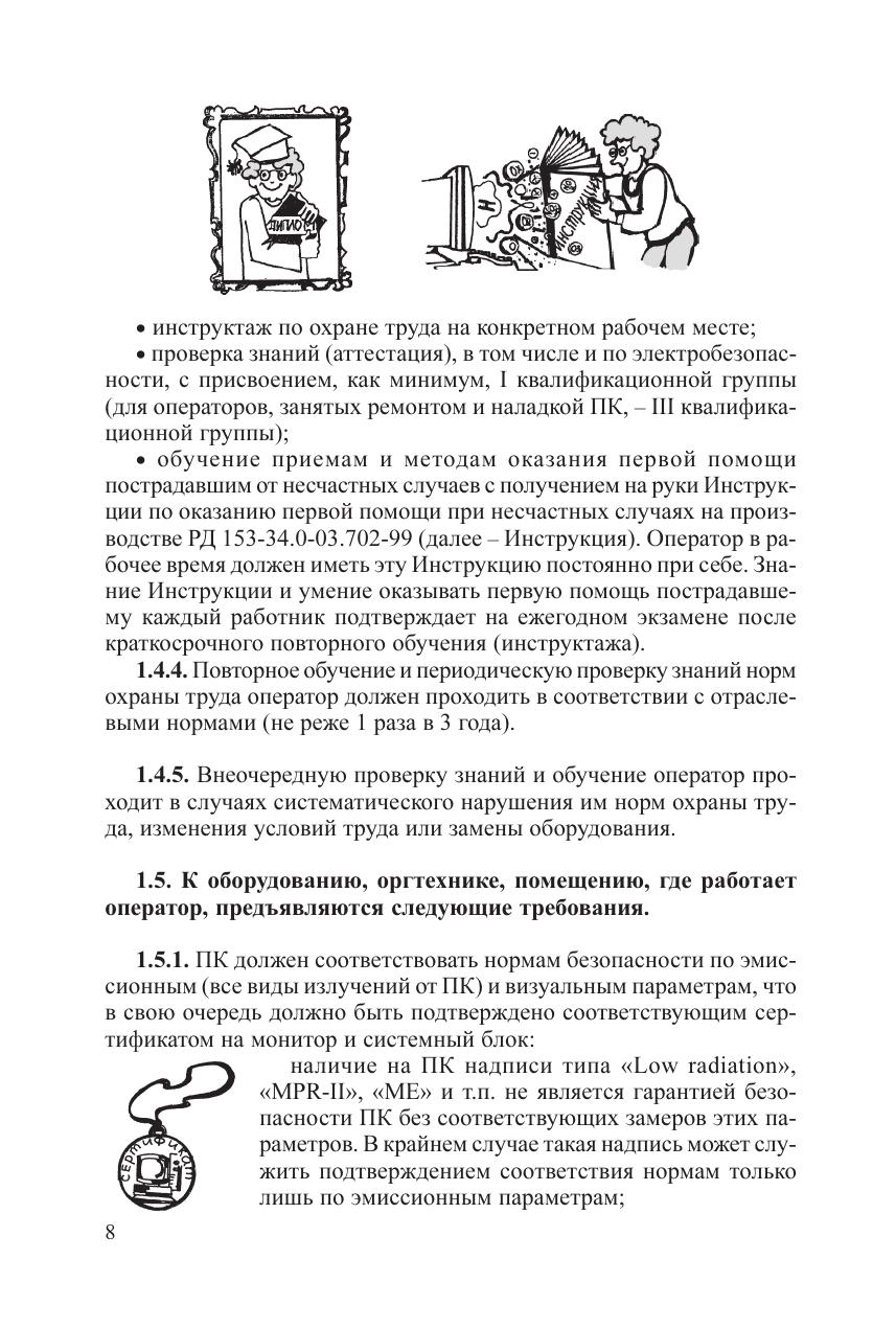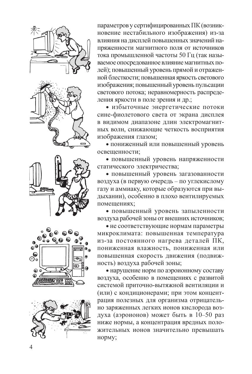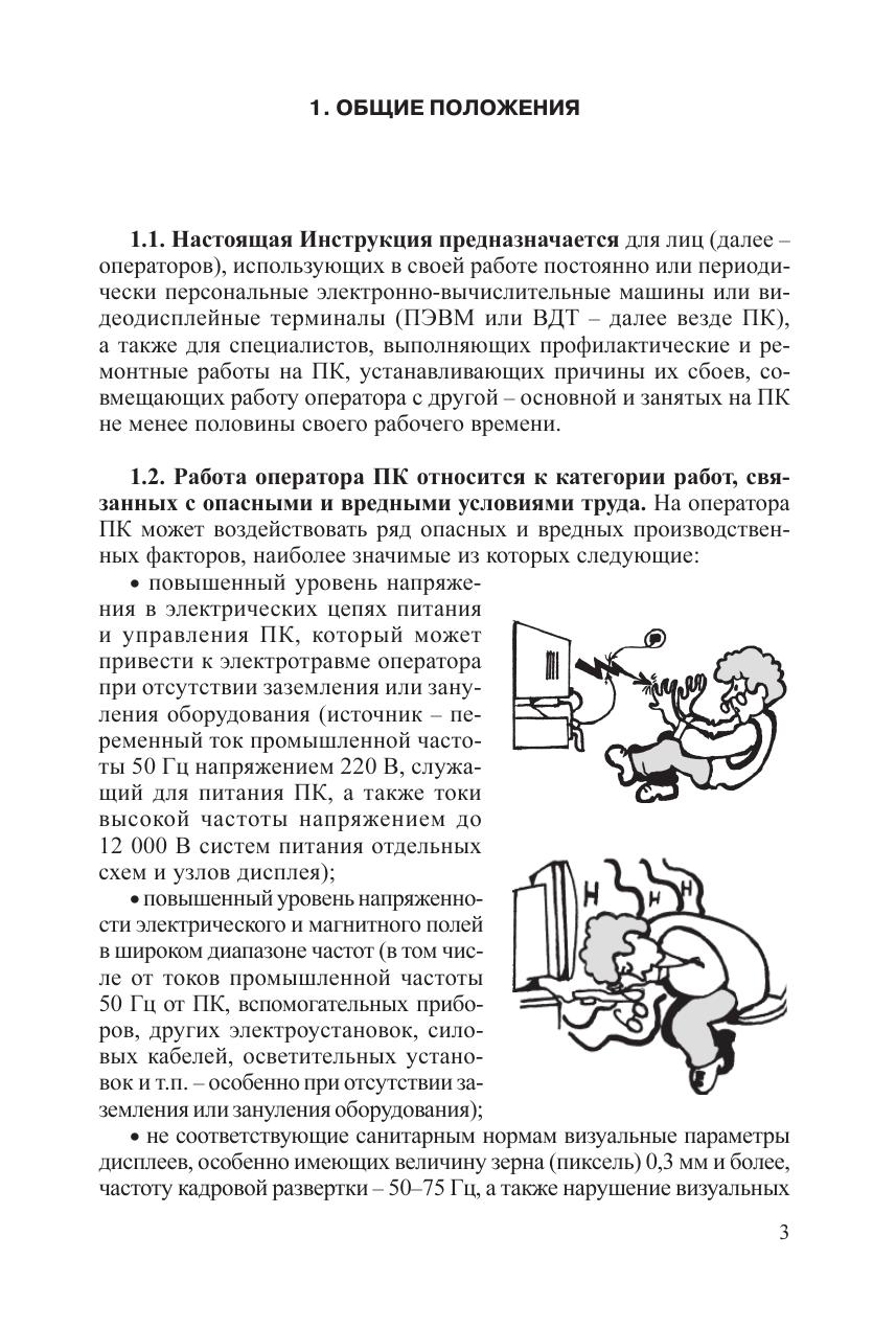 Настоящая инструкция представляет собой иллюстрированный отраслевой руководящий документ по эргономичной организации рабочих мест пользователей ПЭВМ и по созданию на рабочих местах пользователей нормальных и безопасных условий труда, максимально снижающих риск повреждения здоровья. Инструкция составлена с учетом требований Законодательства по охране труда, санитарных норм и правил, отраслевых нормативов по охране труда, результатов научных исследований, новейших разработок и передового опыта в области охраны труда. Инструкция может быть использована в любой организации после утверждения руководителем этой организации в целом или как основа при разработке местных нормативных документов, учитывающих специфику организации.