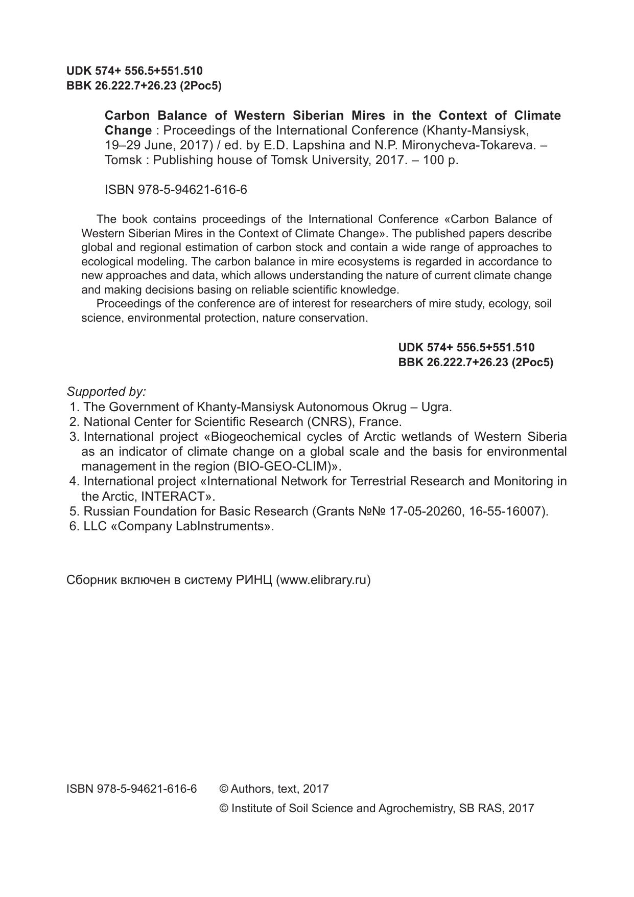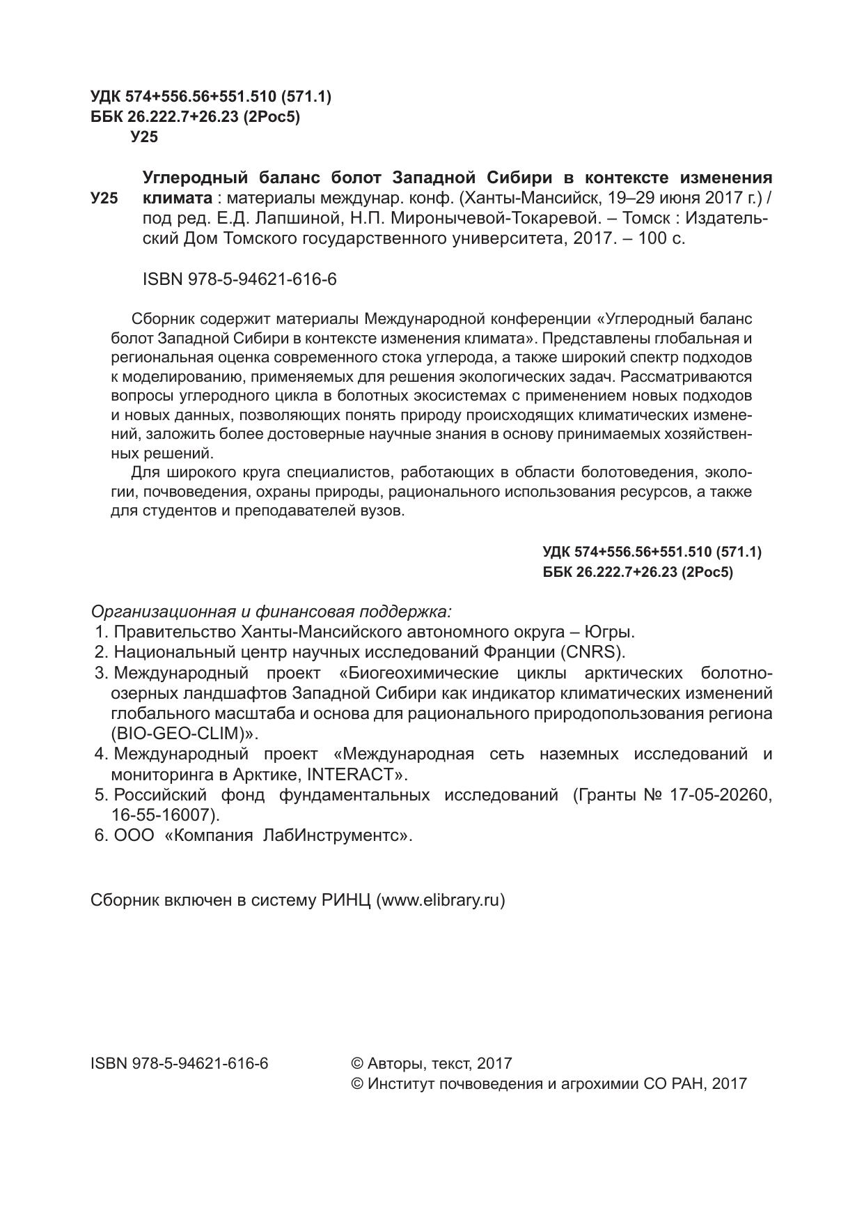 Сборник содержит материалы Международной конференции «Углеродный баланс болот Западной Cибири в контексте изменения климата». Представлены глобальная и региональная оценка современного стока углерода, а также широкий спектр подходов к моделированию, применяемых для решения экологических задач. Рассматриваются вопросы углеродного цикла в болотных экосистемах с применением новых подходов и новых данных, позволяющих понять природу происходящих климатических изменений, заложить более достоверные научные знания в основу принимаемых хозяйственных решений. Для широкого круга специалистов, работающих в области болотоведения, экологии, почвоведения, охраны природы, рационального использования ресурсов, а также для студентов и преподавателей вузов.