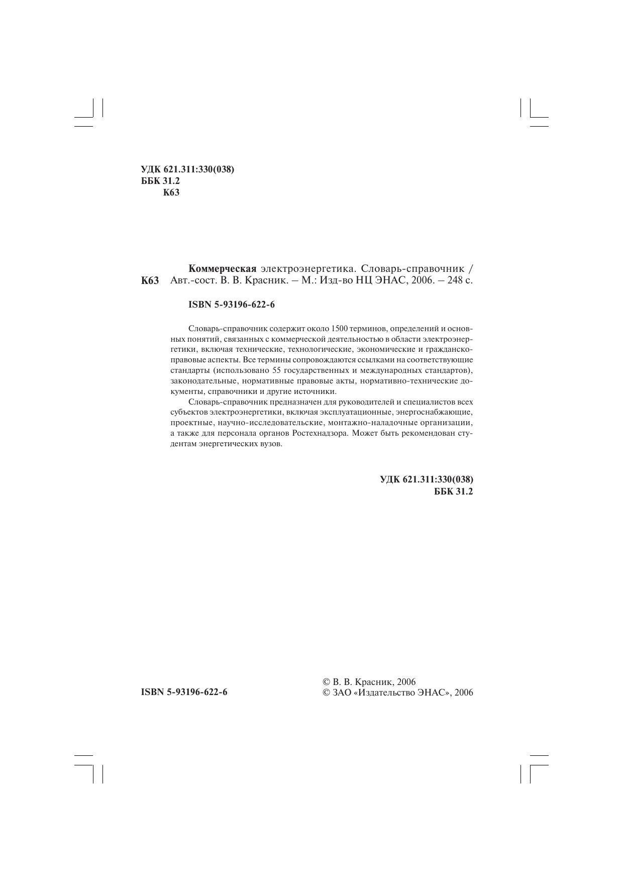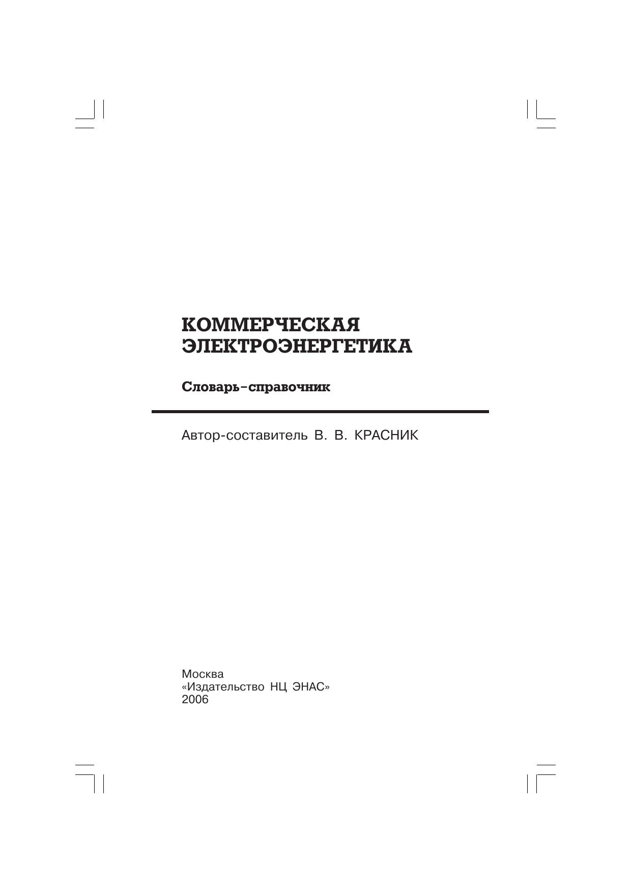 Словарь-справочник содержит около 1500 терминов, определений и основных понятий, связанных с коммерческой деятельностью в области электроэнергетики, включая технические, технологиеческие, экономические и гражданско-правовые аспекты. Все термины сопровождаются ссылками на соответствующие стандарты (использовано 55 госудраственных и международных стандартов), законодательные, нормативные правовые акты, нормативно-технические документы, справочники и другие источники.Словарь-справочник предназначен для руководителей и специалистов всех субъектов электроэнергетики. включая эксплуатационные, энергоснабжающие, проектные, научно-исследовательские, монтажно-наладочные организации, а также для персонала органов Ростехнадзора. Может быть рекомнедован студентам энергетических вузов.