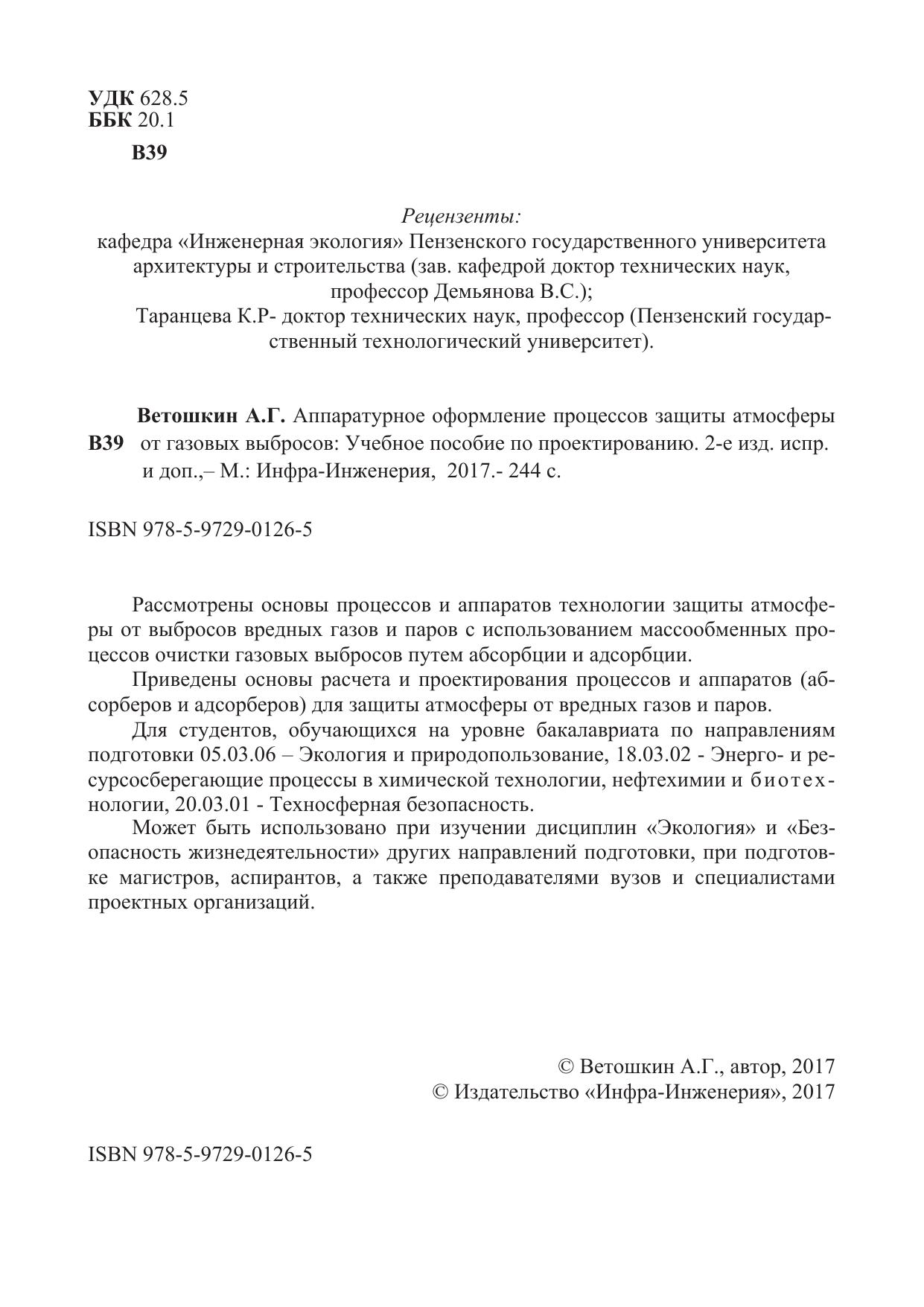 Рассмотрены основы процессов и аппаратов технологии защиты атмосферы от выбросов вредных газов и паров с использованием массообменных процессов очистки газовых выбросов путем абсорбции и адсорбции. Приведены основы расчета и проектирования процессов и аппаратов (абсорберов и адсорберов) для защиты атмосферы от вредных газов и паров.
