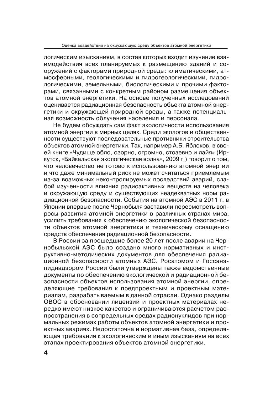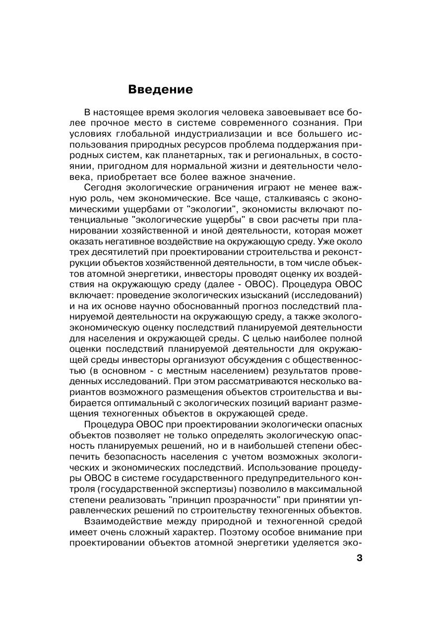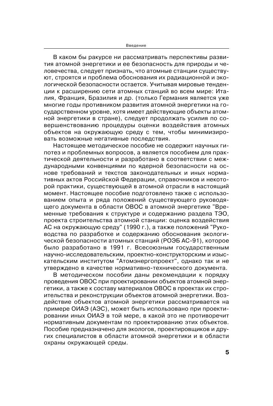 Процедура оценки воздействия на окружающую среду (ОВОС) включает: проведение экологических изысканий (исследований) и на их основе научно обоснованный прогноз последствий планируемой деятельности на окружающую среду, а также эколого-экономическую оценку последствий деятельности для населения и окружающей среды. Несмотря на сокращение полномочий государственной экологической экспертизы в части рассмотрения материалов ОВОС на намечаемую хозяйственную деятельность, в атомной энергетике эта процедура сохранилась в полном объеме. При этом до настоящего момента не существовало обобщающего руководства по проведению ОВОС в атомной энергетике с учетом ее специфики. В методическом пособии даны рекомендации к порядку проведения ОВОС при проектировании объектов атомной энергетики, которые разработаны в соответствии с международными конвенциями по ядерной безопасности на основе законодательных и иных нормативных актов Российской Федерации. Издание подготовлено в виде руководства (методического пособия) на основе нормативно-технических документов разного уровня. Изложенные подходы к ОВОС могут применяться не только в атомной энергетике, но и при разработке проектной документации любых промышленных сооружений. Методическое пособие предназначено учащимся строительных и экологических специальностей, инженерам проектных институтов, чиновникам экологической экспертизы, юристам в области охраны окружающей среды.