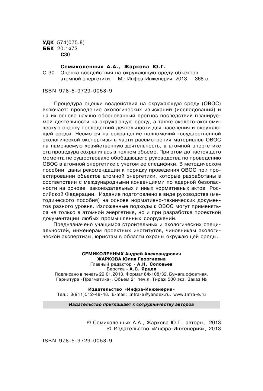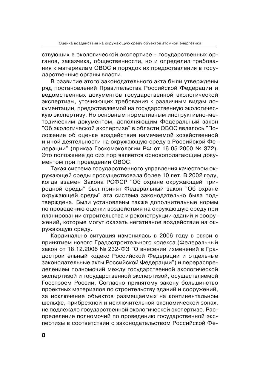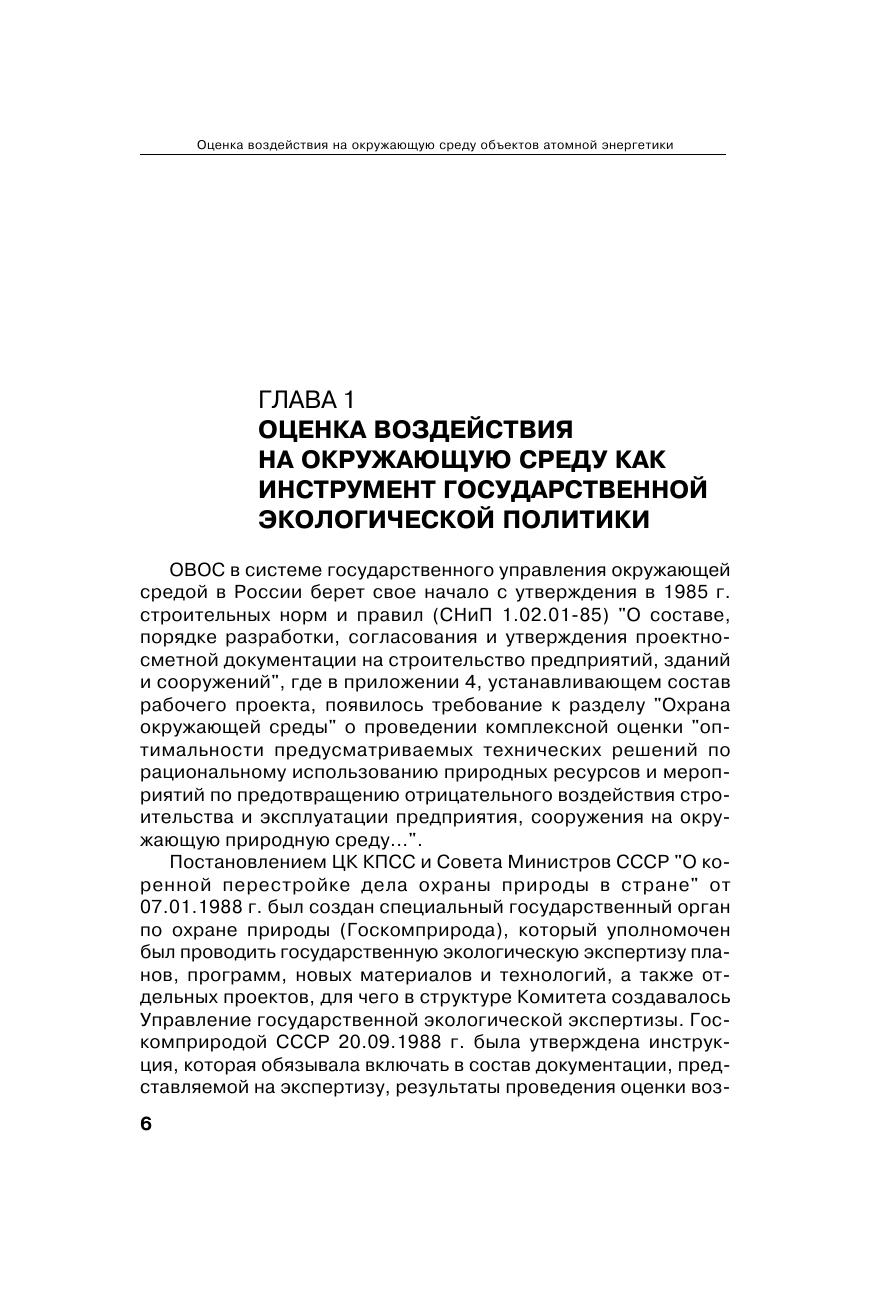 Процедура оценки воздействия на окружающую среду (ОВОС) включает: проведение экологических изысканий (исследований) и на их основе научно обоснованный прогноз последствий планируемой деятельности на окружающую среду, а также эколого-экономическую оценку последствий деятельности для населения и окружающей среды. Несмотря на сокращение полномочий государственной экологической экспертизы в части рассмотрения материалов ОВОС на намечаемую хозяйственную деятельность, в атомной энергетике эта процедура сохранилась в полном объеме. При этом до настоящего момента не существовало обобщающего руководства по проведению ОВОС в атомной энергетике с учетом ее специфики. В методическом пособии даны рекомендации к порядку проведения ОВОС при проектировании объектов атомной энергетики, которые разработаны в соответствии с международными конвенциями по ядерной безопасности на основе законодательных и иных нормативных актов Российской Федерации. Издание подготовлено в виде руководства (методического пособия) на основе нормативно-технических документов разного уровня. Изложенные подходы к ОВОС могут применяться не только в атомной энергетике, но и при разработке проектной документации любых промышленных сооружений. Методическое пособие предназначено учащимся строительных и экологических специальностей, инженерам проектных институтов, чиновникам экологической экспертизы, юристам в области охраны окружающей среды.