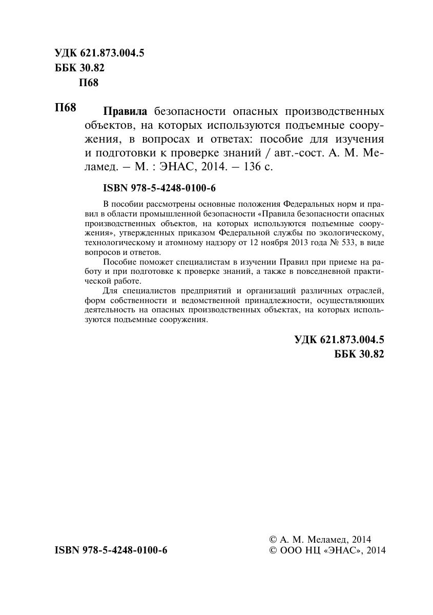 В пособии рассмотрены основные положения Федеральных норм и правил в области промышленной безопасности «Правила безопасности опасных производственных объектов, на которых используются подъемные сооружения», утвержденных приказом Федеральной службы по экологическому, технологическому и атомному надзору от 12 ноября 2013 года № 533, в виде вопросов и ответов. Пособие поможет специалистам в изучении Правил при приеме на работу и при подготовке к проверке знаний, а также в повседневной практической работе. Для специалистов предприятий и организаций различных отраслей, форм собственности и ведомственной принадлежности, осуществляющих деятельность на опасных производственных объектах, на которых используются подъемные сооружения.