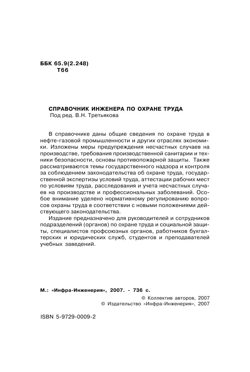 В справочнике даны общие сведения по охране труда в нефте-газовой промышленности и других отраслях экономики. Изложены меры предупреждения несчастных случаев на производстве, требования производственной санитарии и техники безопасности, основы противопожарной защиты. Также рассматриваются темы государственного надзора и контроля за соблюдением законодательства об охране труда, государственной экспертизы условий труда, аттестации рабочих мест по условиям труда, расследования и учета несчастных случаев на производстве и профессиональных заболеваний. Особое внимание уделено нормативному регулированию вопросов охраны труда в соответствии с новыми положениями действующего законодательства. Издание предназначено для руководителей и сотрудников подразделений (органов) по охране труда и социальной защиты, специалистов профсоюзных органов, работников бухгалтерских и юридических служб, студентов и преподавателей учебных заведений