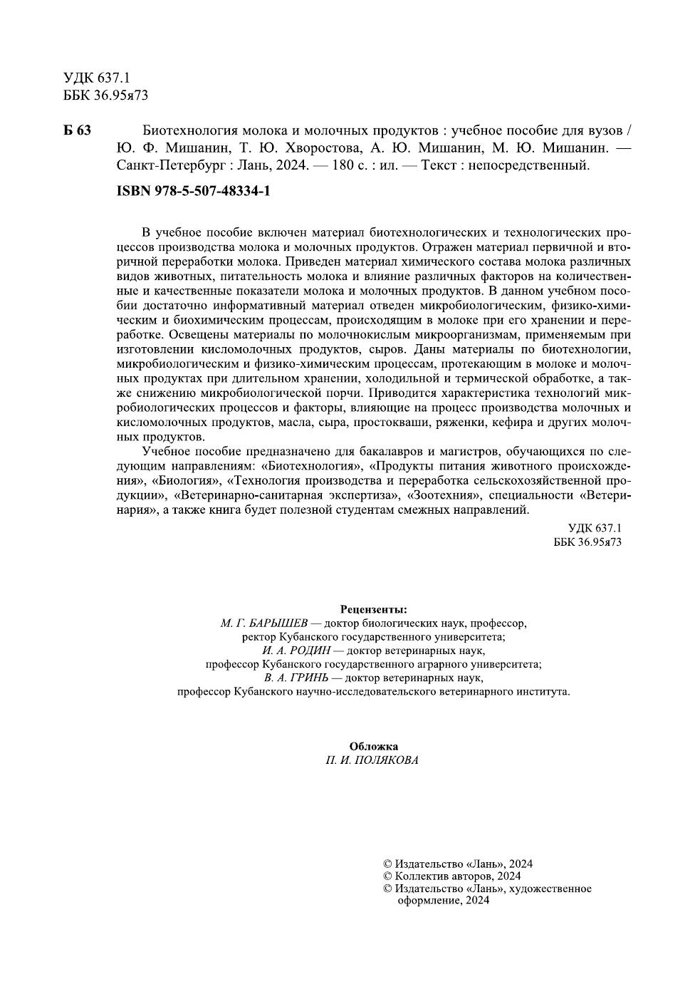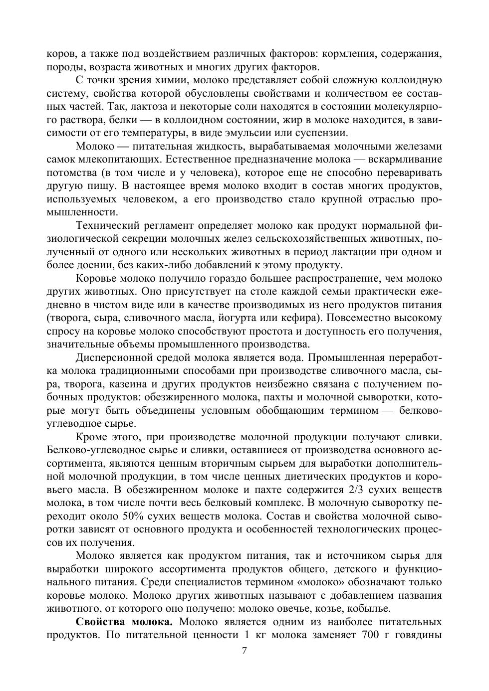 В учебное пособие включен материал биотехнологических и технологических процессов производства молока и молочных продуктов. Отражен материал первичной и вторичной переработки молока. Приведен материал химического состава молока различных видов животных, питательность молока и влияние различных факторов на количественные и качественные показатели молока и молочных продуктов. В данном учебном пособии достаточно информативный материал отведен микробиологиче-ским, физико-хими-ческим и биохимическим процессам, происходящим в молоке при его хранении и переработке. Освещены материалы по молочнокислым микроорганиз-мам, применяемым при изготовлении кисломолочных продуктов, сыров. Даны мате-риалы по биотехнологии, микробиологическим и физико-химическим процессам, про-текающим в молоке и молочных продуктах при длительном хранении, холодильной и термической обработке, а также снижению микробиологической порчи. Приводится характеристика технологий микробиологических процессов и факторы, влияющие на процесс производства молочных и кисломолочных продуктов, масла, сыра, просто-кваши, ряженки, кефира и других молочных продуктов. Учебное пособие предназначено для бакалавров и магистров, обучающихся по следующим направлениям: «Биотехнология», «Продукты питания животного проис-хождения», «Биология», «Технология производства и переработка сельскохозяйствен-ной продукции», «Ветеринарно-санитарная экспертиза», «Зоотехния», специальности «Ветеринария», а также книга будет полезной студентам смежных направлений.