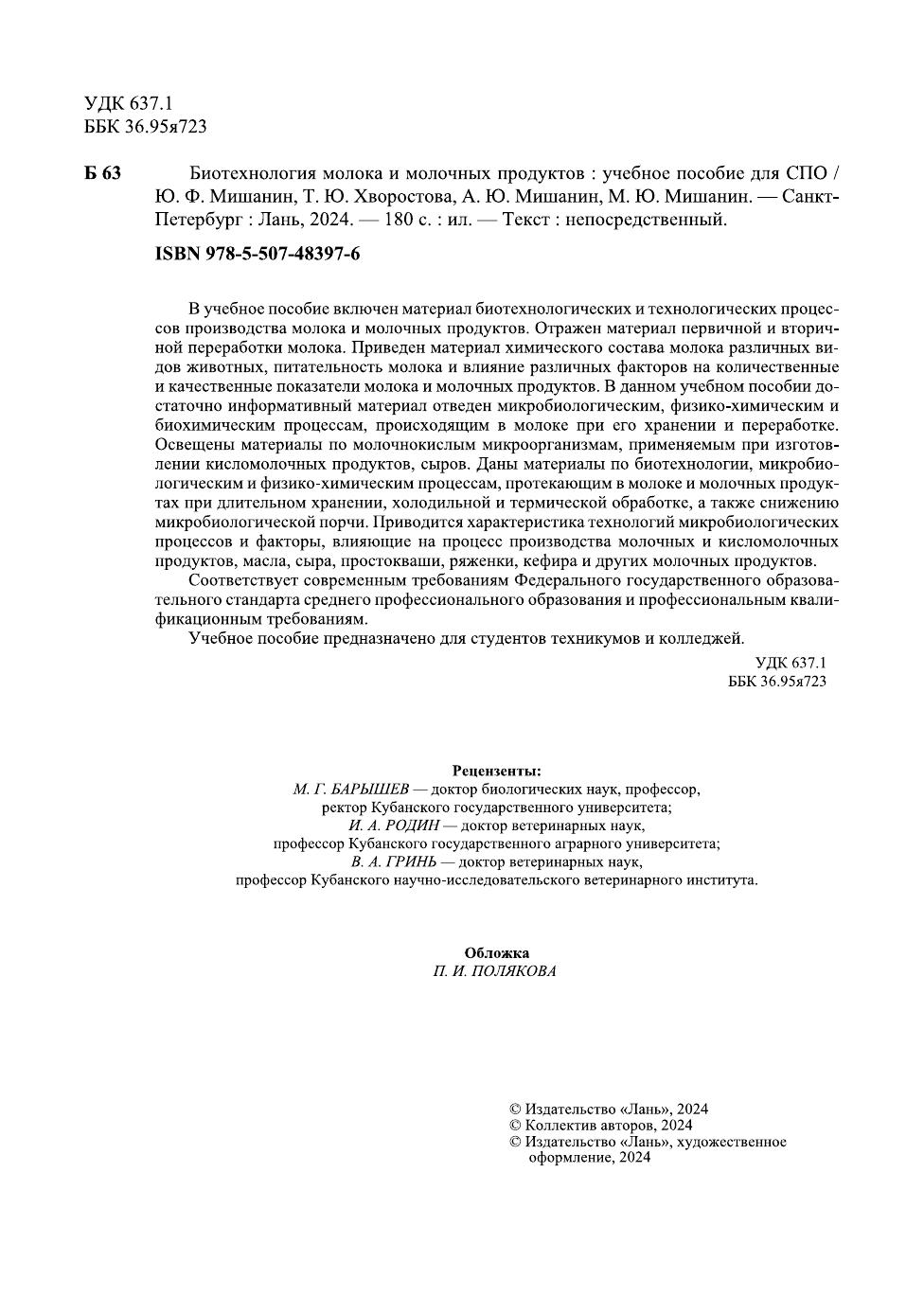 В учебное пособие включен материал биотехнологических и технологических процессов производства молока и молочных продуктов. Отражен материал первичной и вторичной переработки молока. Приведен материал химического состава молока различных видов животных, питательность молока и влияние различных факторов на количественные и качественные показатели молока и молочных продуктов. В данном учебном пособии достаточно информативный материал отведен микробиологиче-ским, физико-химическим и биохимическим процессам, происходящим в молоке при его хранении и переработке. Освещены материалы по молочнокислым микроорганиз-мам, применяемым при изготовлении кисломолочных продуктов, сыров. Даны мате-риалы по биотехнологии, микробиологическим и физико-химическим процессам, про-текающим в молоке и молочных продуктах при длительном хранении, холодильной и термической обработке, а также снижению микробиологической порчи. Приводится характеристика технологий микробиологических процессов и факторы, влияющие на процесс производства молочных и кисломолочных продуктов, масла, сыра, просто-кваши, ряженки, кефира и других молочных продуктов. Соответствует современным требованиям Федерального государственного обра-зовательного стандарта среднего профессионального образования и профессиональ-ным квалификационным требованиям. Учебное пособие предназначено для студентов техникумов и колледжей
