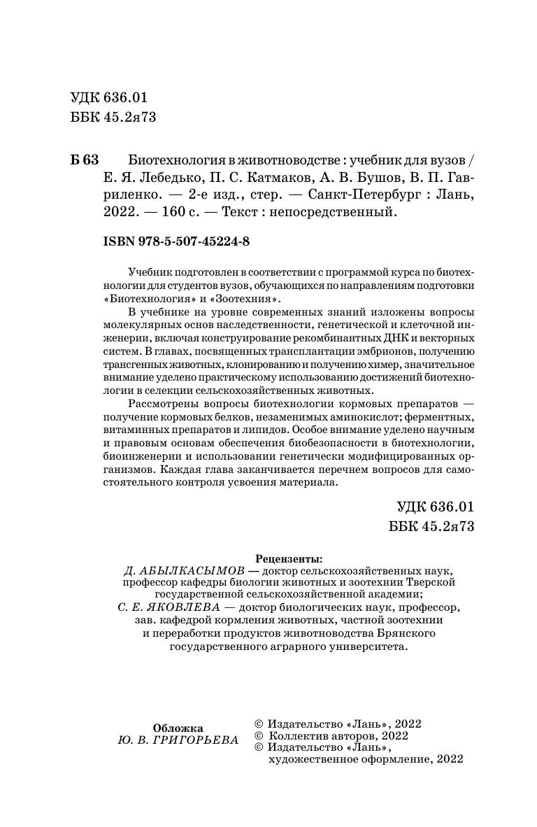 В учебнике на уровне современных знаний изложены вопросы молекулярных основ наследственности, генетической и клеточной инженерии, включая конструирование рекомбинантных ДНК и векторных систем. В главах, посвященных трансплантации эмбрионов, получению трансгенных животных, клонированию и получению химер, значительное внимание уделено практическому использованию достижений биотехнологии в селекции сельскохозяйственных животных.