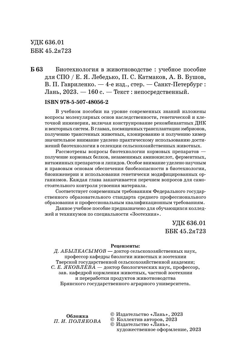 В учебном пособии на уровне современных знаний изложены вопросы молекулярных основ наследственности, генетической и клеточной инженерии, включая конструирование рекомбинантных ДНК и векторных систем. В главах, посвященных трансплантации эмбрионов, получению трансгенных животных, клонированию и получению химер значительное внимание уделено практическому использованию достижений биотехнологии в селекции сельскохозяйственных животных.Рассмотрены вопросы биотехнологии кормовых препаратов — получение кормовых белков, незаменимых аминокислот, ферментных, витаминных препаратов и липидов. Особое внимание уделено научным и правовым основам обеспечения биобезопасности в биотехнологии, биоинженерии и использования генетически модифицированных организмов. Каждая глава заканчивается перечнем вопросов для самостоятельного контроля усвоения материала. Соответствует современным требованиям Федерального государственного образовательного стандарта среднего профессионального образования и профессиональным квалификационным требованиям. Данное учебное пособие предназначено для обучающихся колледжей и техникумов по специальности «Зоотехния».
