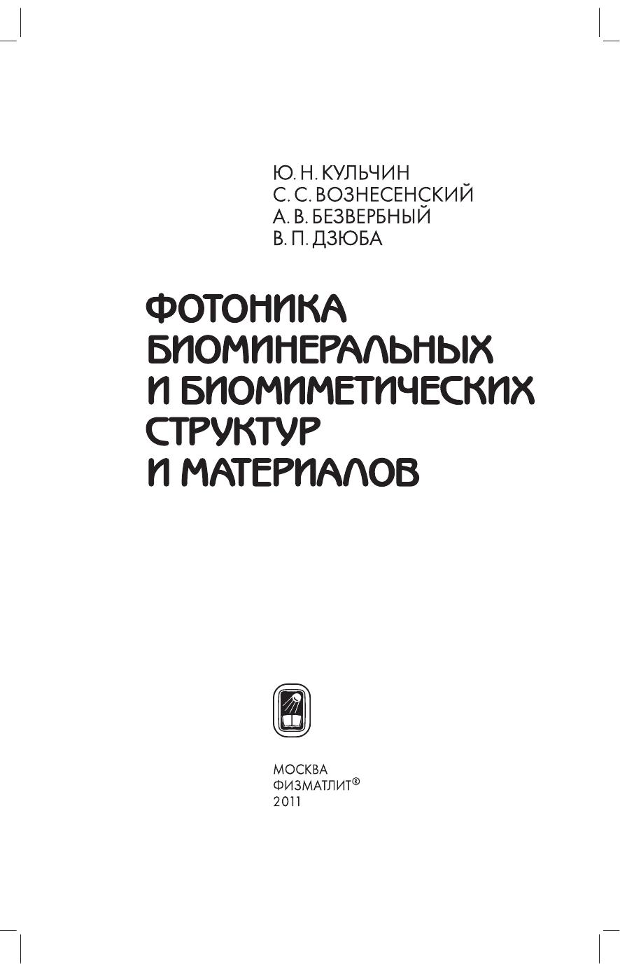 В настоящей работе представлены анализ текущего состояния, результаты комплексных исследований природных биоминералов и направления их биомиметического моделирования для получения новых нанокомпозитных структур и материалов с заданными свойствами и характеристиками. Книга обобщает многолетний труд авторов и позволяет с единых позиций взглянуть на проблемы биоминерализации в живой природе и поиск путей ее биомиметического моделирования применительно к перспективам развития такой многообещающей области исследований, какой является нано- и микрофотоника. Монография в равной степени может быть полезна как начинающим исследователям, так и специалистам, работающим в области биофизики, фотоники и нано- и биотехнологий.