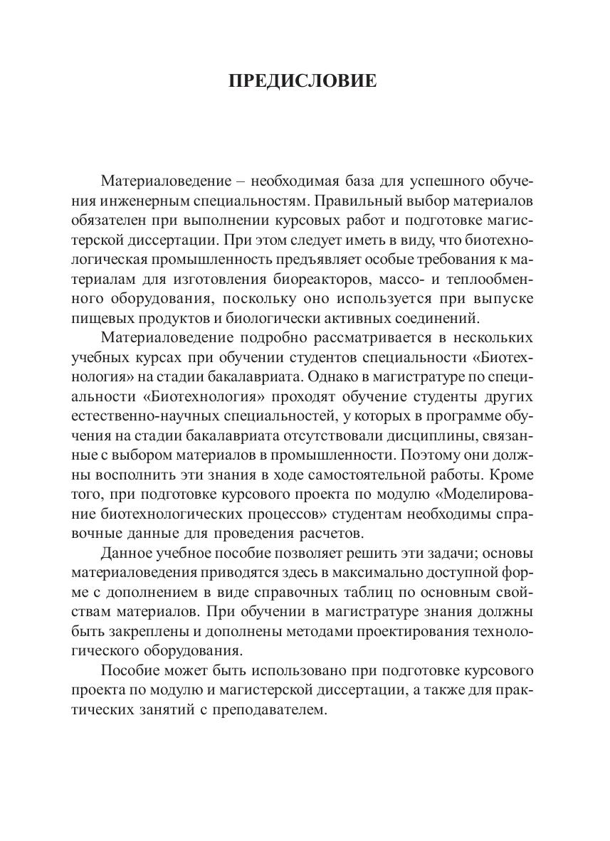 Учебно-методическое пособие включает теоретические разделы курса «Проектирование биотехнологических производств» о выборе материалов для биотехнологии, а также справочные данные о свойствах различных материалов. Пособие разделено на разделы, посвященные физическим, химическим и механическим свойствам материалов, а также критериям подбора материалов в биотехнологии. Приводятся классификация материалов, справочные таблицы, данные о коррозионной стойкости материалов и методы проведения механических испытаний. Адресовано студентам всех форм обучения. Может быть использовано для подготовки к практическим занятиям, а также для выполнения курсового проекта и сдачи зачета или экзамена по дисциплине «Проектирование биотехнологических производств».