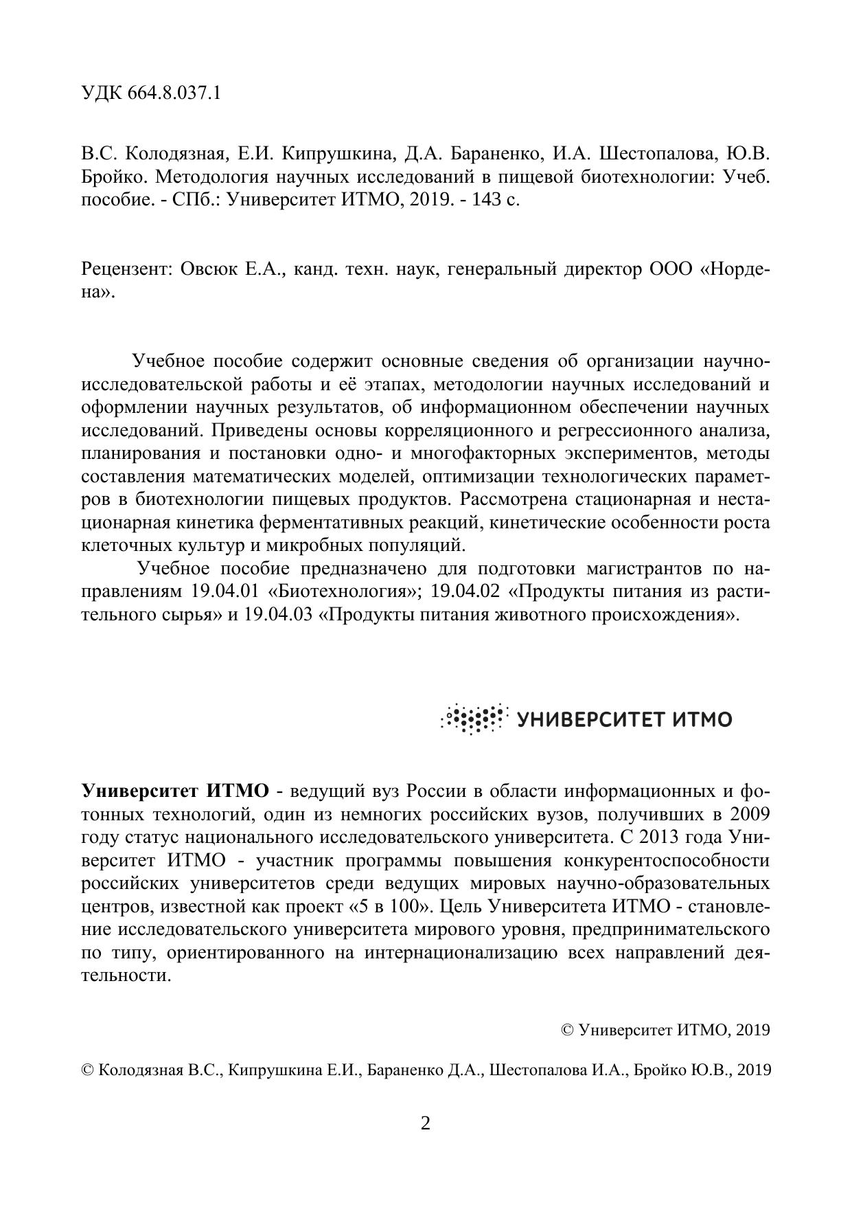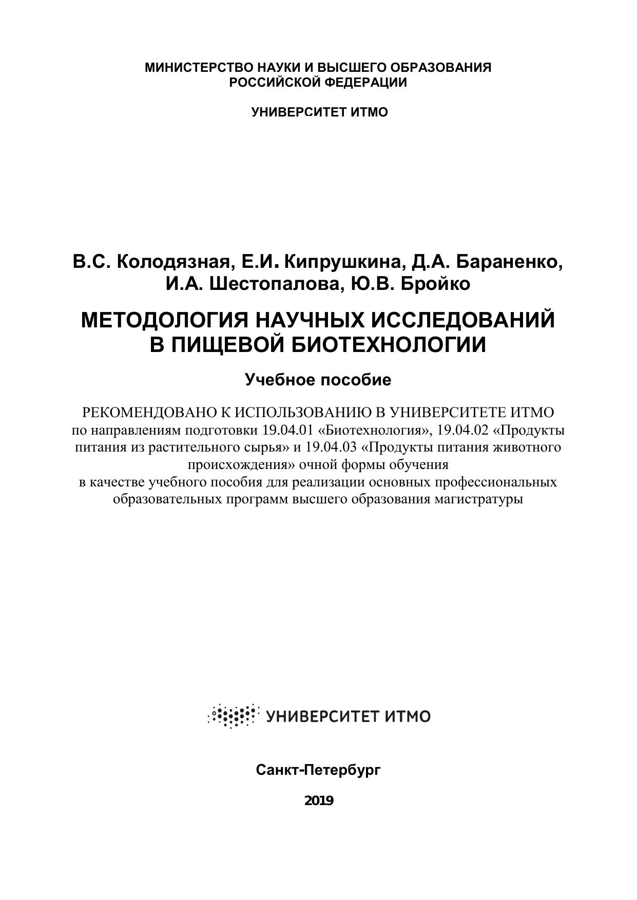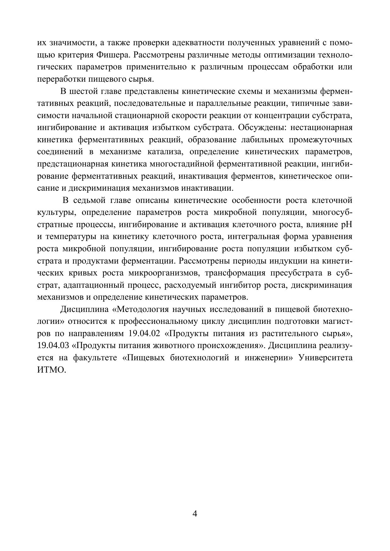 Учебное пособие содержит основные сведения об организации научноисследовательской работы и еѐ этапах, методологии научных исследований и оформлении научных результатов, об информационном обеспечении научных исследований. Приведены основы корреляционного и регрессионного анализа, планирования и постановки одно- и многофакторных экспериментов, методы составления математических моделей, оптимизации технологических параметров в биотехнологии пищевых продуктов. Рассмотрена стационарная и нестационарная кинетика ферментативных реакций, кинетические особенности роста клеточных культур и микробных популяций. Учебное пособие предназначено для подготовки магистрантов по направлениям 19.04.01 «Биотехнология»; 19.04.02 «Продукты питания из растительного сырья» и 19.04.03 «Продукты питания животного происхождения»