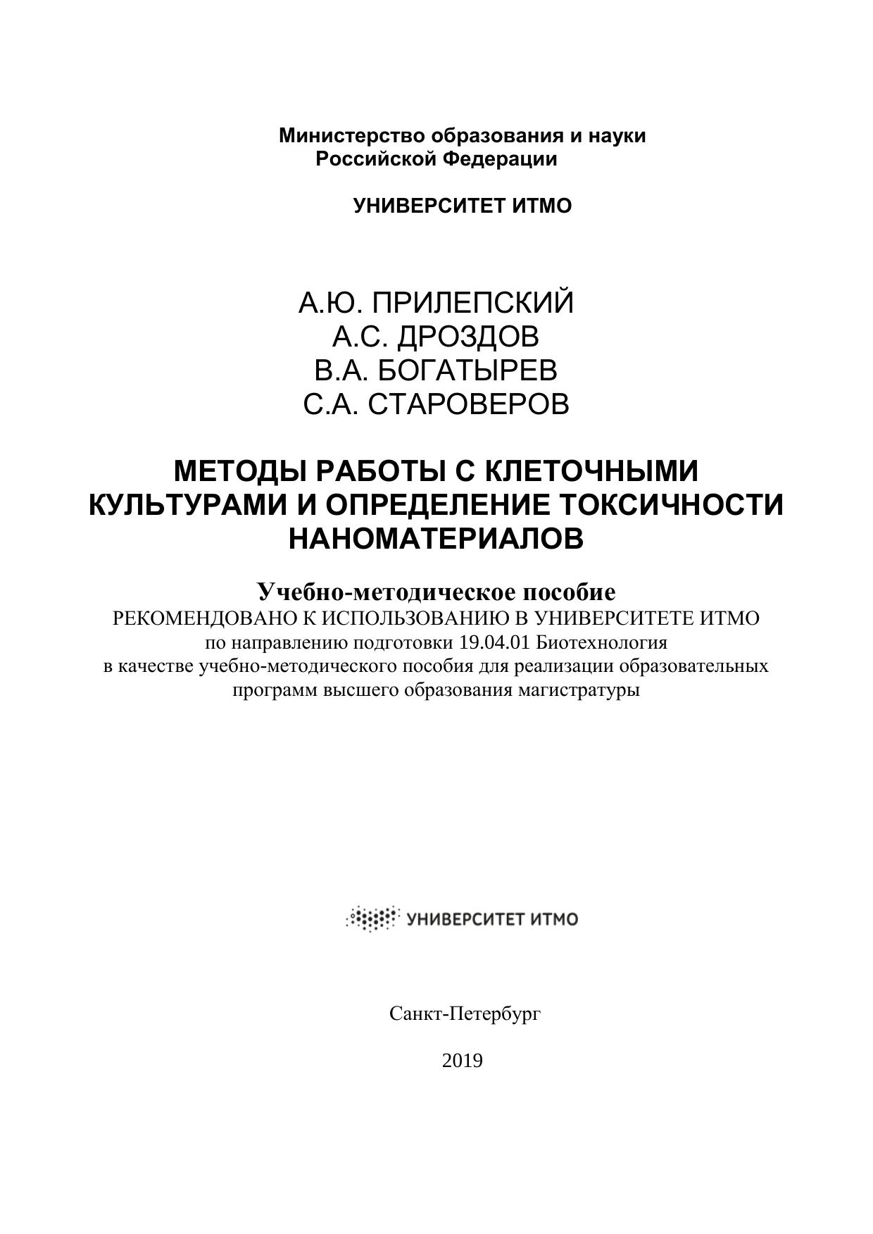 В пособии изложены основные методы работы с адгезионными животными клеточными культурами, приведены примеры определения цитотоксичности наночастиц с использованием оценки митохондриальной дыхательной активности (МТТ-теста), окраски флуоресцентными и абсорбционными красителями, дано описание необходимой лабораторной техники: ламинарного бокса, инкубатора, инвертированного микроскопа, счетчика клеток. Пособие направлено на выработку базовых навыков работы с клеточными культурами при проведении токсикологических экспериментов. Предназначено для студентов-магистрантов химико-биологического кластера Университета ИТМО, обучающихся по программе Молекулярная биология и биотехнология (дисциплина «Нанотоксикология» и «Перспективные материалы для биомедицинских применений»), а также может быть рекомендовано студентам естественно-научного профиля при выполнении ими ряда работ в специализированных практикумах