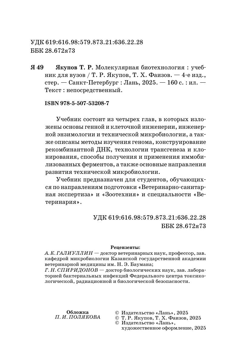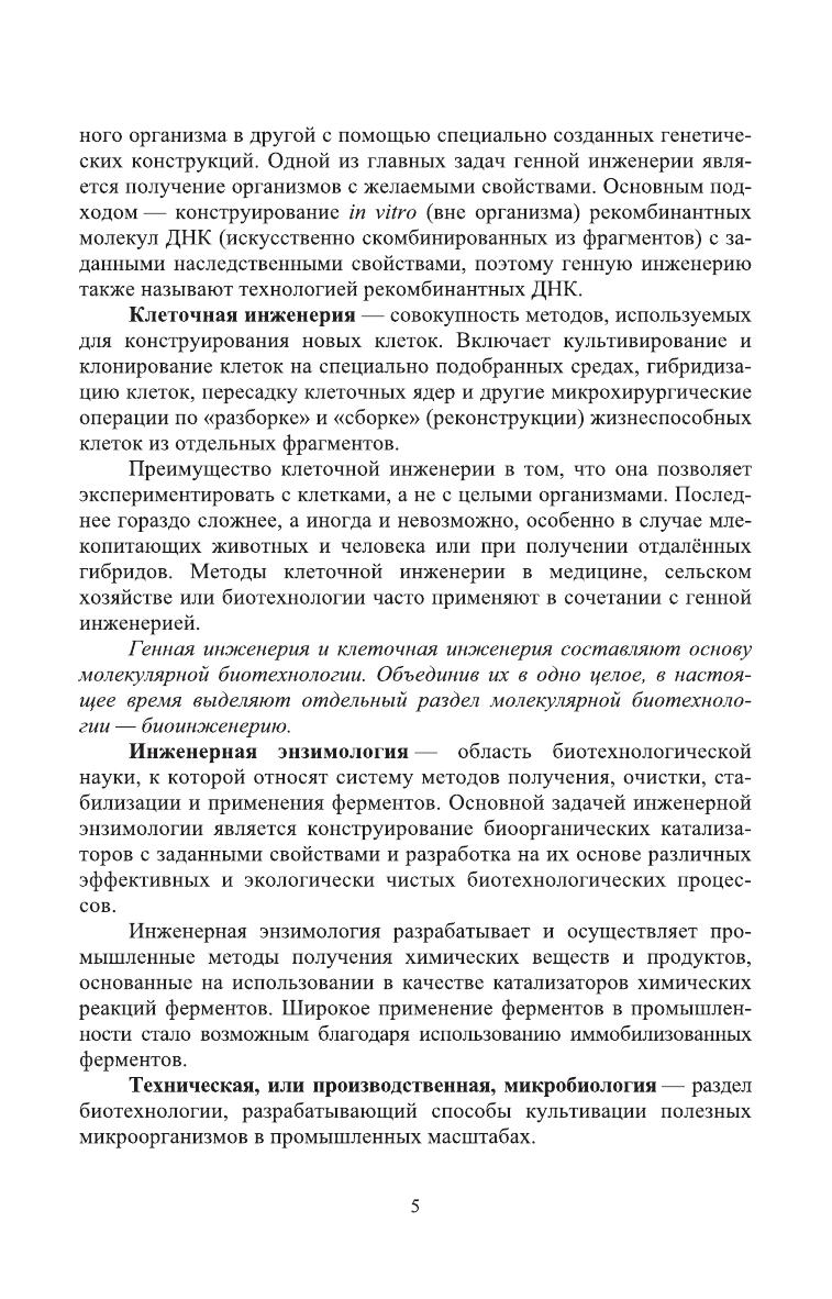 Учебник состоит из четырех глав, где изложены основы генной и клеточной инженерии, инженерной энзимологии и технической микробиологии. Описаны методы изучения генома, конструирование рекомбинантной ДНК, технологии трансгенеза и клонирования, способы получения и применения иммобилизованных ферментов, а также основные направления развития технической микробиологии. Учебник предназначен для студентов, обучающихся по направлениям подготовки «Ветеринарно-санитарная экспертиза», «Зоотехния» и специальности «Ветеринария».