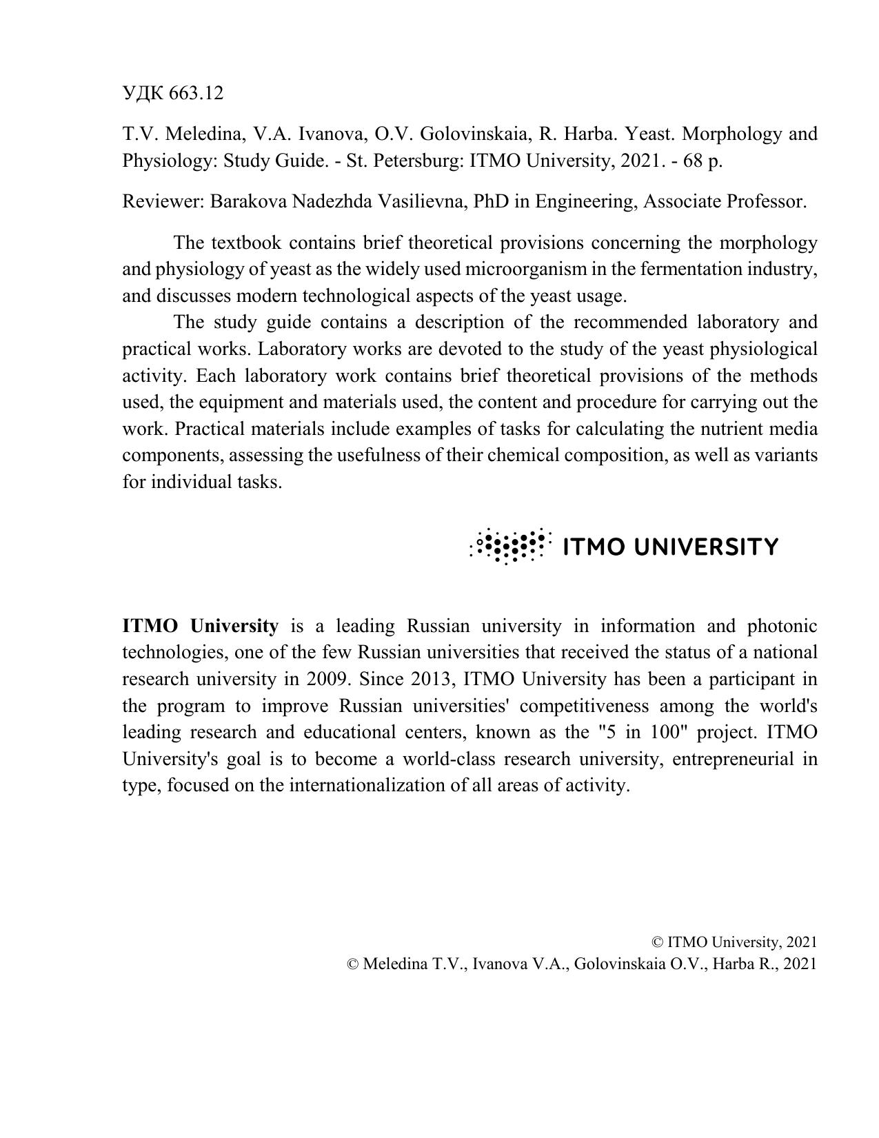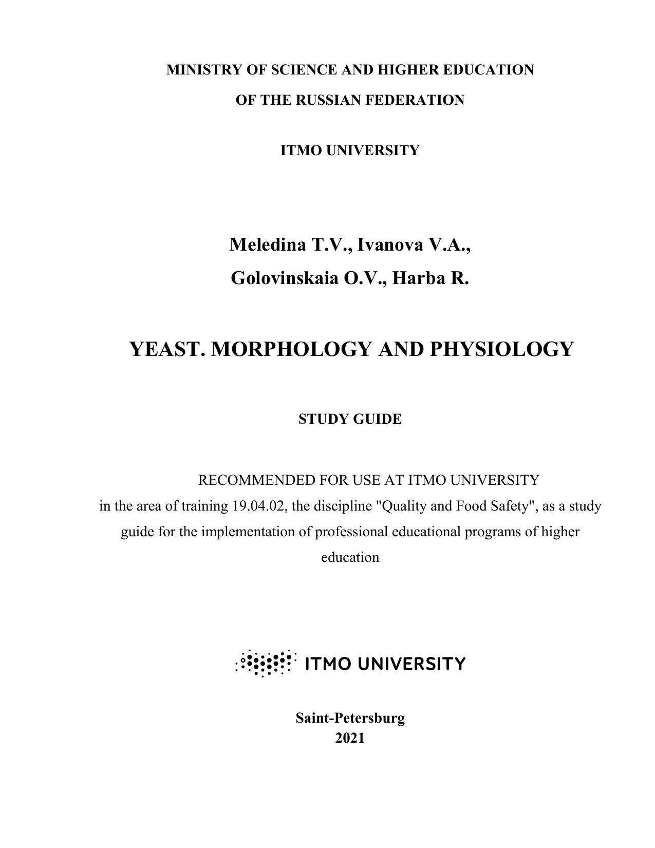 The study guide contains a description of the recommended laboratory and practical works. Laboratory works are devoted to the study of the yeast physiological activity. Each laboratory work contains brief theoretical provisions of the methods used, the equipment and materials used, the content and procedure for carrying out the work. Practical materials include examples of tasks for calculating the nutrient media components, assessing the usefulness of their chemical composition, as well as variants for individual tasks.